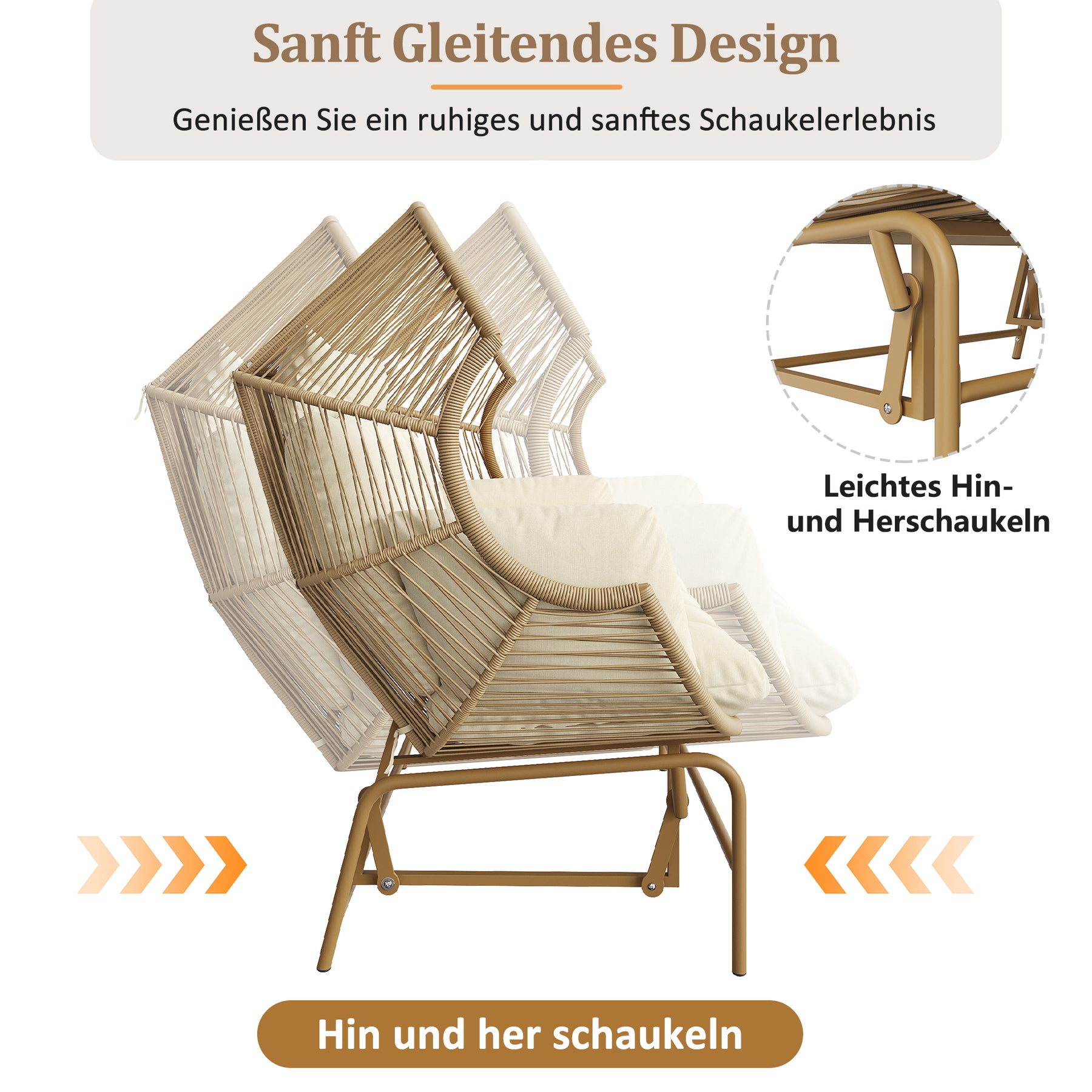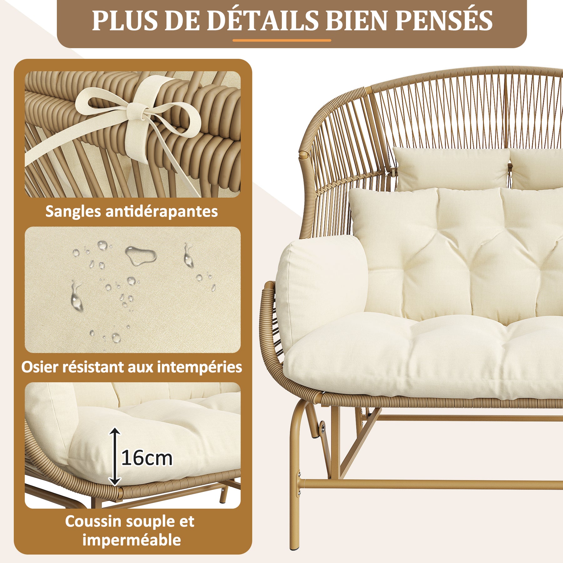 - Sécurité et stabilité : La structure solide et les attaches de coussin ingénieuses assurent une stabilité parfaite lors du balancement, pour une expérience relaxante en toute confiance, sans glissement ni basculement.