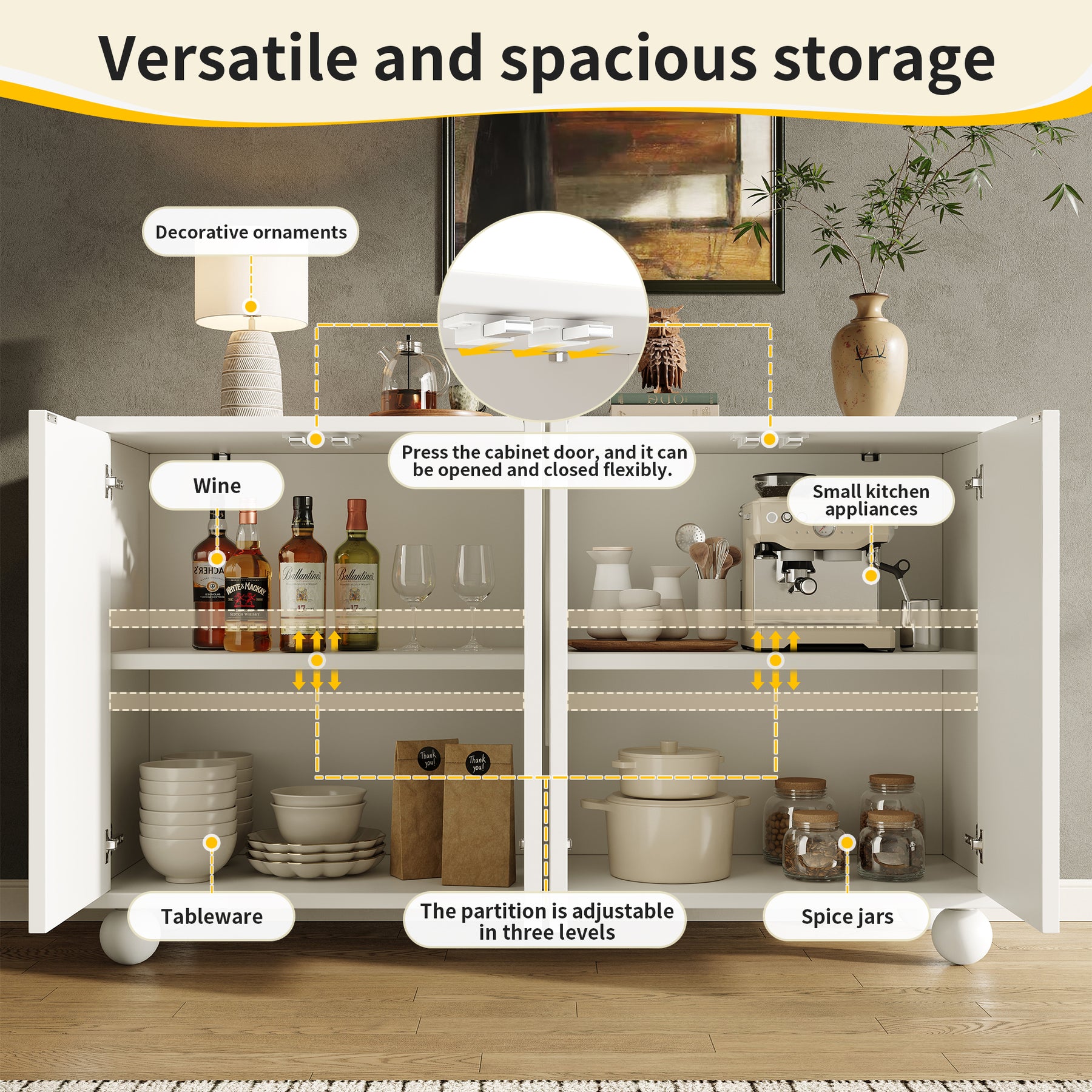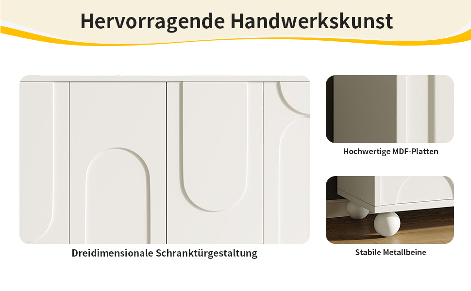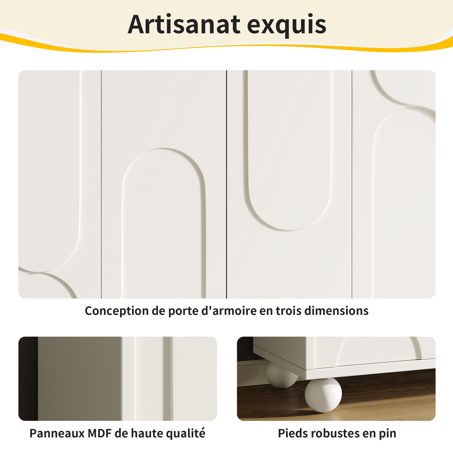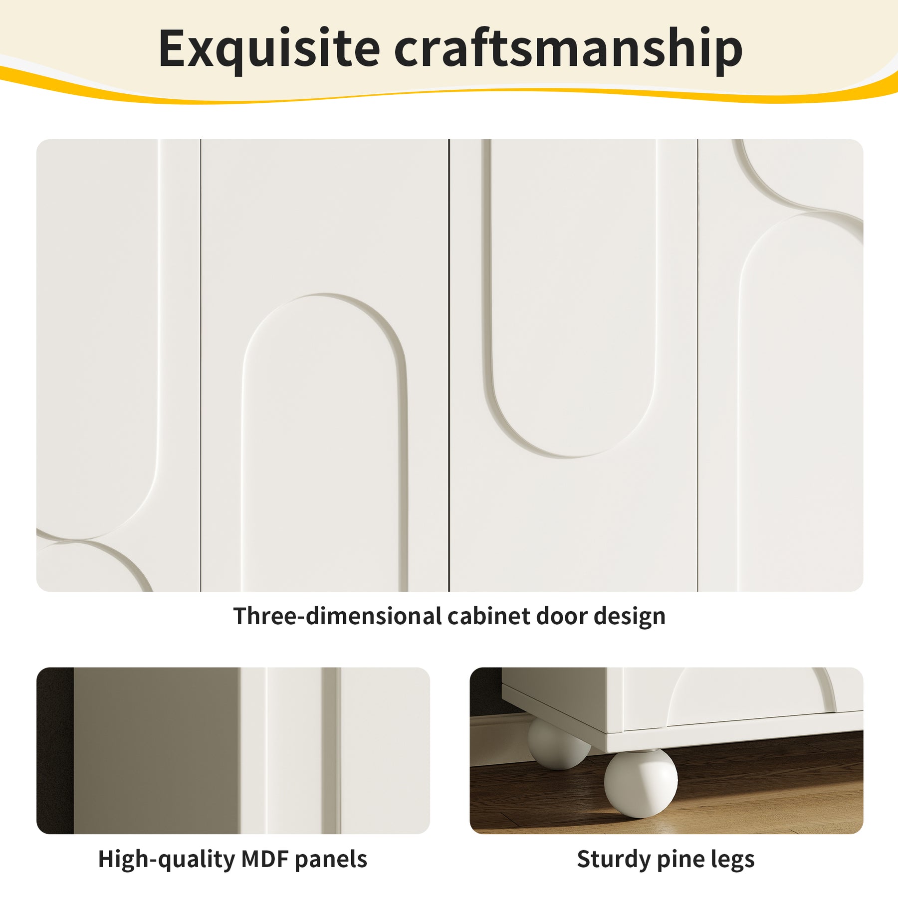 - Design moderne et finitions soignées : Portes crème à motif unique, pieds en pin massif et fermeture douce pour un style contemporain et une utilisation silencieuse.