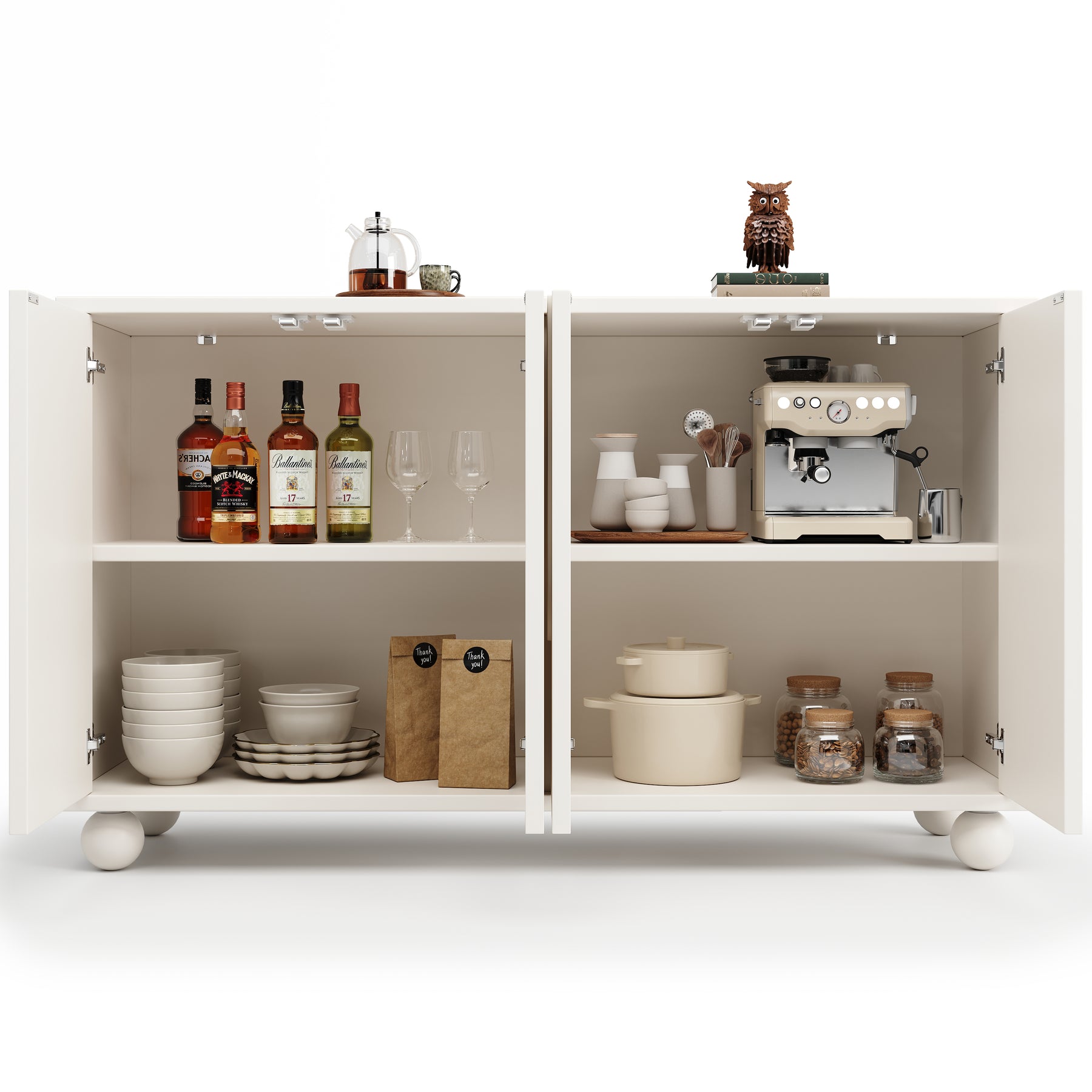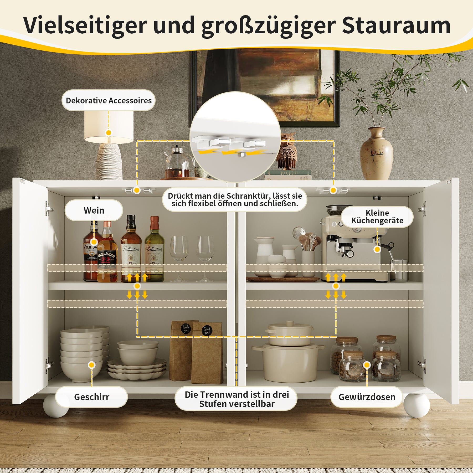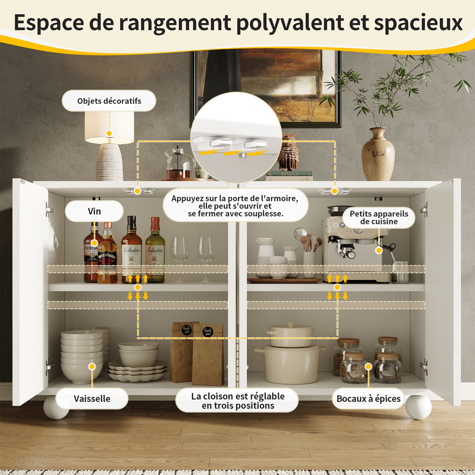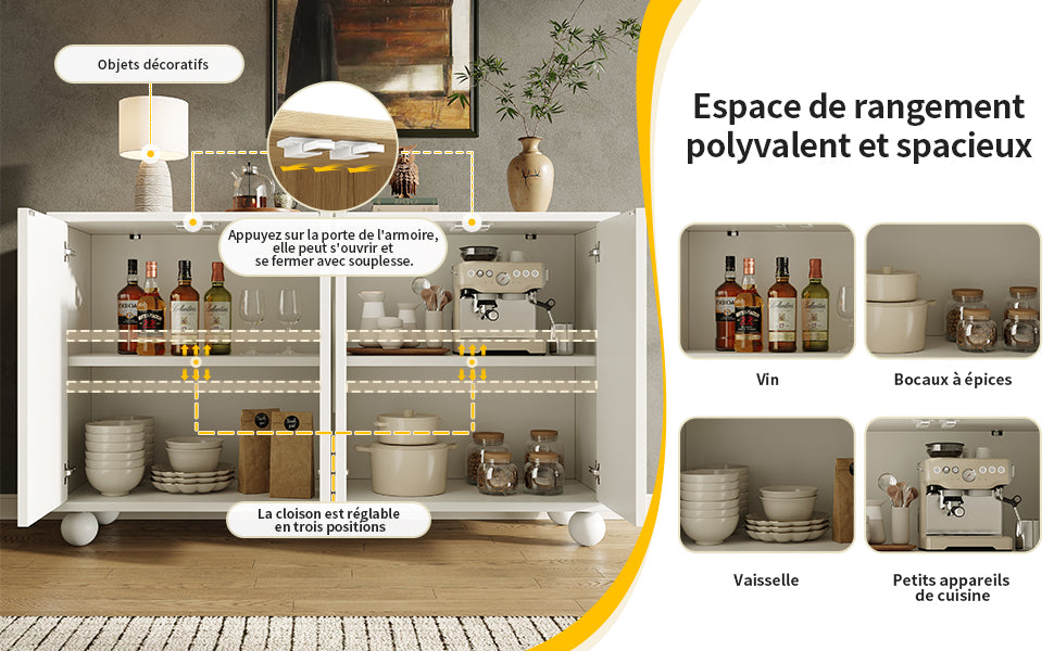 - Grande capacité de rangement polyvalente : Organisez facilement vaisselle, verres, électroménager ou objets déco grâce à un vaste espace intérieur et une surface supérieure optimisée.
