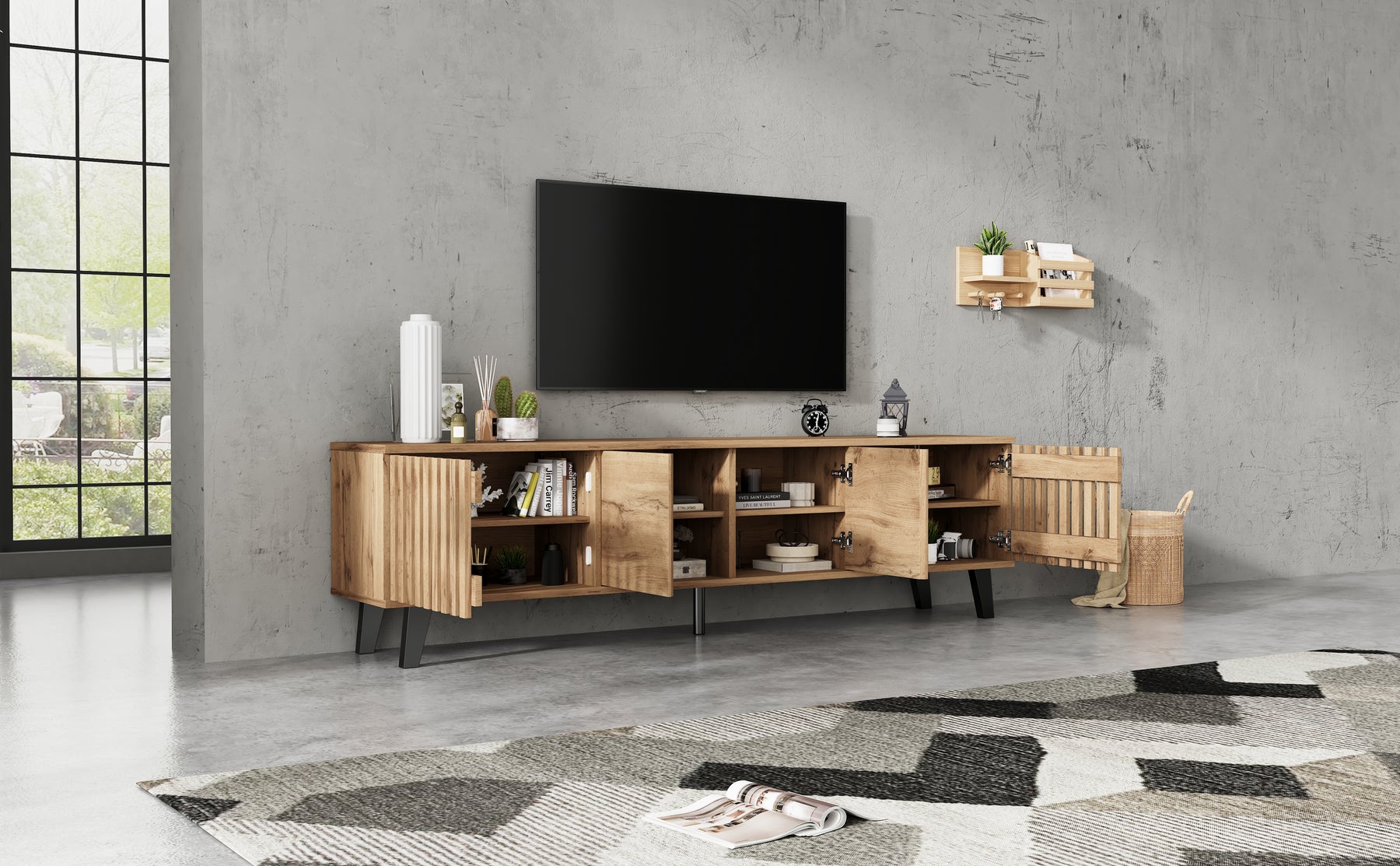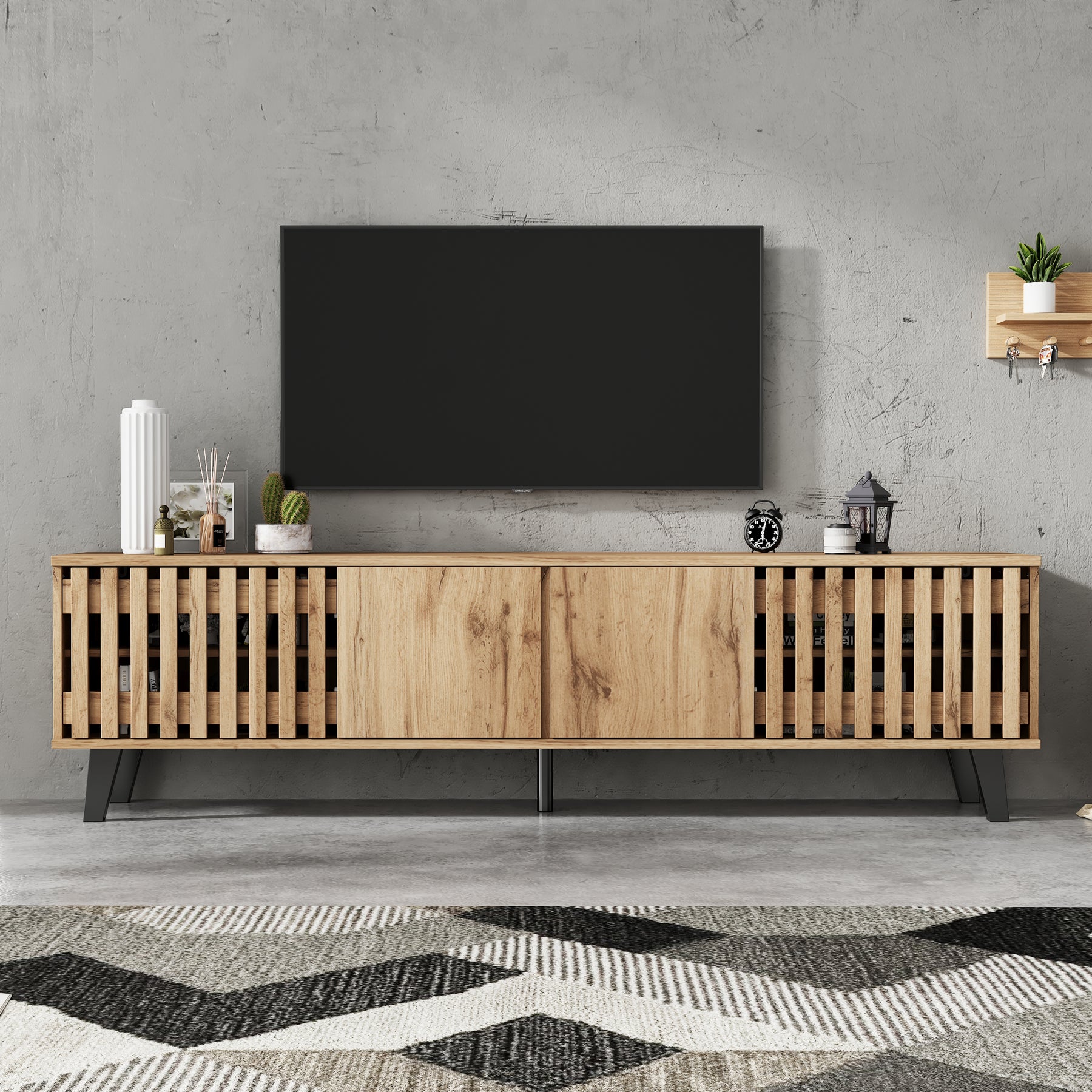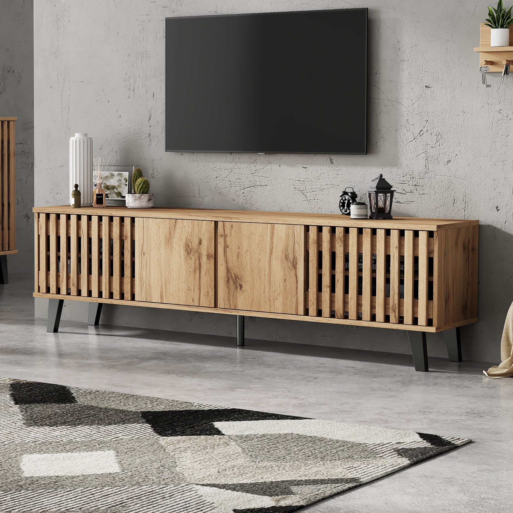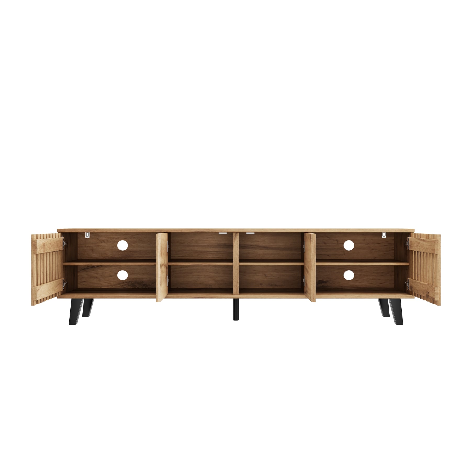 - Design innovant et ventilation intelligente : Les portes latérales ajourées assurent une excellente circulation de l’air pour vos équipements électroniques, tandis que les portes centrales pleines dissimulent habilement les câbles et accessoires, pour un rendu toujours impeccable.