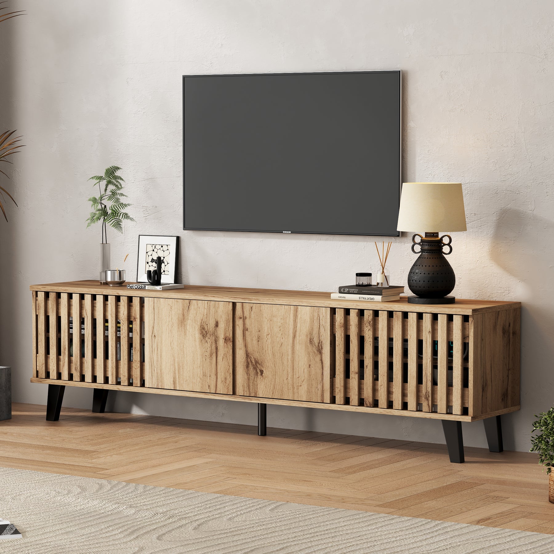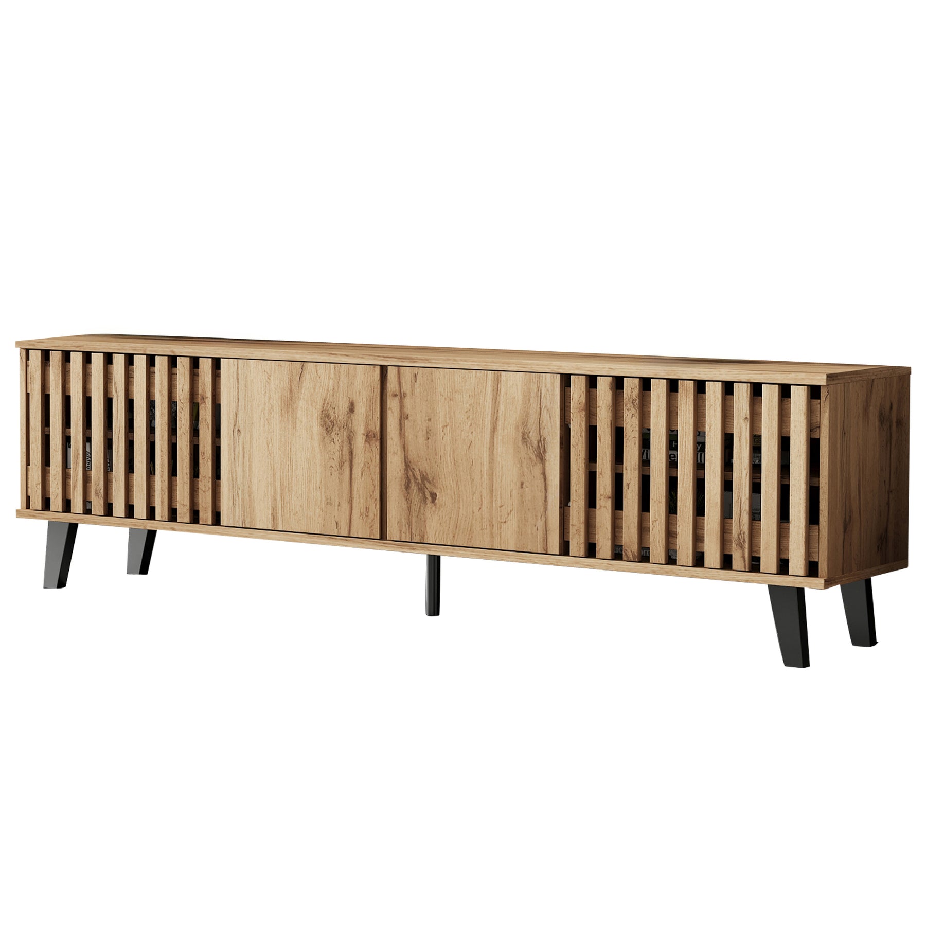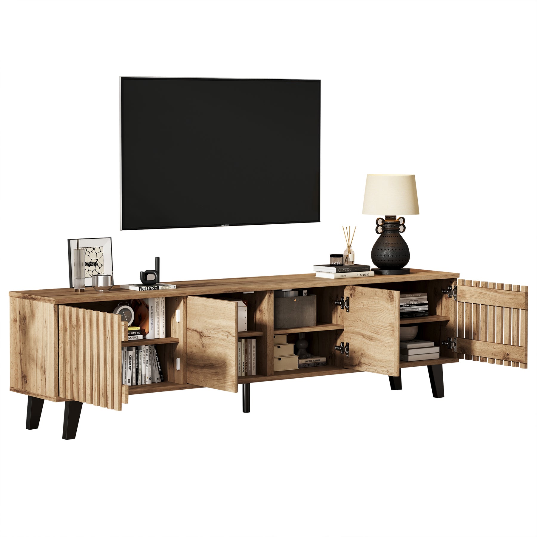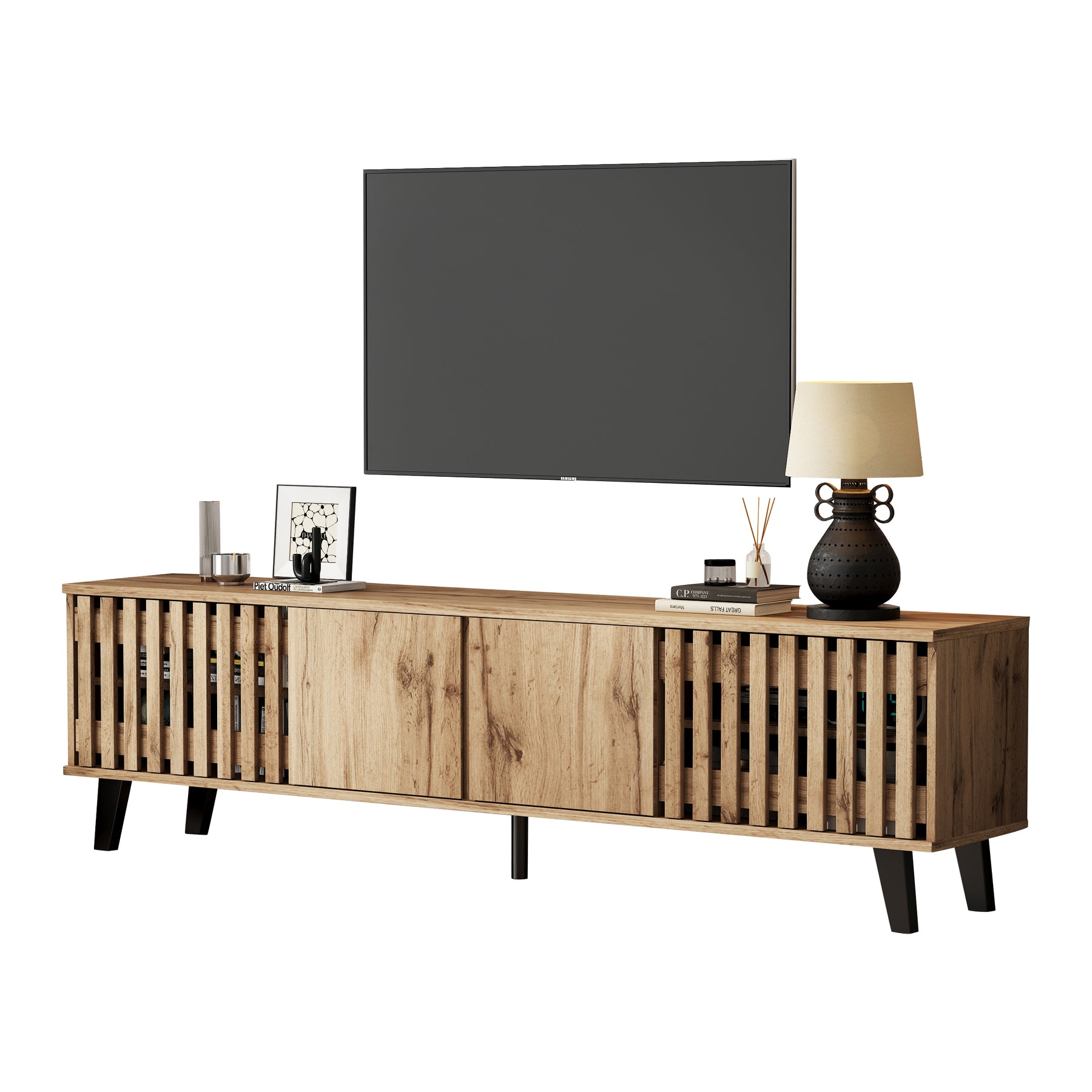 - Design innovant et ventilation intelligente : Les portes latérales ajourées assurent une excellente circulation de l’air pour vos équipements électroniques, tandis que les portes centrales pleines dissimulent habilement les câbles et accessoires, pour un rendu toujours impeccable.