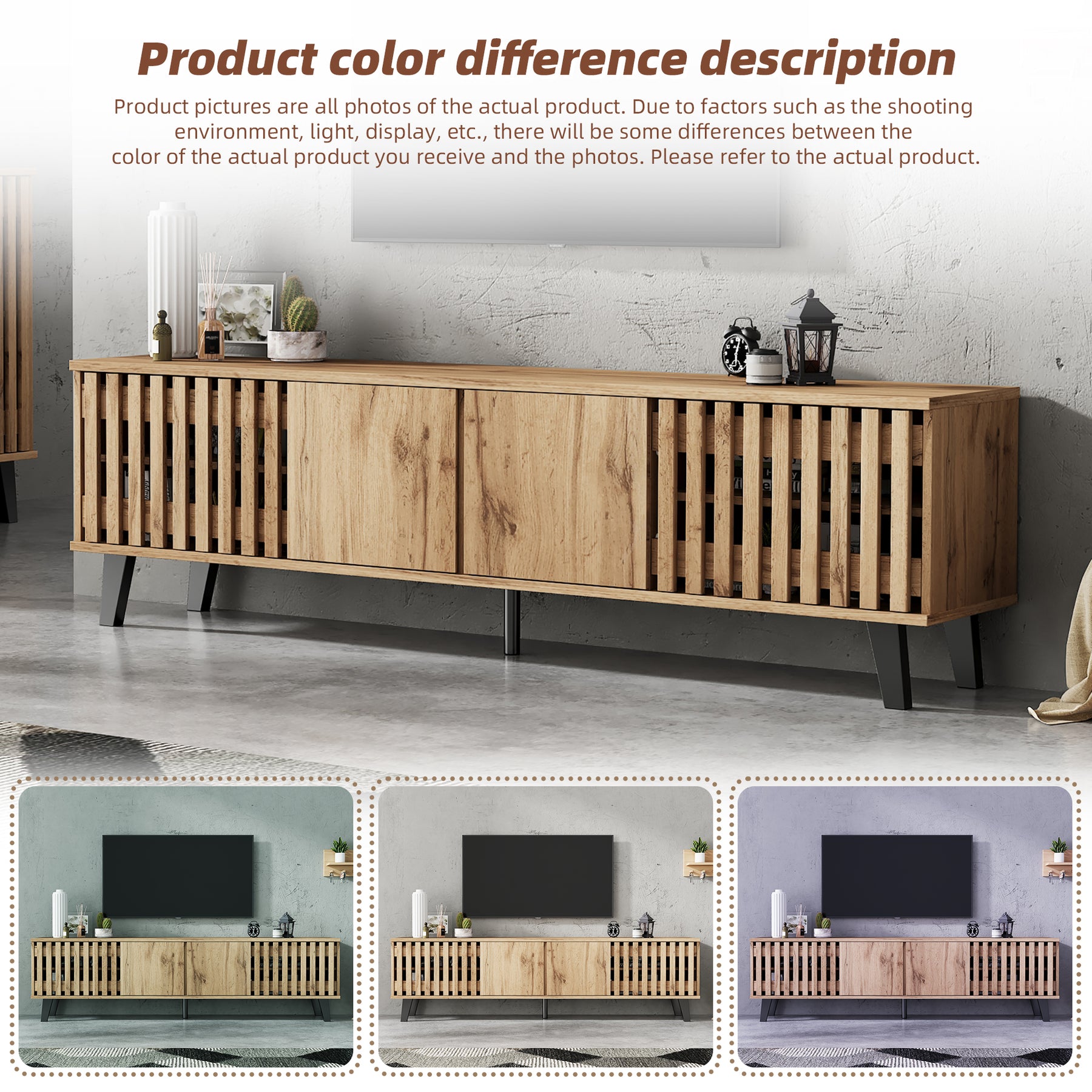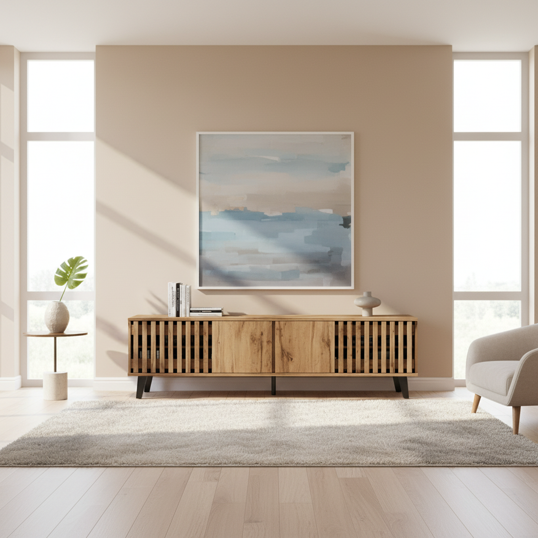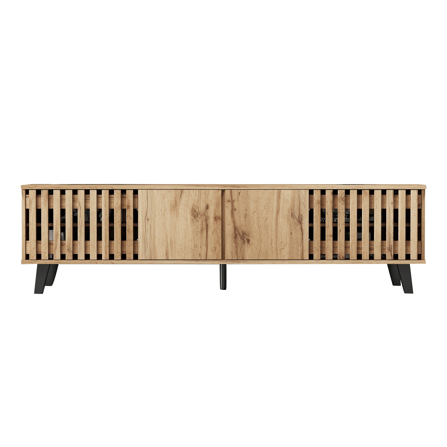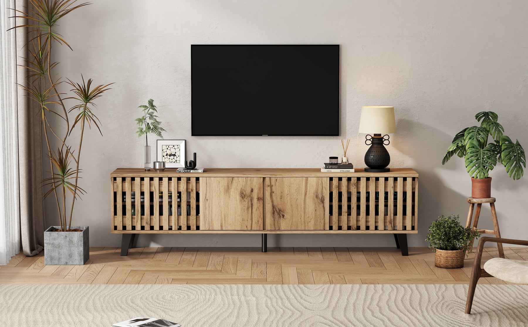 - Design innovant et ventilation intelligente : Les portes latérales ajourées assurent une excellente circulation de l’air pour vos équipements électroniques, tandis que les portes centrales pleines dissimulent habilement les câbles et accessoires, pour un rendu toujours impeccable.
