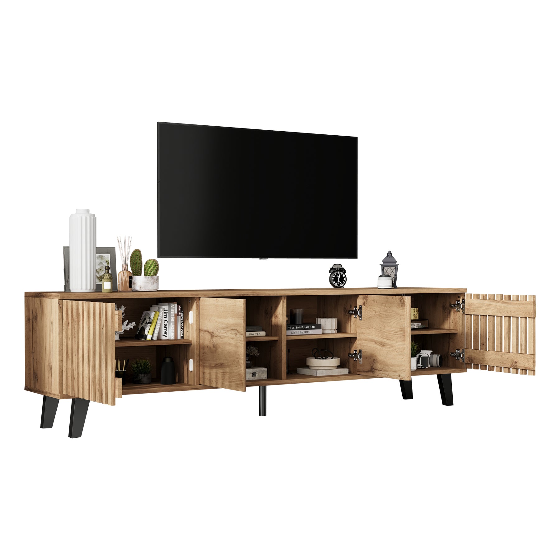 - Grande capacité de rangement et organisation optimale : Grâce à ses 8 compartiments séparés et sa plateforme ouverte, ce meuble TV offre un espace dédié pour chaque appareil, accessoire ou objet du quotidien. Fini le désordre, chaque chose trouve sa place.