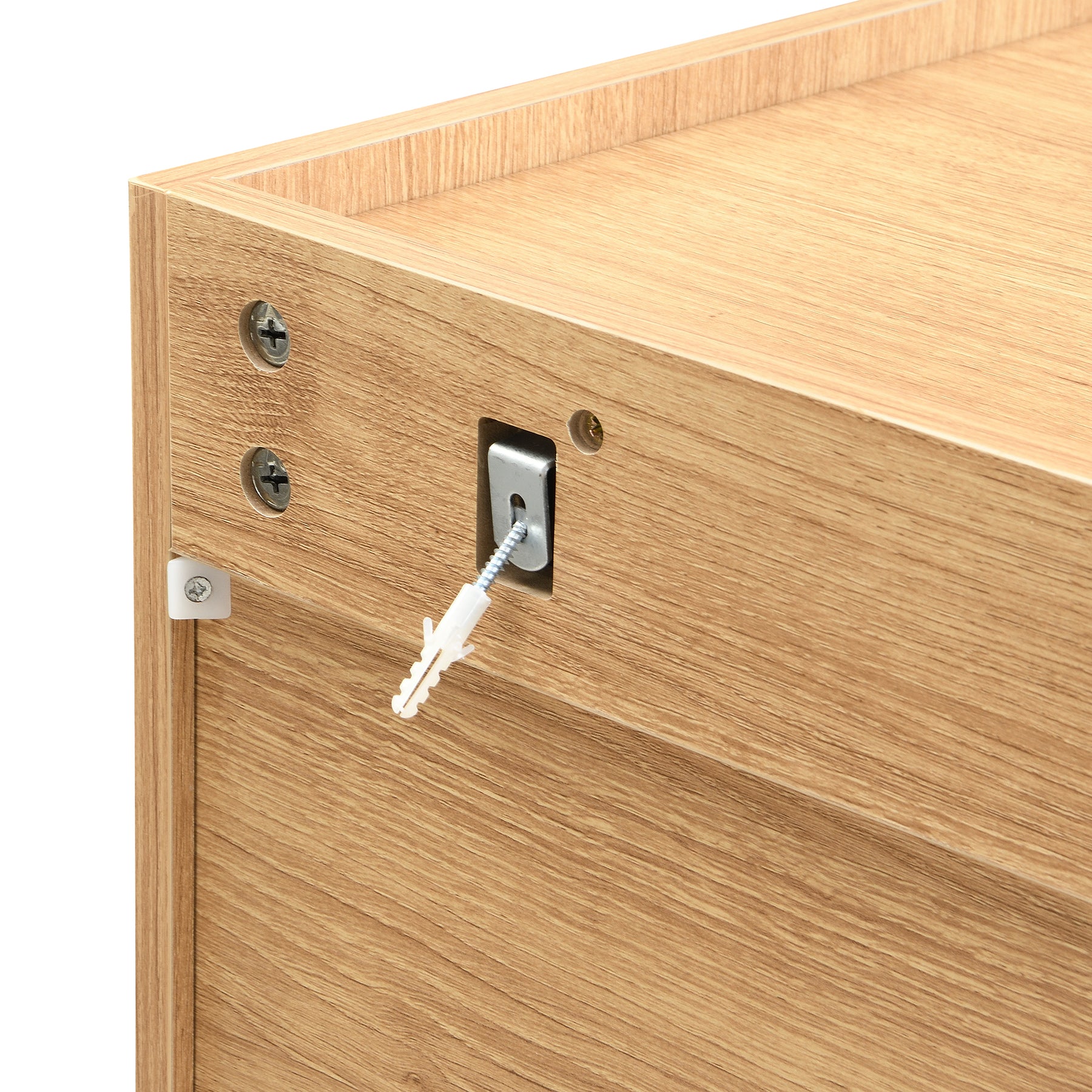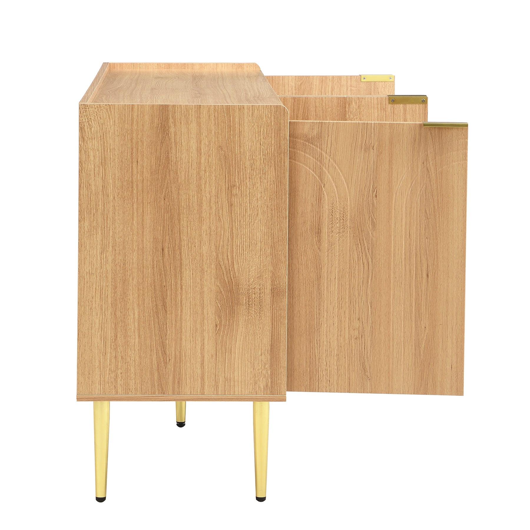 Ce buffet allie avec brio l'élégance moderne et le charme naturel du bois, créant une pièce d'accent luxueuse pour votre salon ou salle à manger. Sa finition en bois naturel est sublimée par des portes à motifs géométriques arqués et des touches dorées, notamment les poignées allongées et les pieds effilés en métal. Ce design sophistiqué crée une ambiance moderne et discrètement luxueuse. Avec quatre portes s'ouvrant sur un intérieur spacieux, le meuble offre un rangement généreux et flexible grâce à des étagères réglables, ce qui en fait une solution idéale pour organiser la vaisselle, les médias ou les articles de salon.