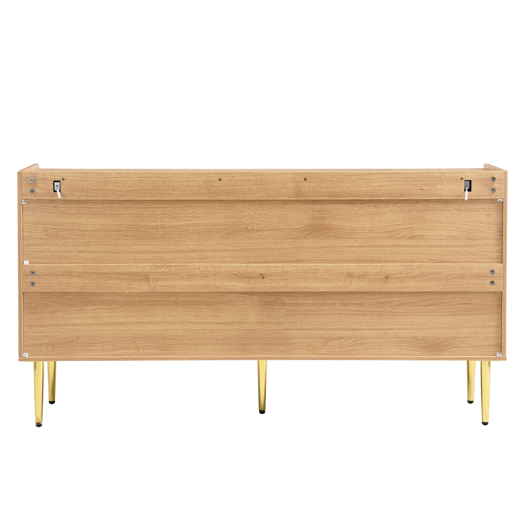 Design de luxe moderne : combine le grain de bois naturel avec des accents dorés (pieds et poignées) pour créer une atmosphère de luxe moderne, subtile et captivante.