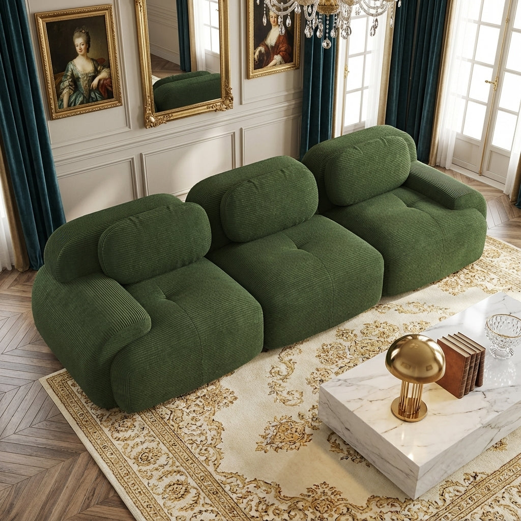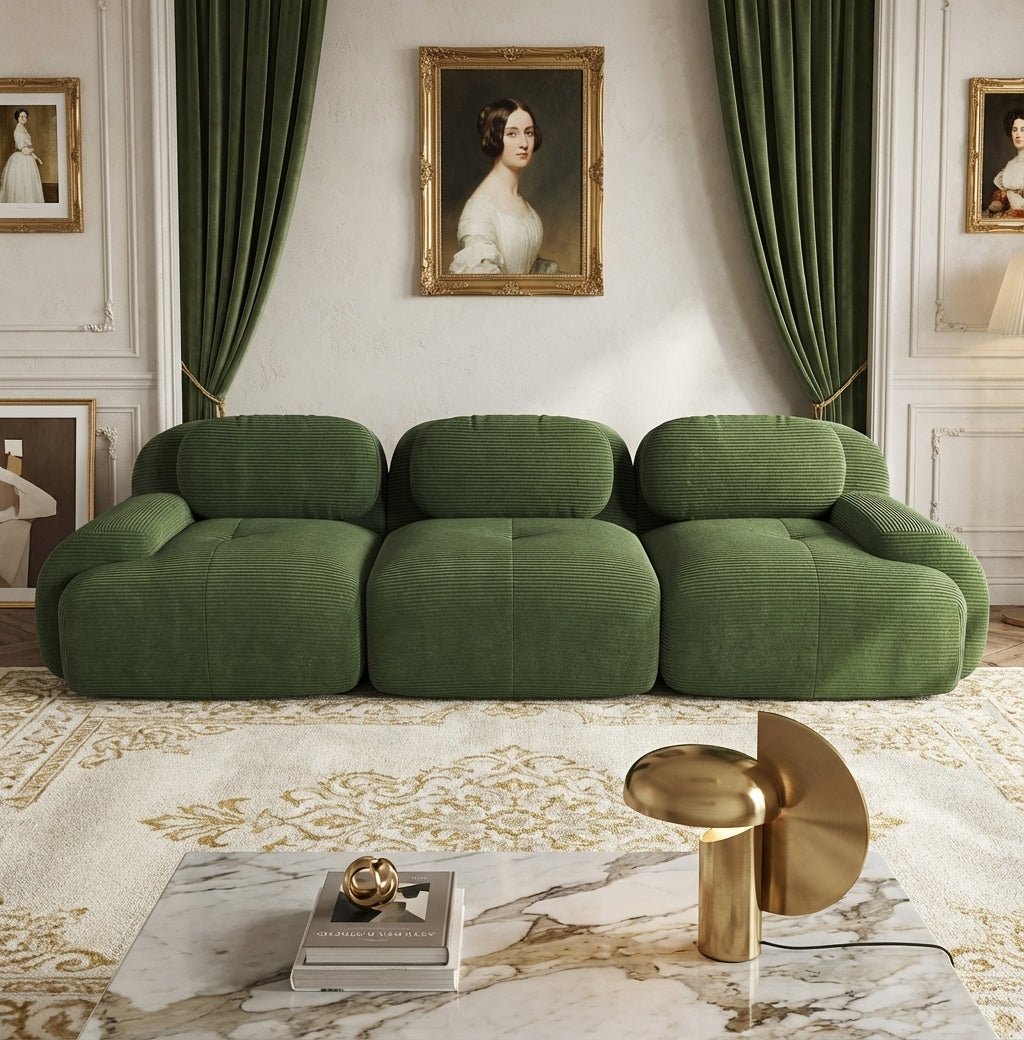 Ce grand canapé trois places en velours côtelé vert allie une élégance intemporelle à une flexibilité moderne pour sublimer votre intérieur. grâce à sa conception modulaire et son revêtement d'une douceur exceptionnelle, il offre un espace de détente généreux et luxueux sans aucune contrainte de montage. sa structure pensée pour le bien-être intègre des matériaux de haute qualité et une base sécurisée, créant un environnement serein et confortable pour toute la famille dans votre salon ou votre chambre.