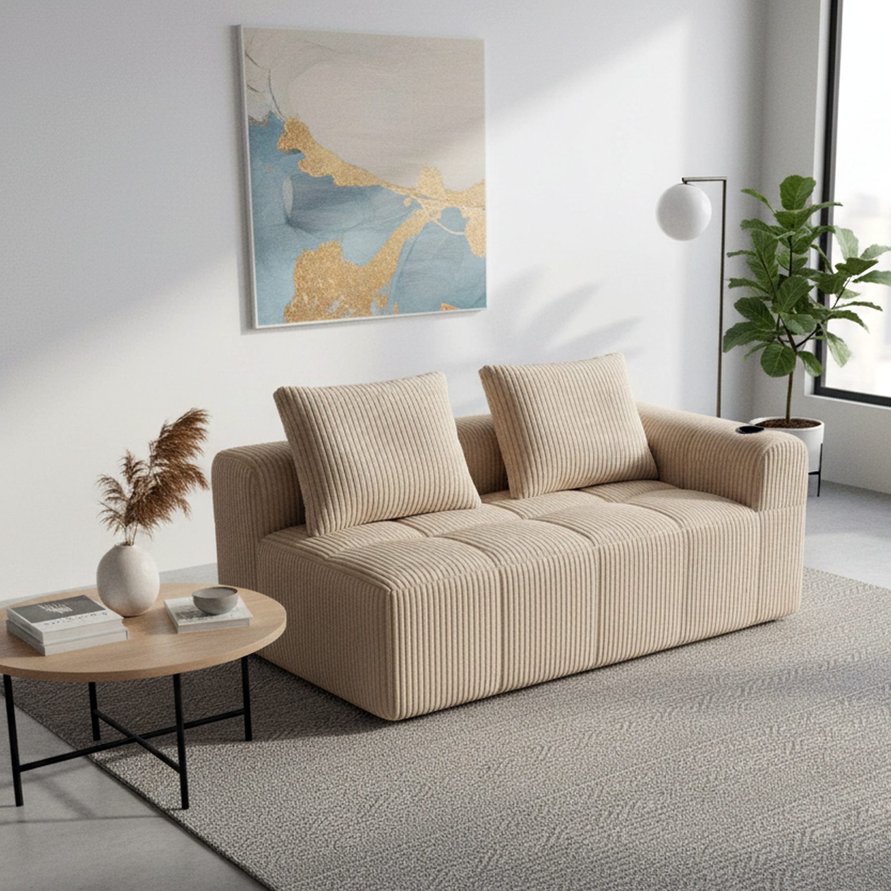 Canapé 2 places confortable en velours côtelé beige sans montage avec porte-gobelet et poches latérales ARCTURUSPOINT