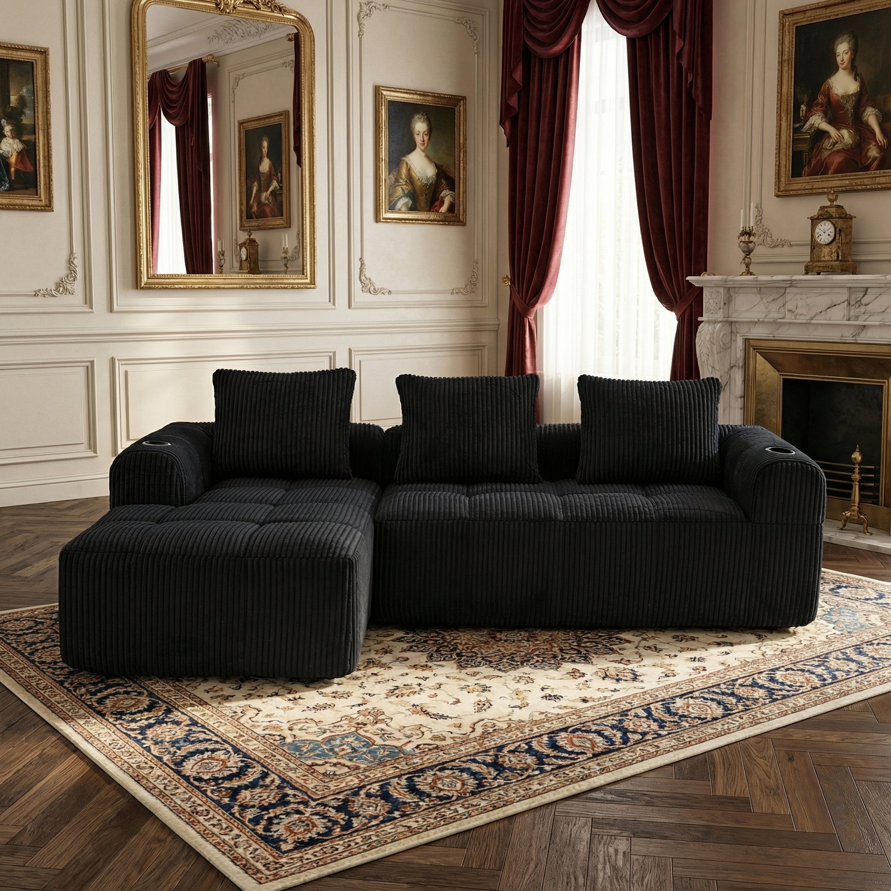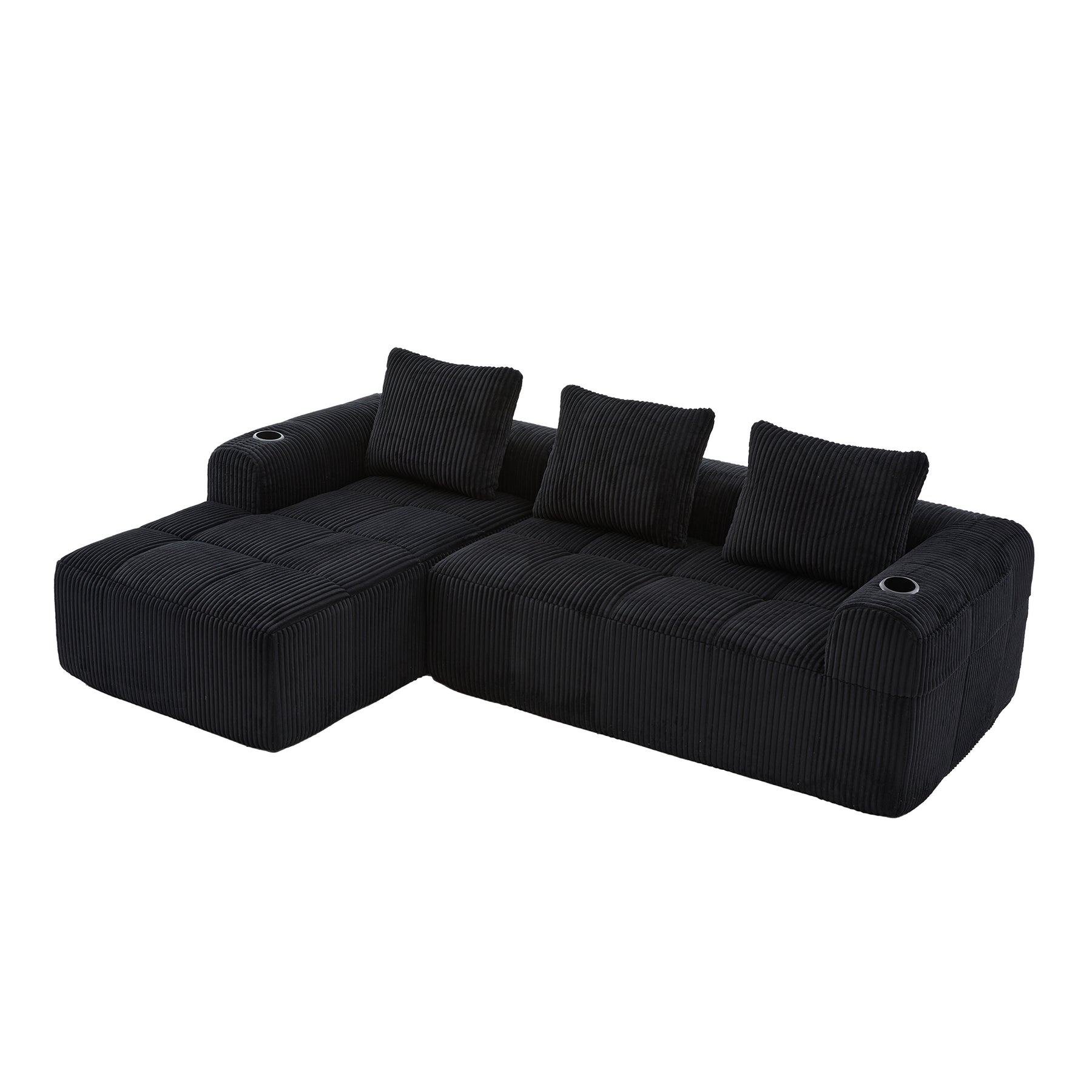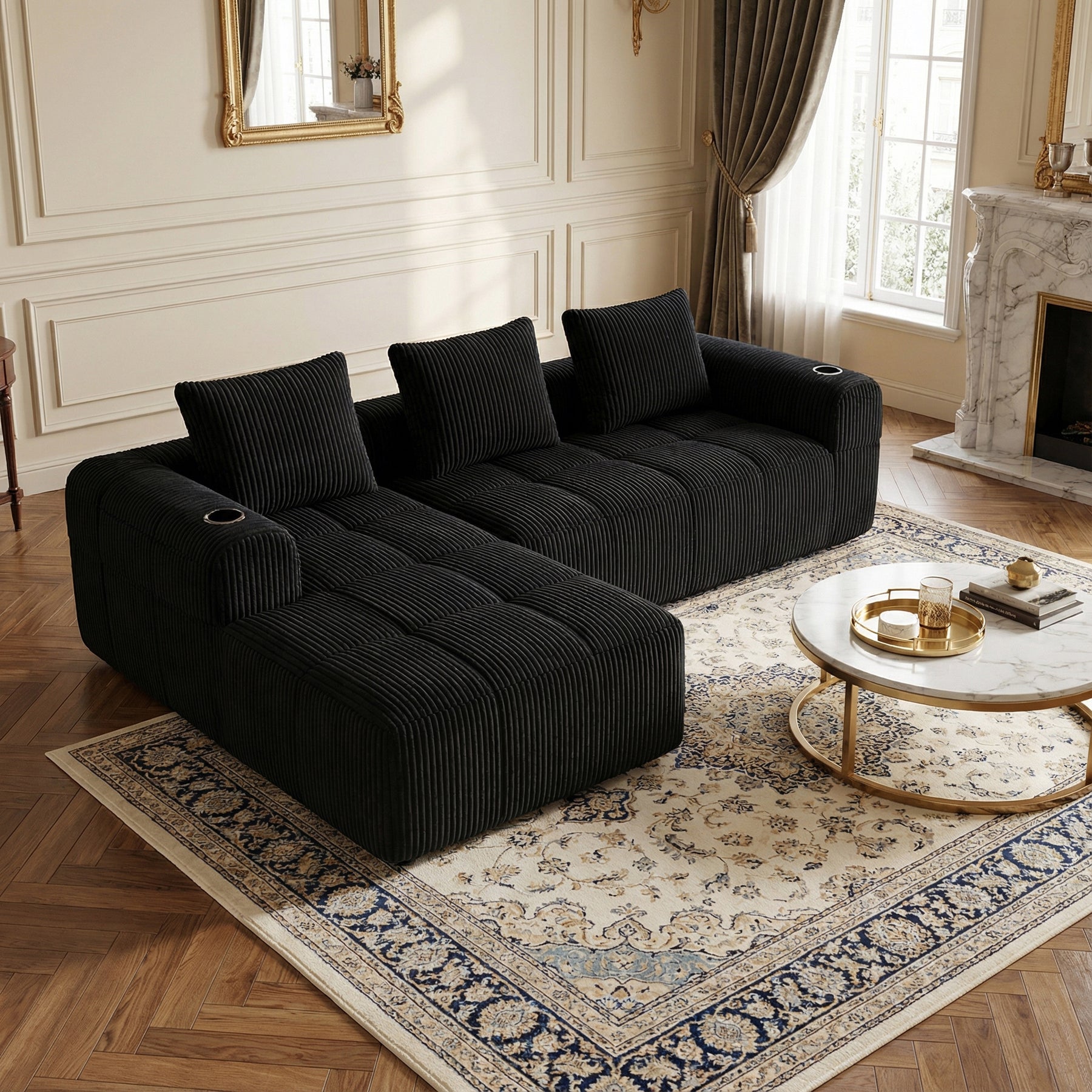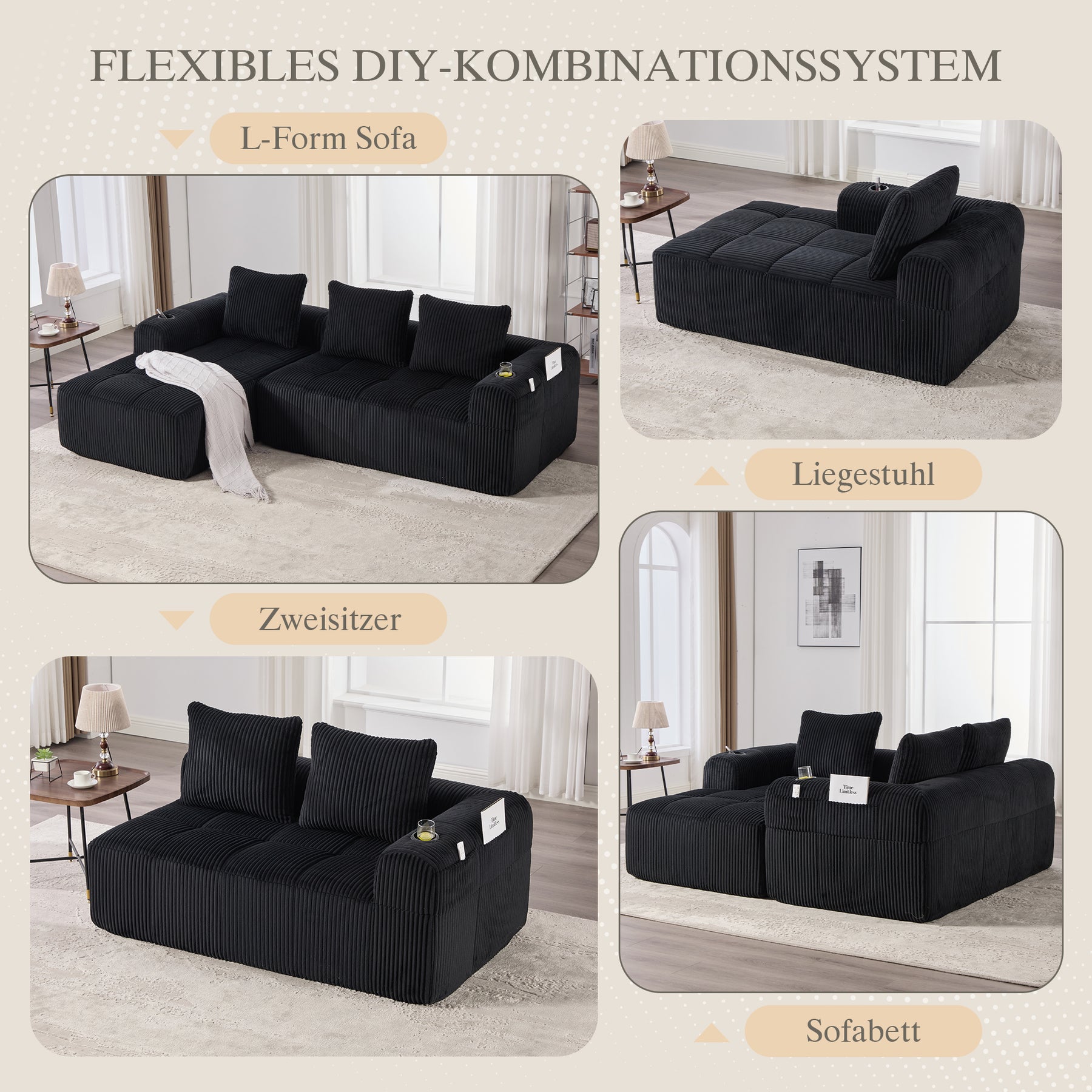 Canapé d'angle 3 places modulable en velours côtelé noir– confort premium, poches latérales et porte-gobelets GRASSLANDSEED