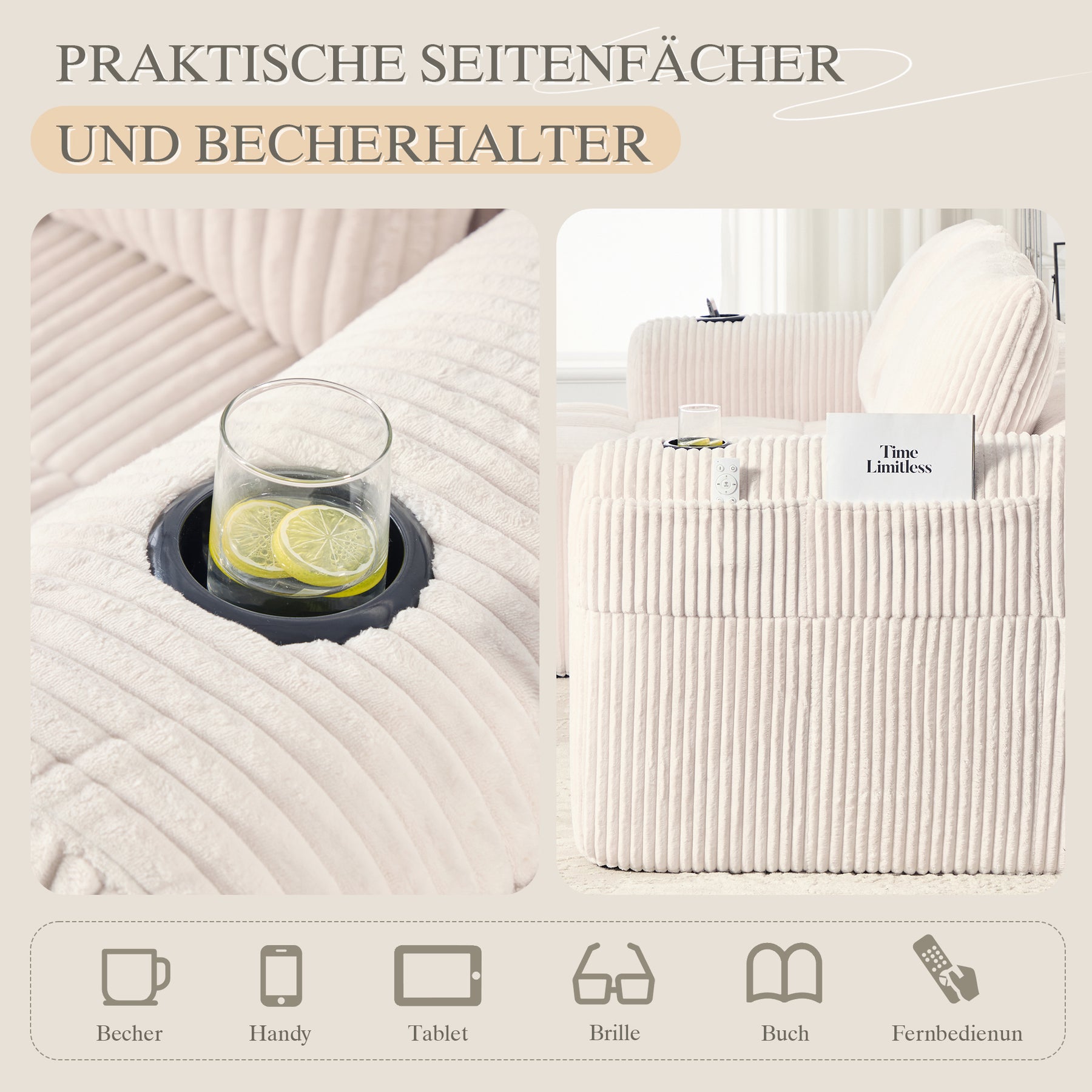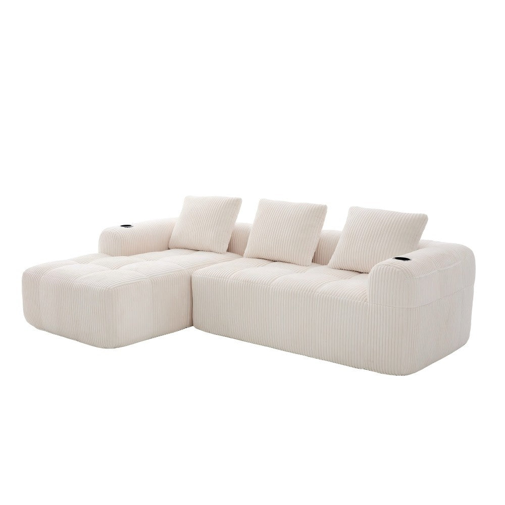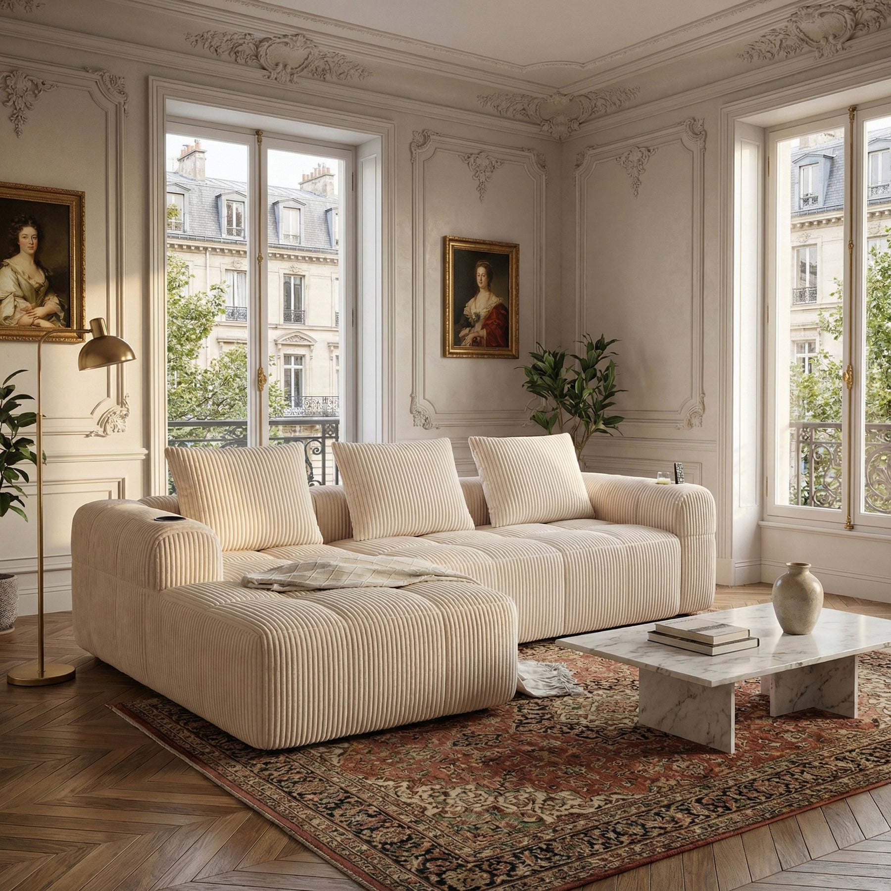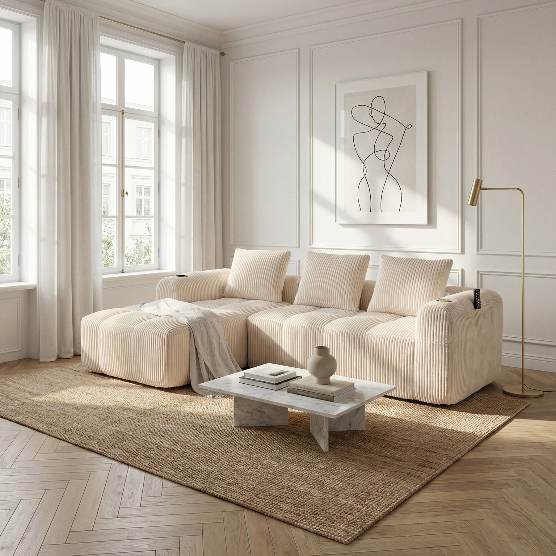Canapé d'angle 3 places modulable en velours côtelé blanc cassé– confort premium, poches latérales et porte-gobelets ECLIPSEBAND