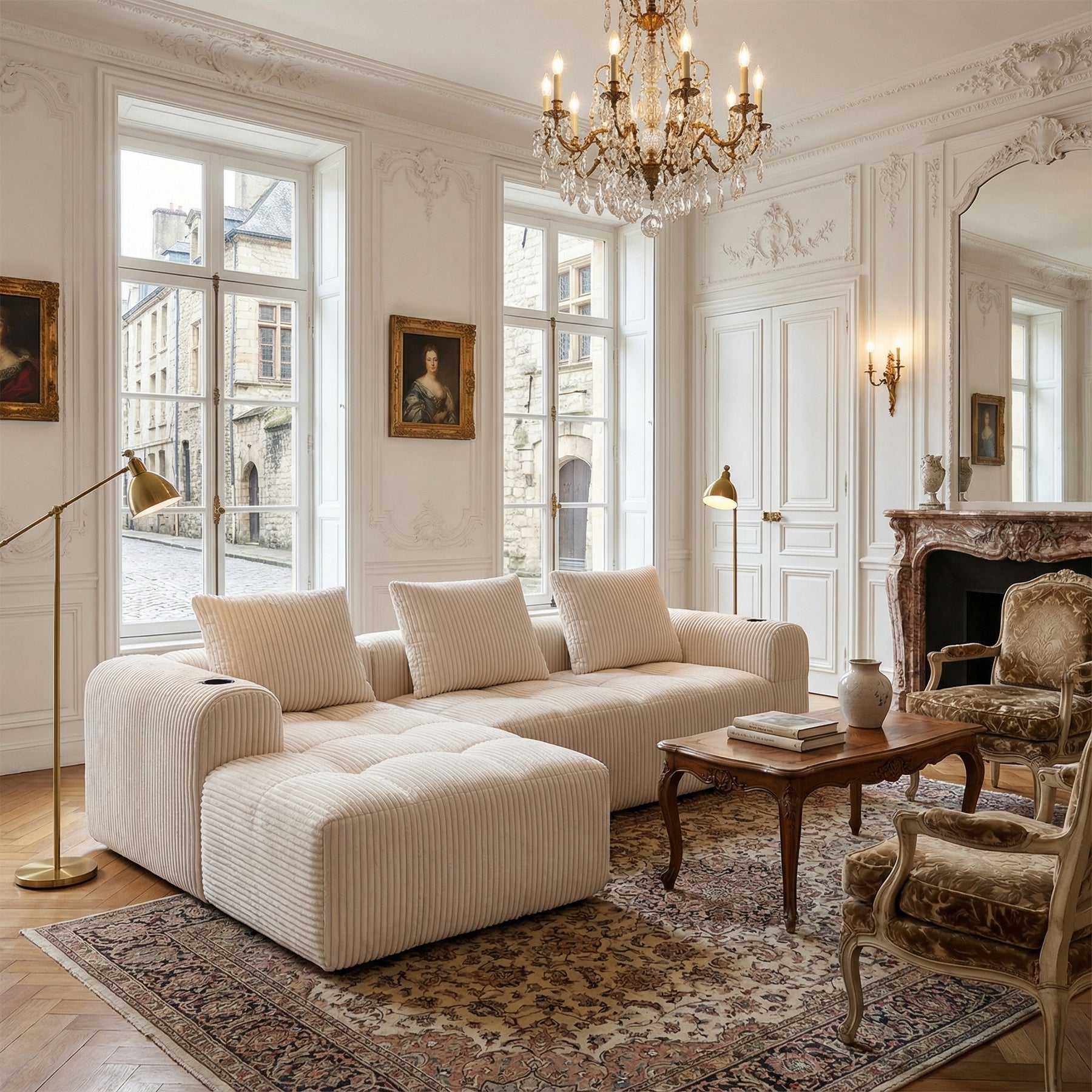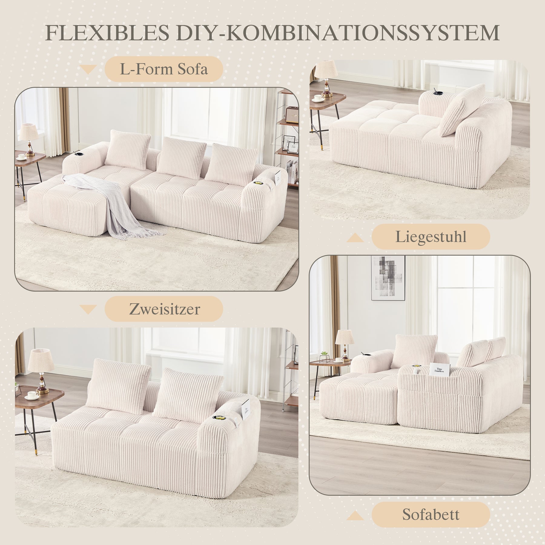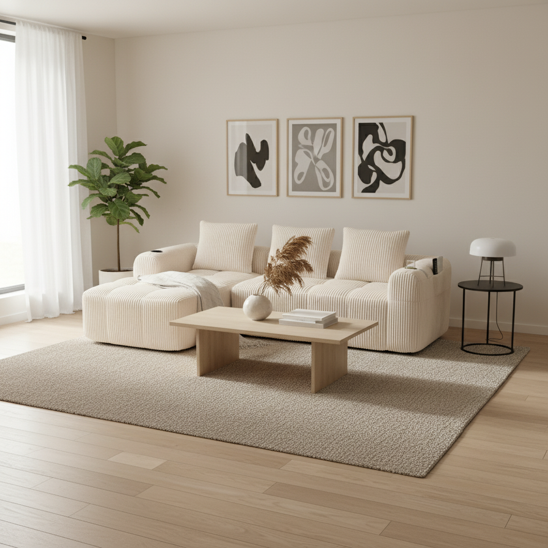 Canapé d'angle 3 places modulable en velours côtelé blanc cassé– confort premium, poches latérales et porte-gobelets ECLIPSEBAND