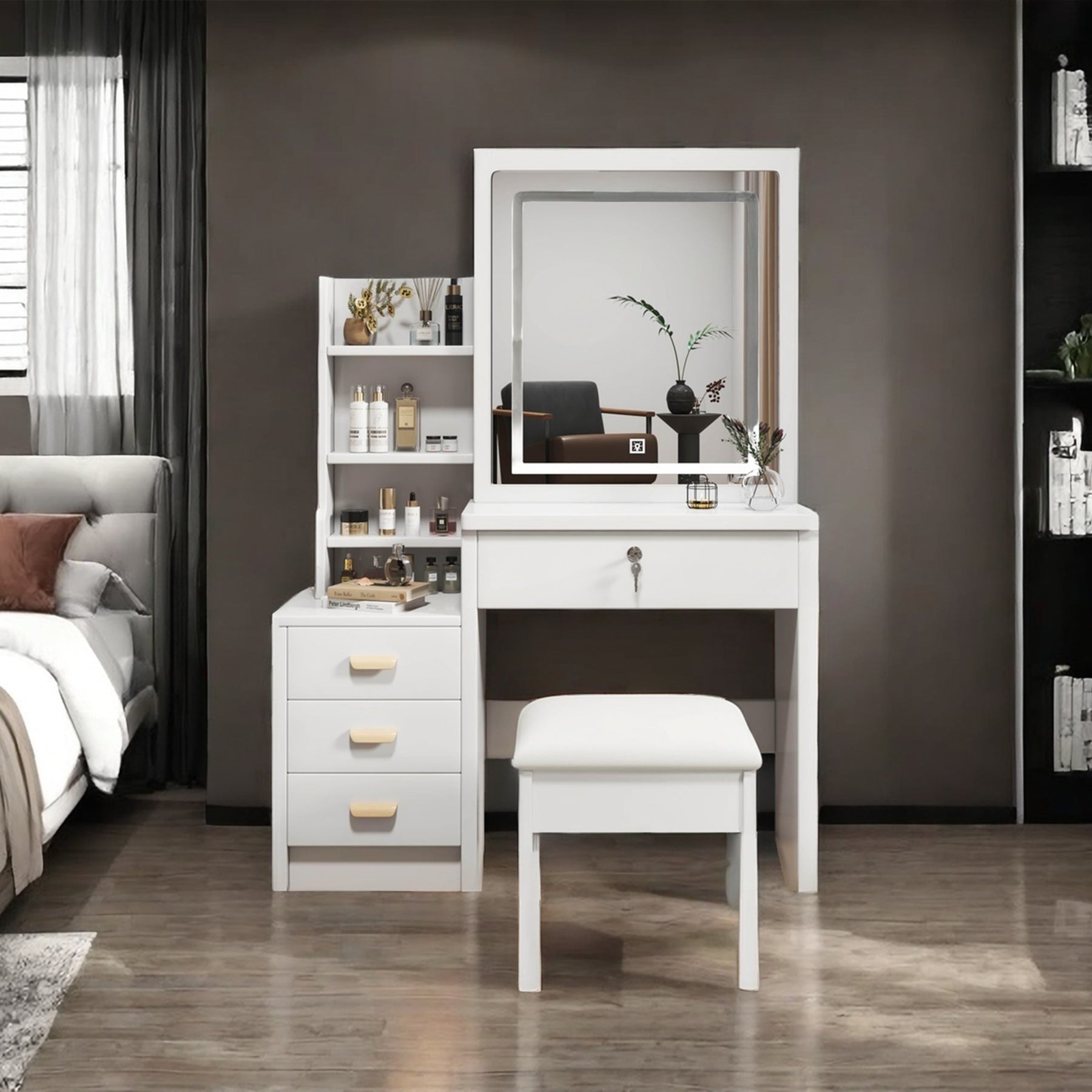 Cette coiffeuse élégante est conçue pour transformer votre routine beauté en une expérience luxueuse et organisée. Son design moderne en blanc épuré est rehaussé par un grand miroir rectangulaire avec éclairage LED réglable sur trois modes de couleur, assurant un maquillage parfait dans toutes les conditions. Avec son étagère latérale ouverte, ses quatre tiroirs spacieux, dont un verrouillable, et son compartiment de rangement, elle offre un espace exceptionnel pour classer et organiser tous vos produits cosmétiques. L'ensemble est complété par un tabouret blanc rembourré, créant un coin beauté fonctionnel et sophistiqué dans votre chambre.