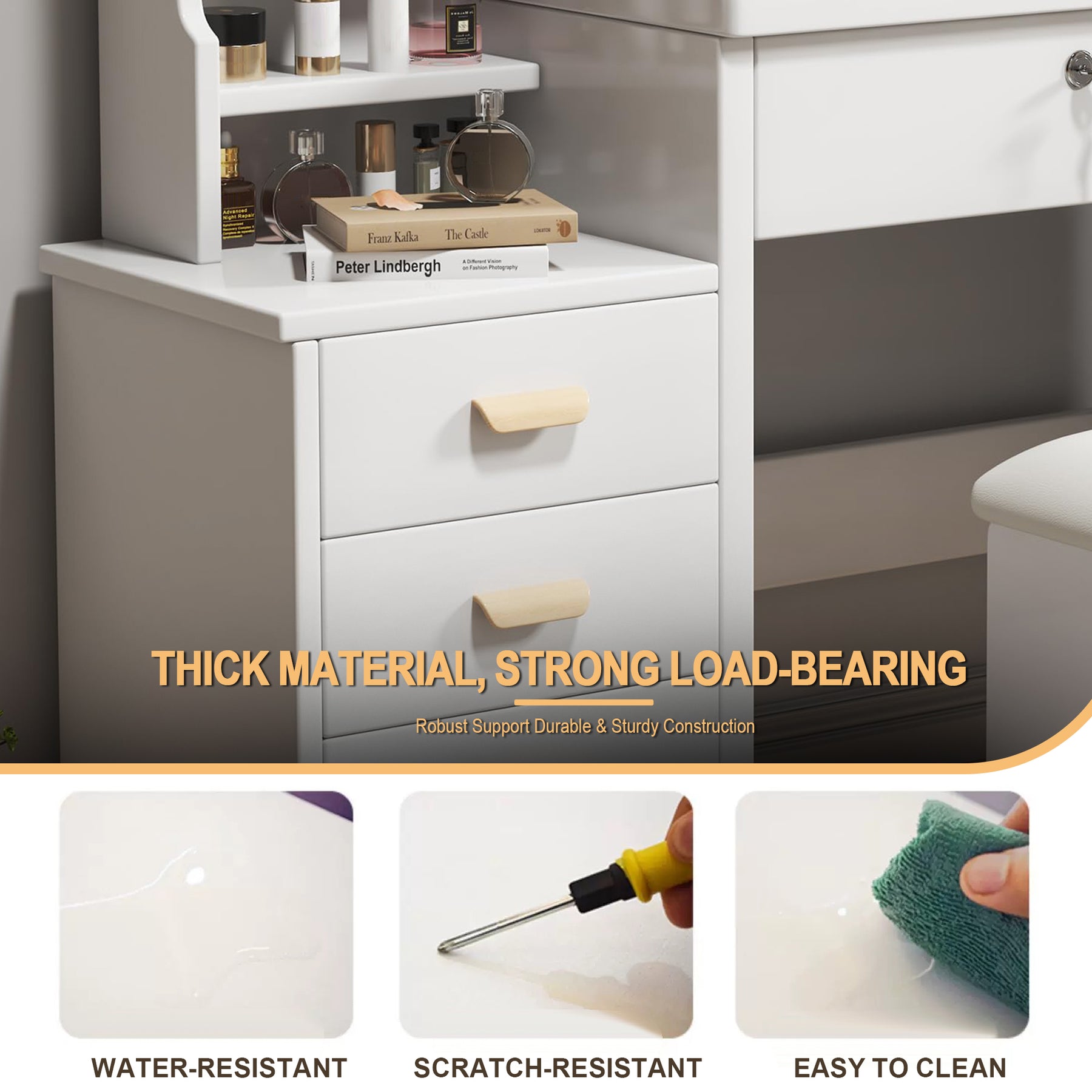 Tabouret confortable et tiroir verrouillable : le siège rembourré est inclus, et un des tiroirs est équipé d'une serrure pour garder vos objets de valeur en sécurité.