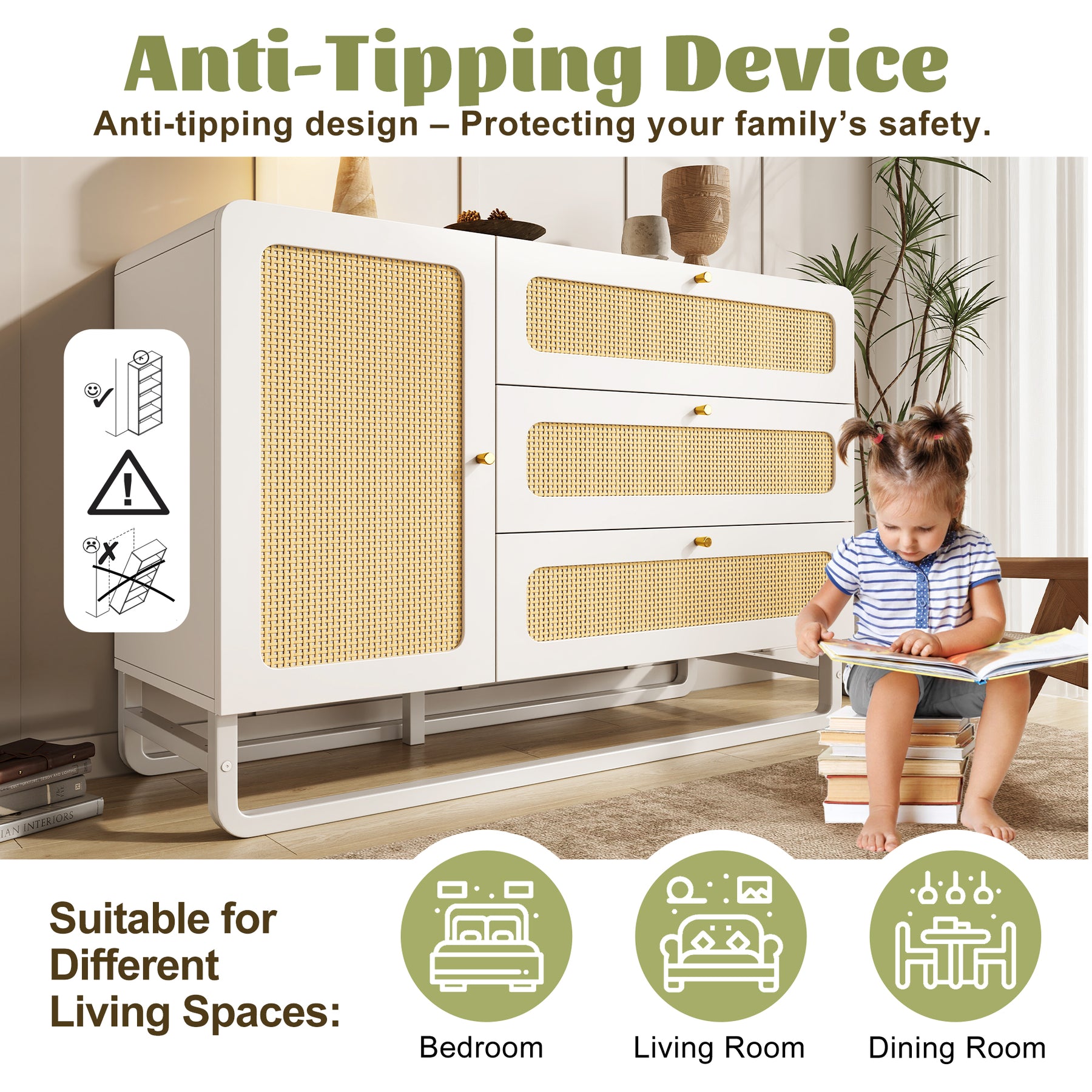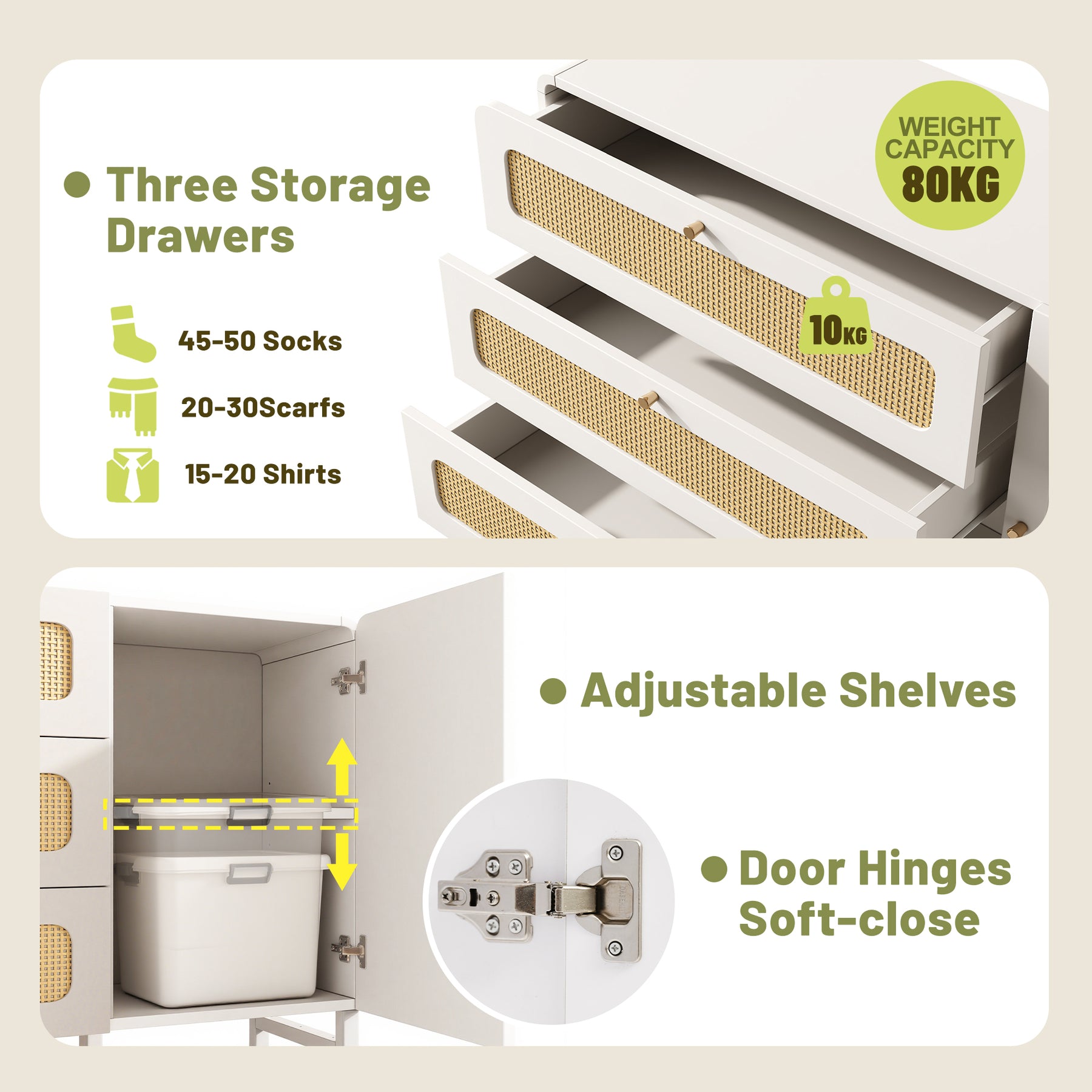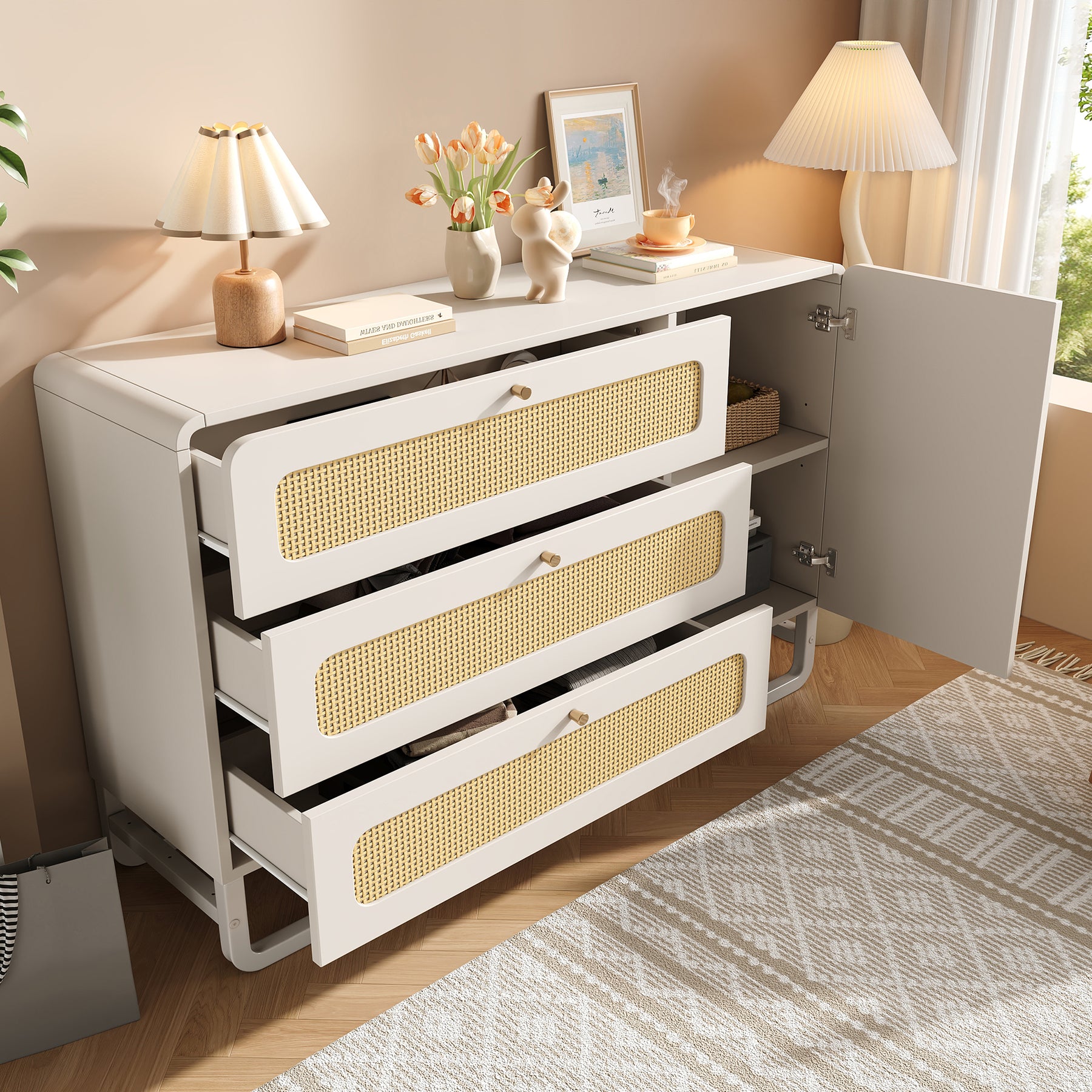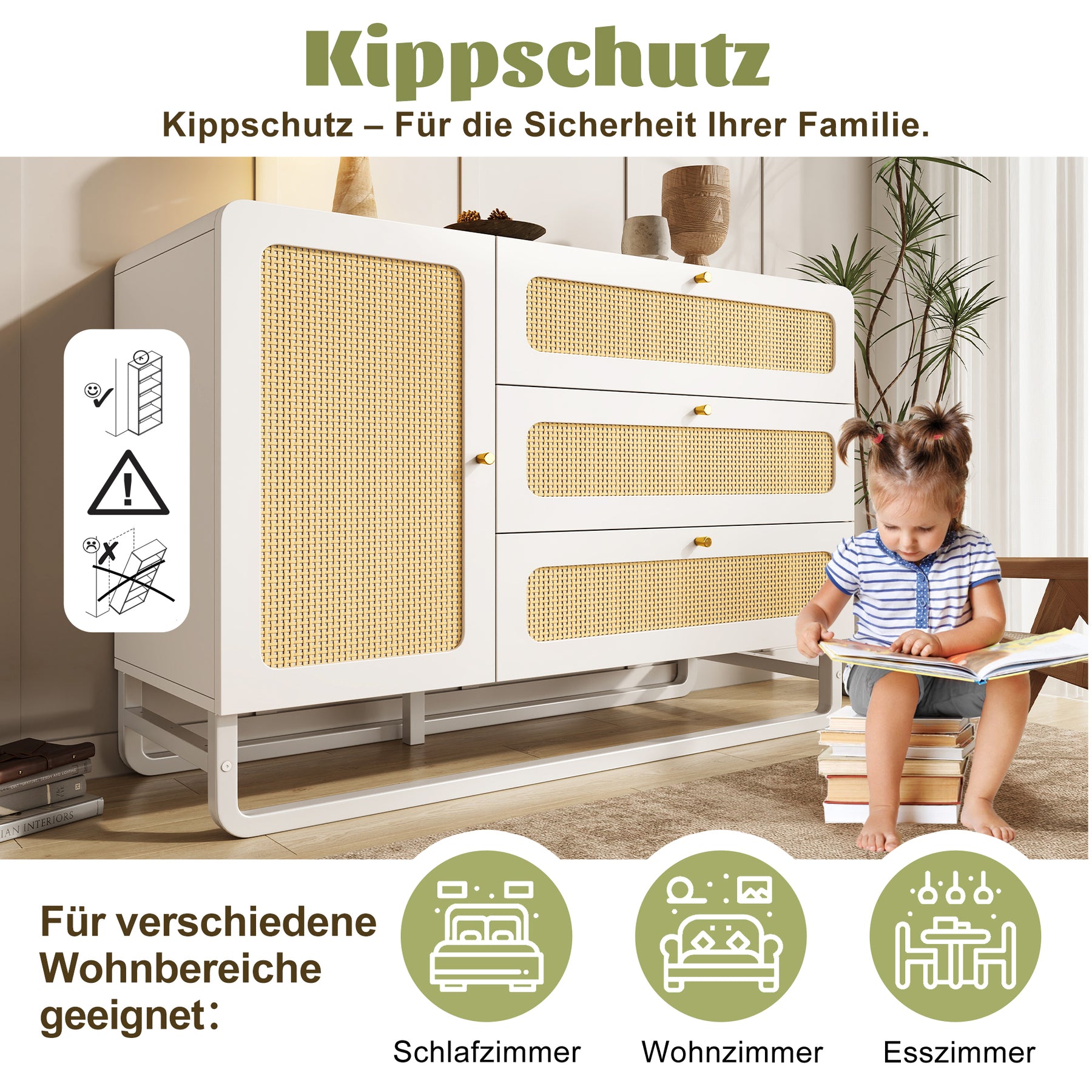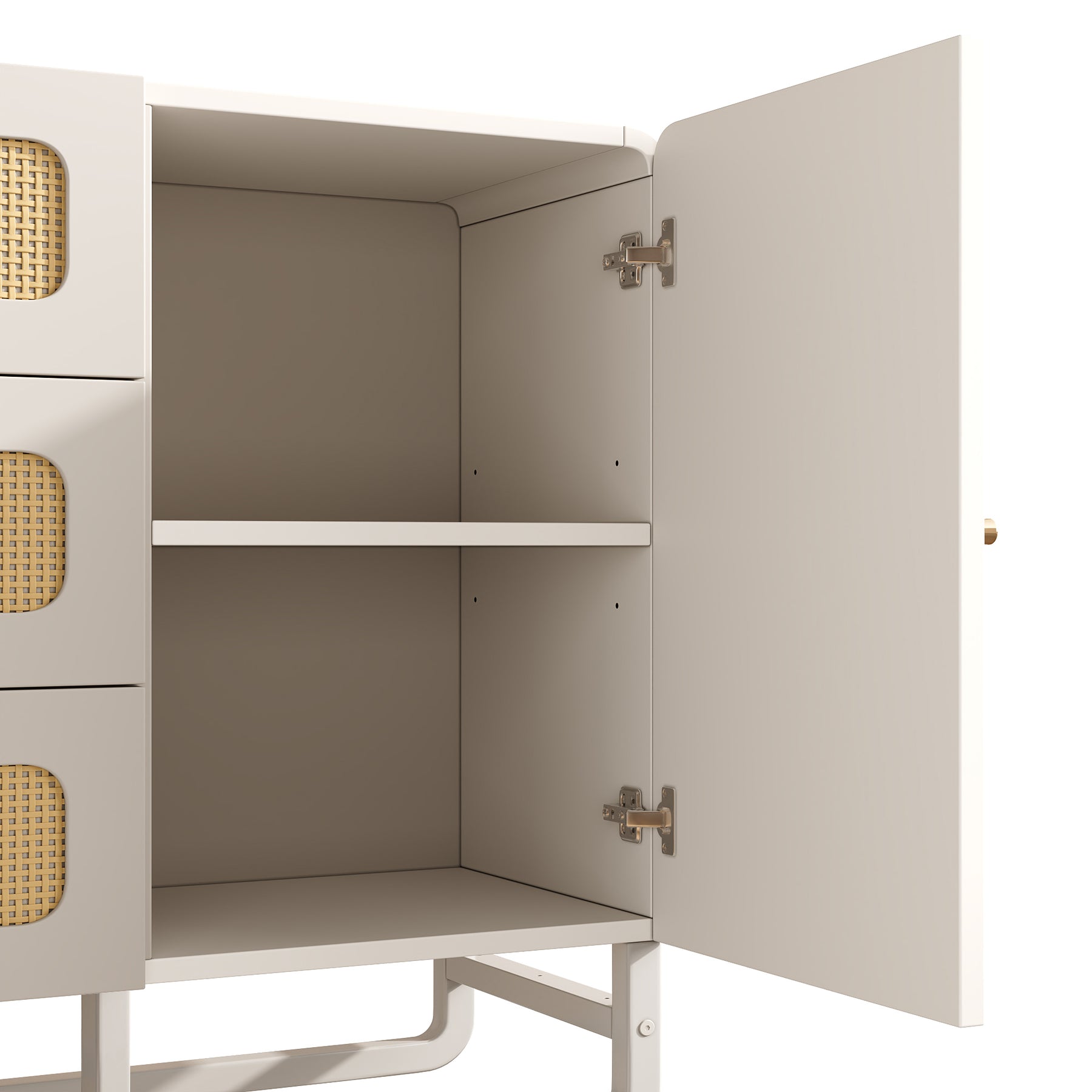 Buffet blanc et portes en rotin tissé, 3 tiroirs, 1 porte et pieds en métal TURION