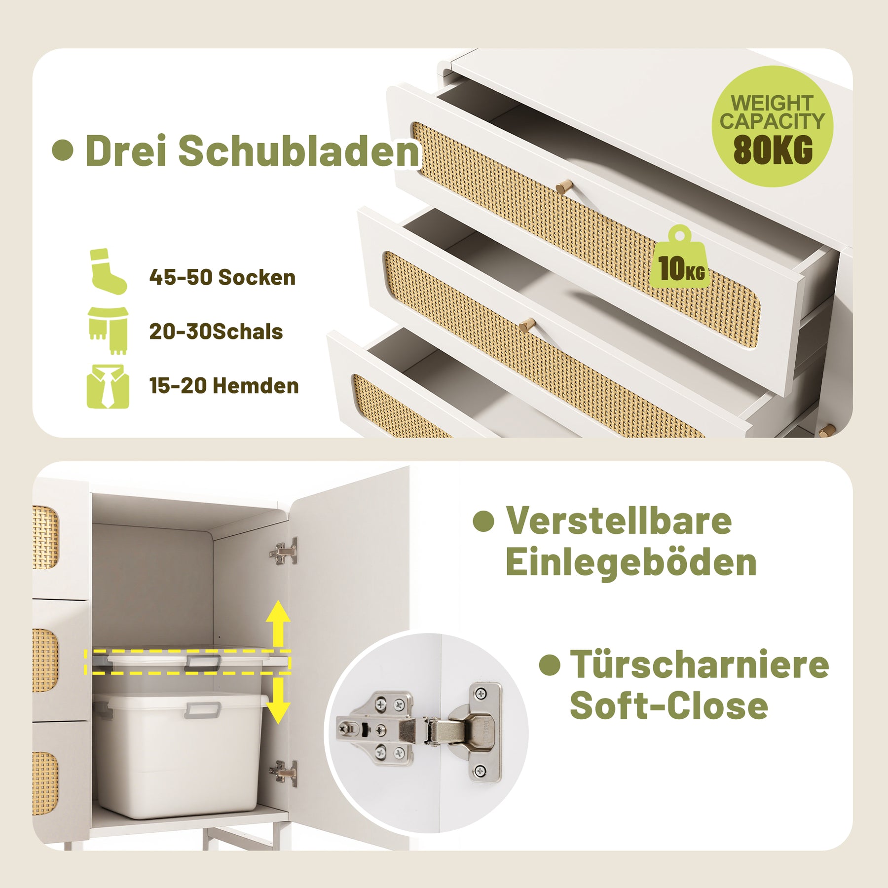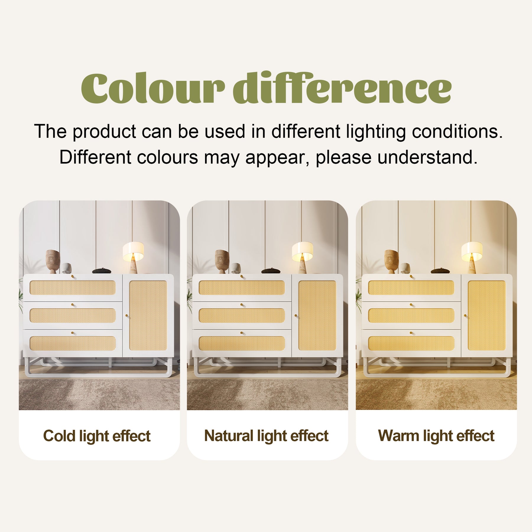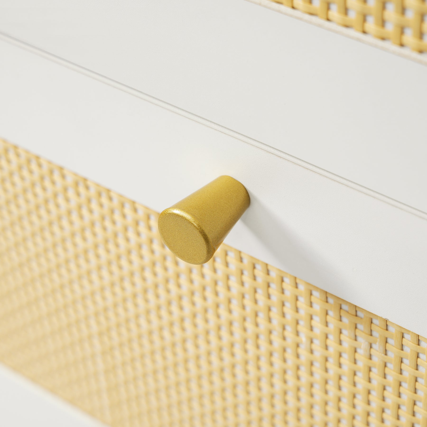 • Design courbe et rotin naturel : l'association de panneaux blancs, de rotin jaune tressé et de poignées dorées crée un look ferme chic, chaleureux et tendance.