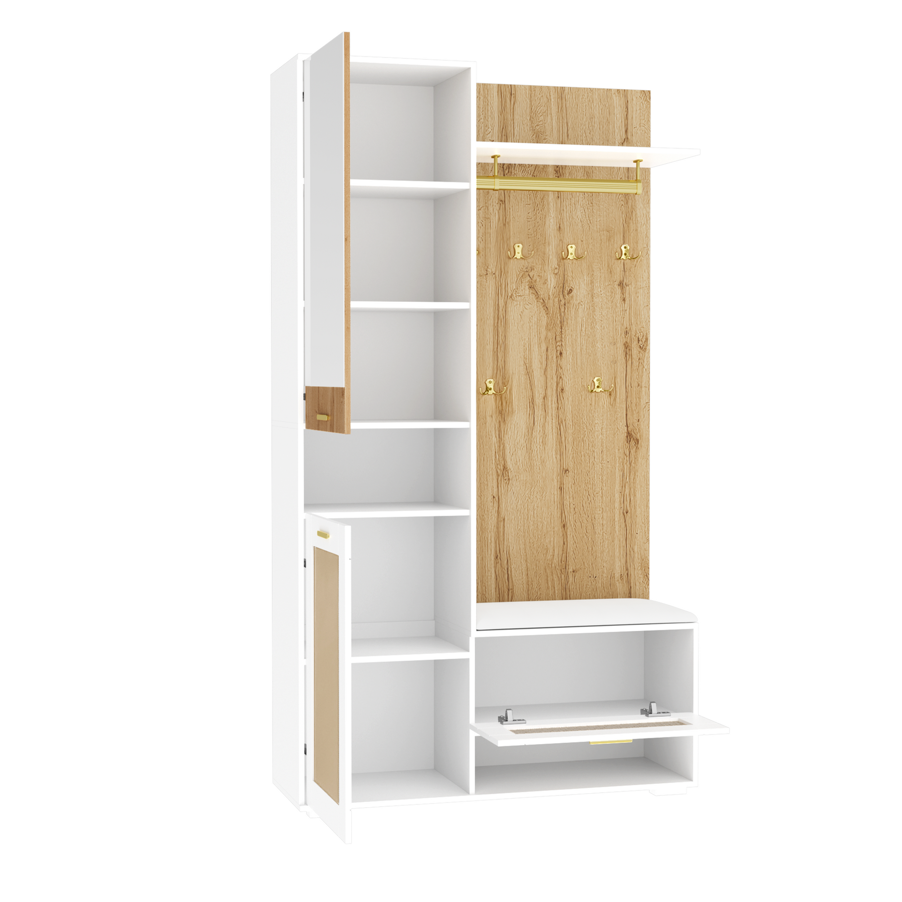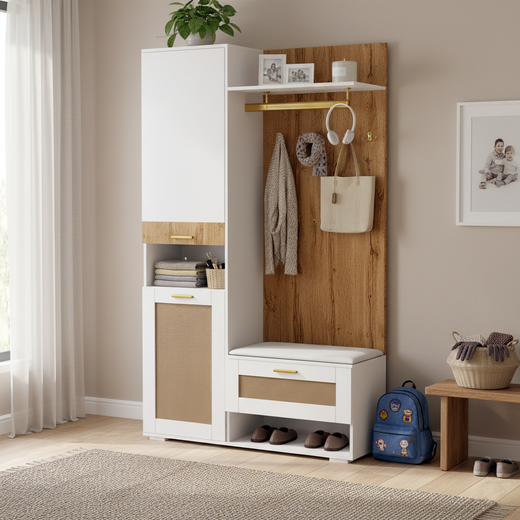 Grand espace de rangement tout-en-un : trois portes, des compartiments ouverts, un banc, des crochets et un compartiment supérieur offrent beaucoup d'espace pour les vêtements et accessoires.