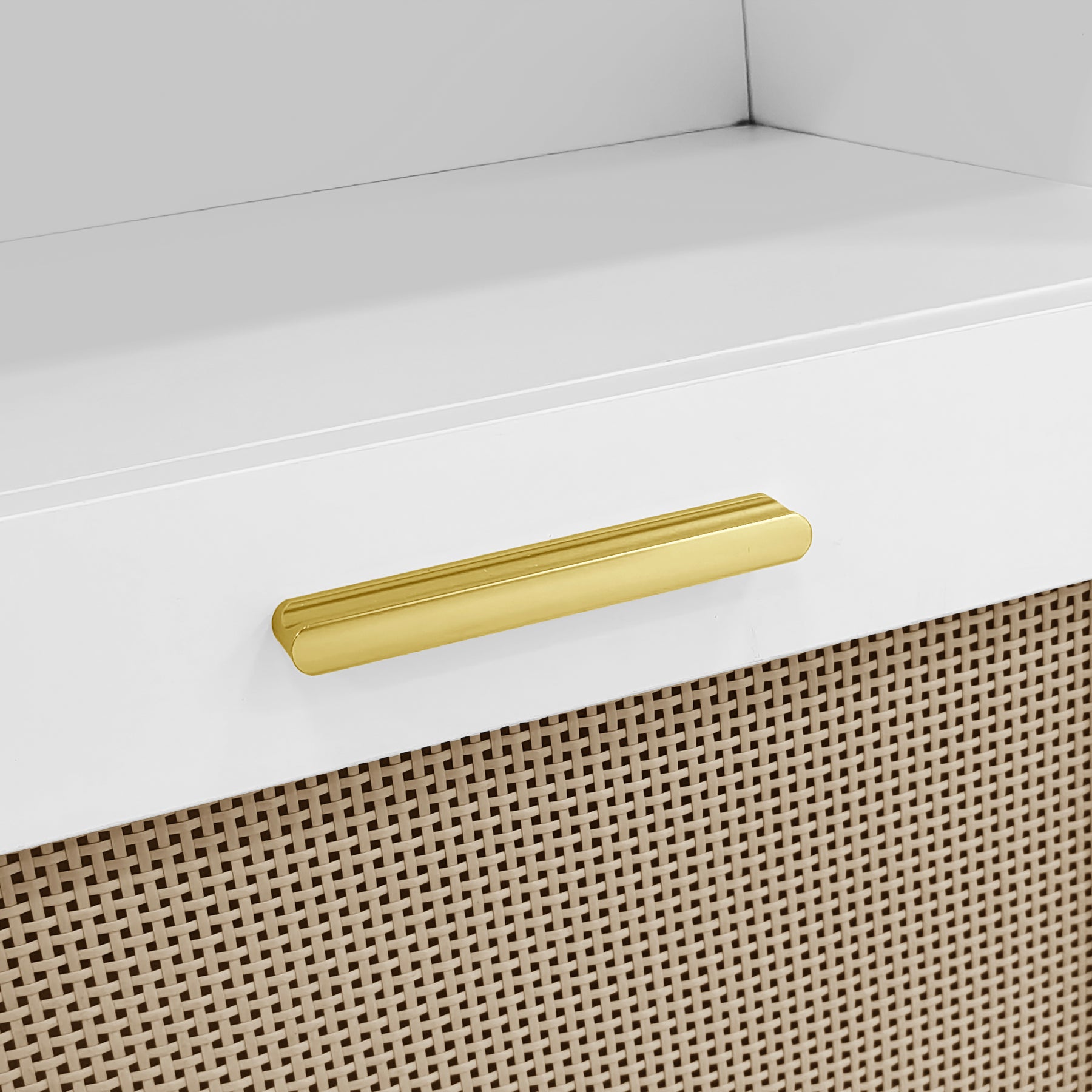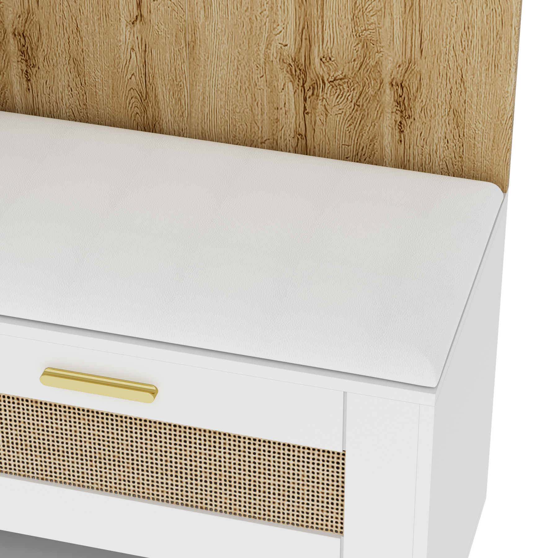 Design moderne bicolore : la combinaison d'un fini bois et blanc avec des accents dorés crée un look élégant et contemporain.