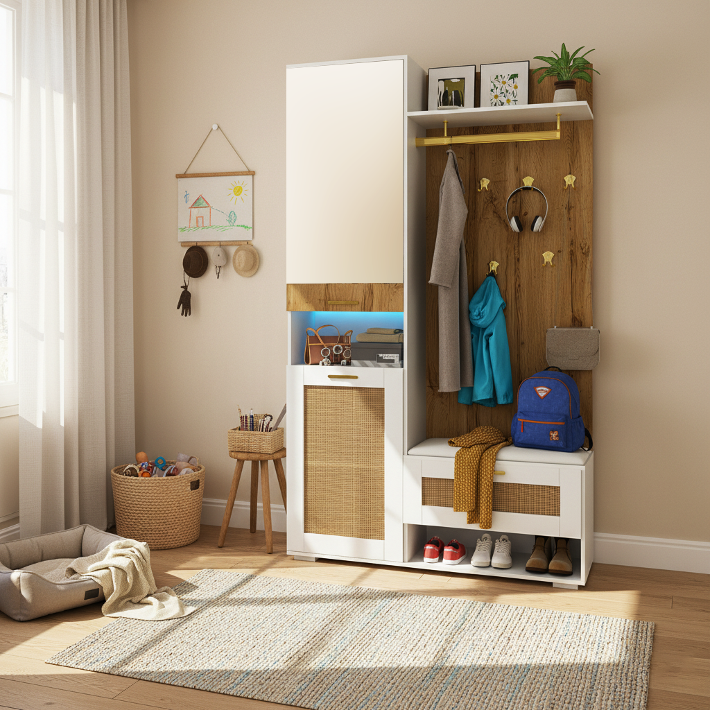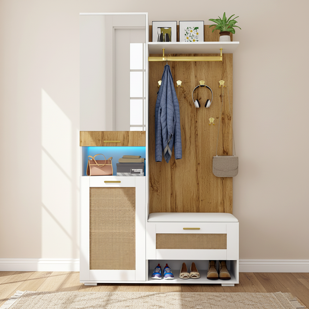 Cet ensemble de vestiaire combine fonctionnalité et design moderne pour transformer votre entrée ou couloir en un espace organisé et accueillant. Il présente un contraste élégant entre le blanc épuré du rangement et le panneau effet bois naturel du fond, rehaussé par des accents dorés (patères et poignées) pour une touche luxueuse. Le meuble intègre une armoire haute, un miroir pleine longueur pour la vérification des tenues, un banc pratique pour s'asseoir, et est doté d'un éclairage led réglable en 16 couleurs pour créer une ambiance personnalisée. Avec ses multiples options de rangement, dont un placard à chaussures, des crochets et des étagères ouvertes, il offre une solution complète pour les vêtements, les chaussures et les accessoires.