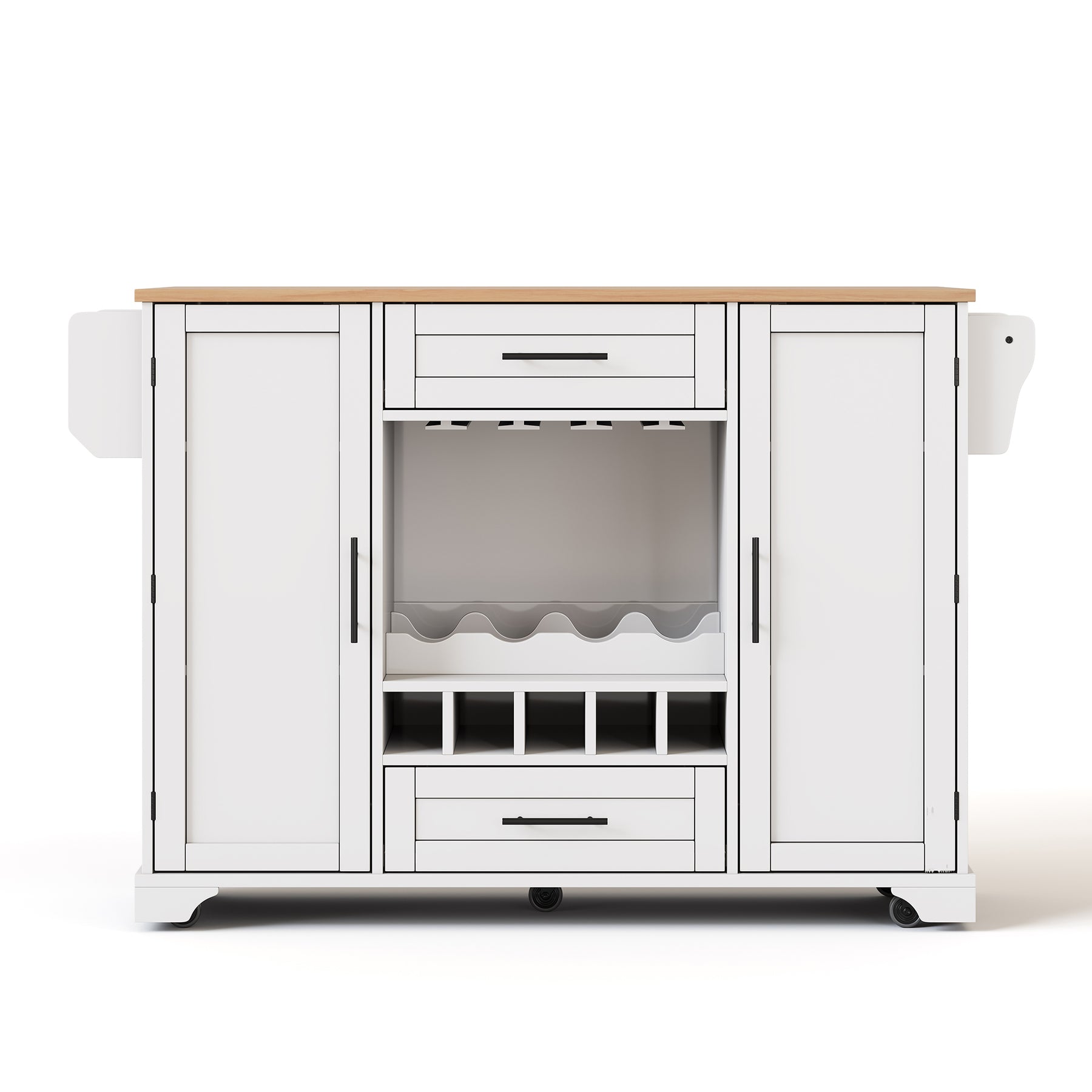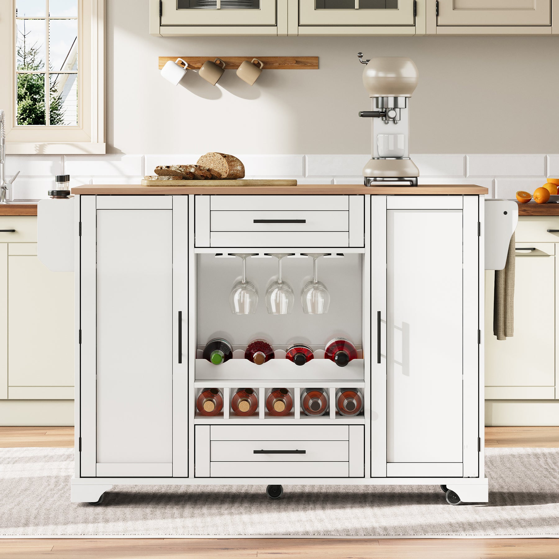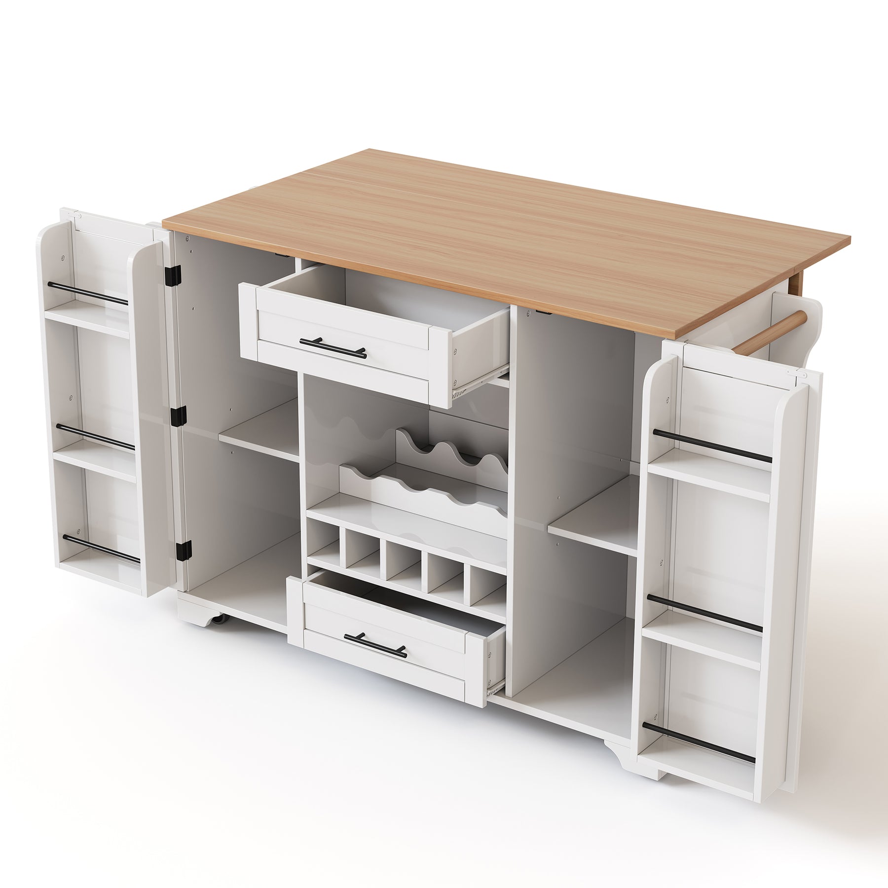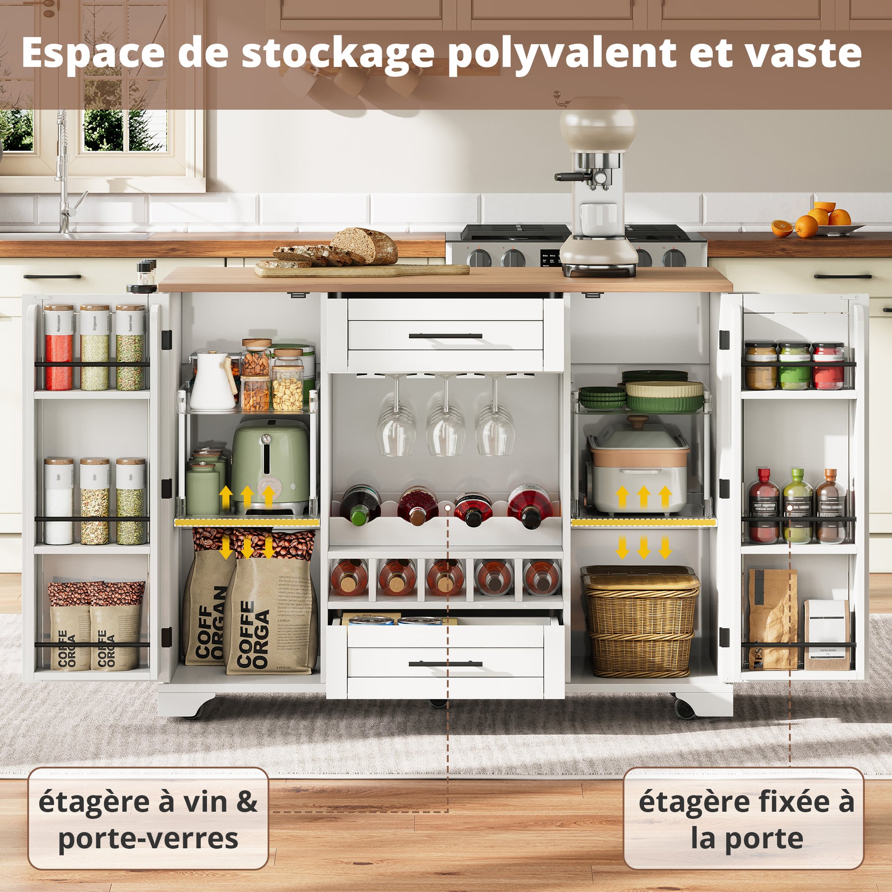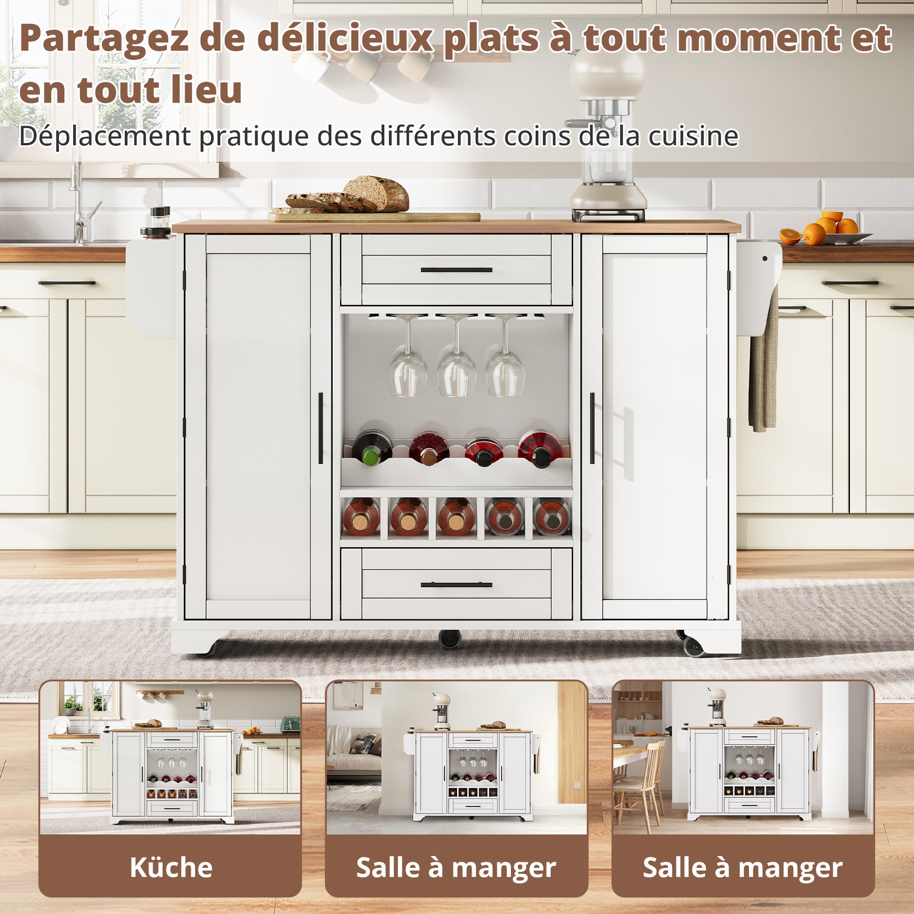Îlot de cuisine blanc, plan effet bois pliant, porte-verres, casier à vin avec roulettes SEMIOCH