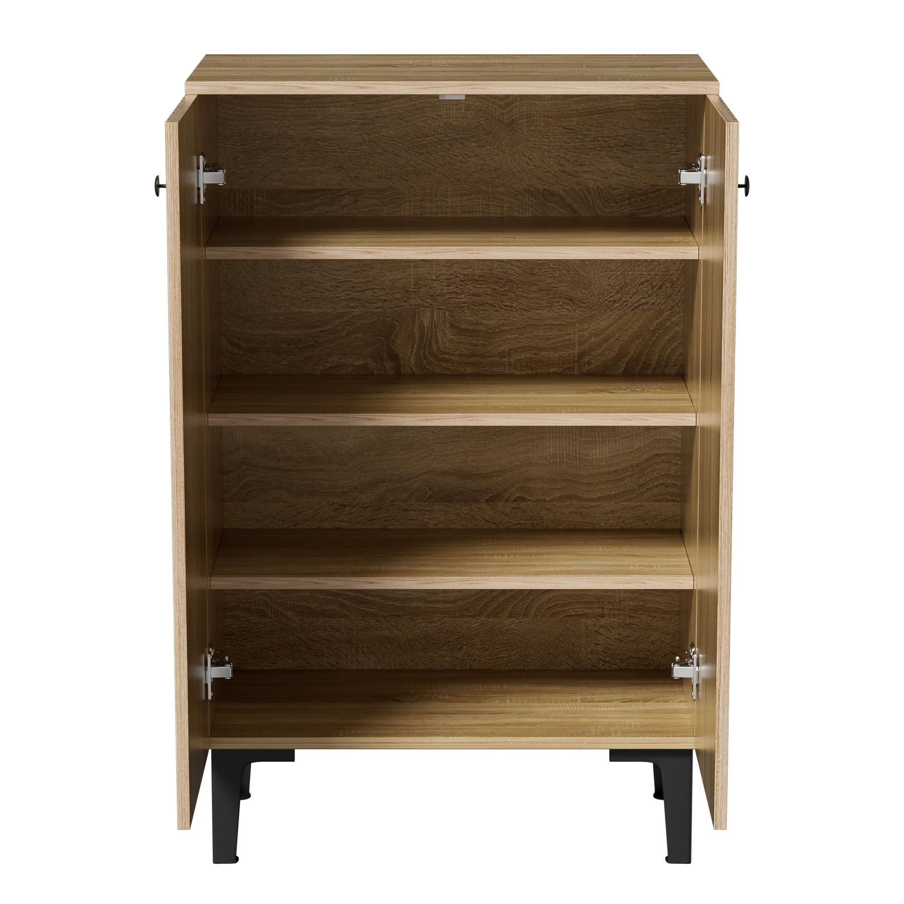 Ce meuble à chaussures moderne est la solution idéale pour optimiser l'espace dans votre entrée ou votre couloir. Arborant une finition en bois naturel chaleureuse, il présente des lignes épurées et un design élégant avec un piètement en métal noir robuste qui garantit stabilité et durabilité. Compact, il offre cependant un espace de rangement généreux grâce à ses multiples étagères intérieures, parfaites pour organiser baskets, talons hauts, chaussons et autres accessoires. Le dessus du meuble peut également servir d'étagère pour des décorations ou des objets du quotidien, alliant ainsi praticité et esthétique.