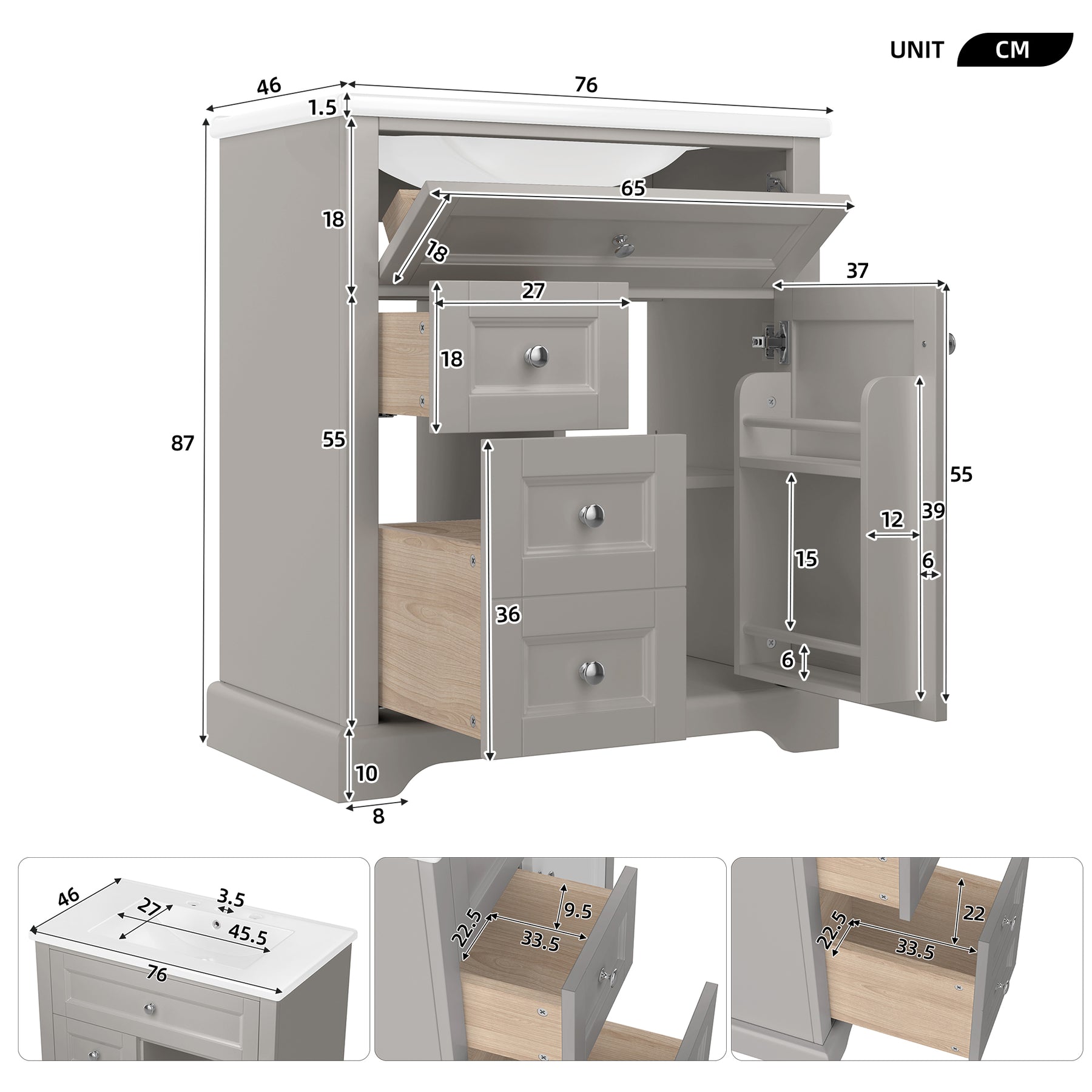 Ce meuble vasque sur pied de 76 cm allie un style traditionnel chic à une organisation interne exceptionnelle. Sa finition laquée grise, sobre et élégante, est complétée par des façades à cadre en relief et des poignées argentées. Construit en MDF avec une résistance accrue à l'humidité, ce meuble est conçu pour durer dans l'environnement de la salle de bain. Il offre une solution de rangement complète avec un grand tiroir à bascule, quatre petits tiroirs supplémentaires et une armoire à porte, tous équipés de mécanismes de fermeture amortie pour une utilisation silencieuse et agréable.
