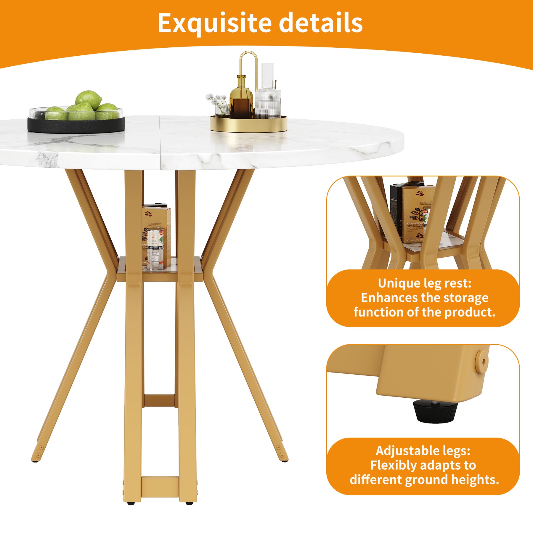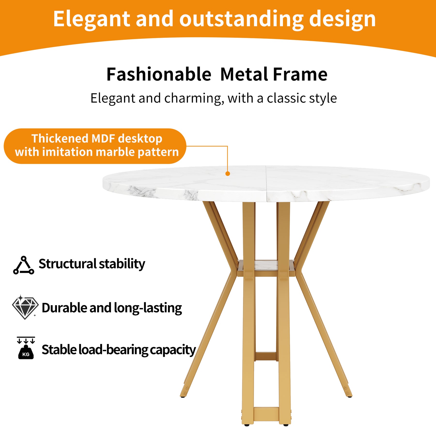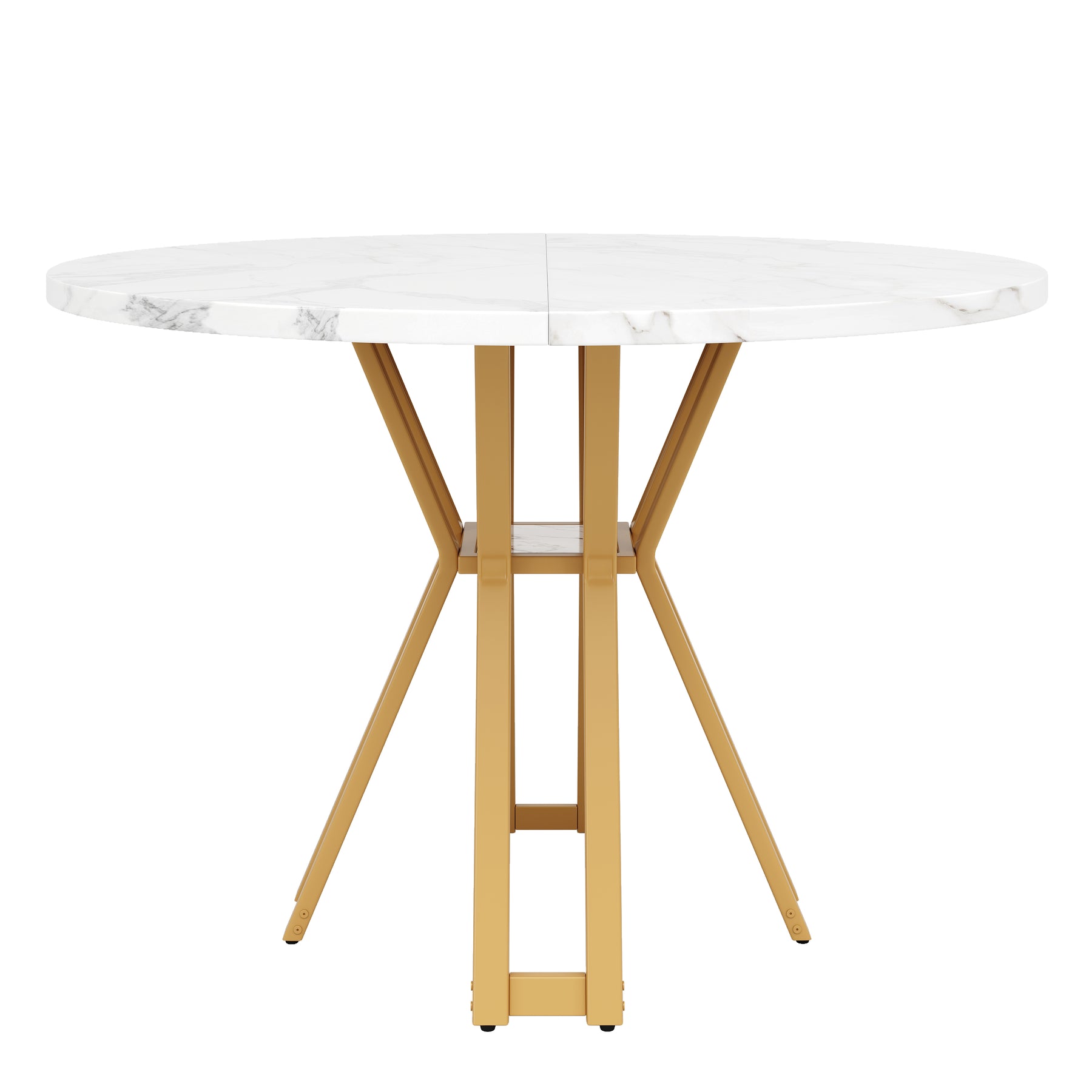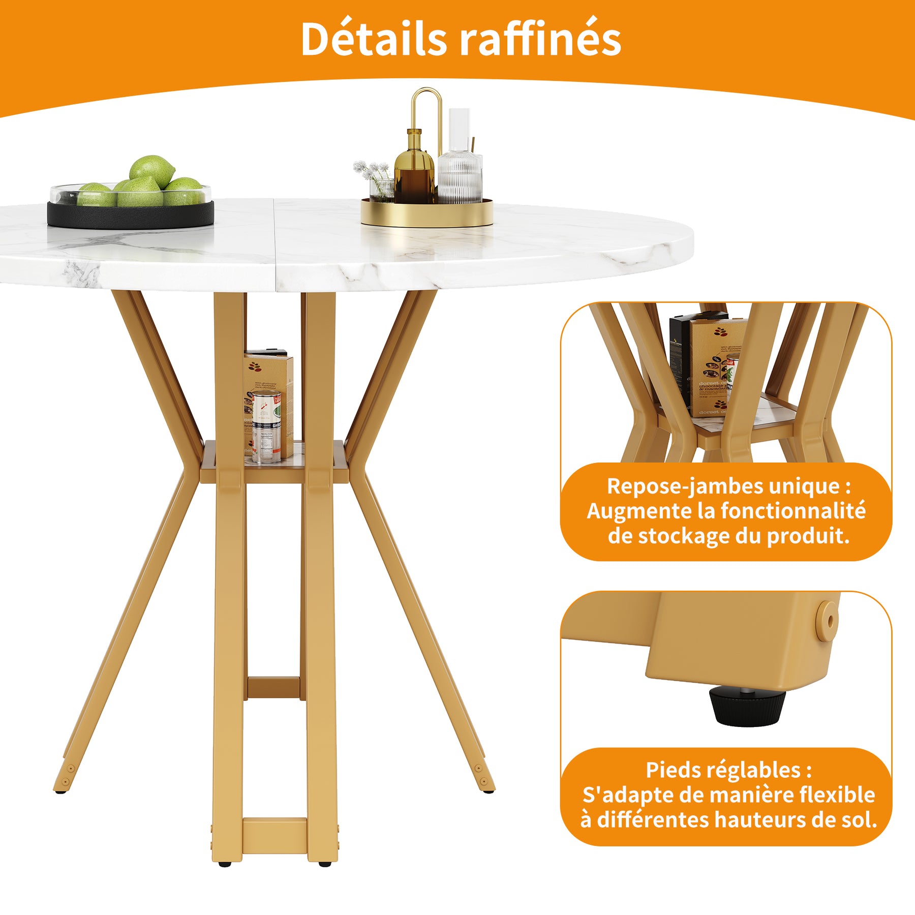 Table à manger ronde effet blanc marbre et piétement métallique doré 100x100cm BARBULE