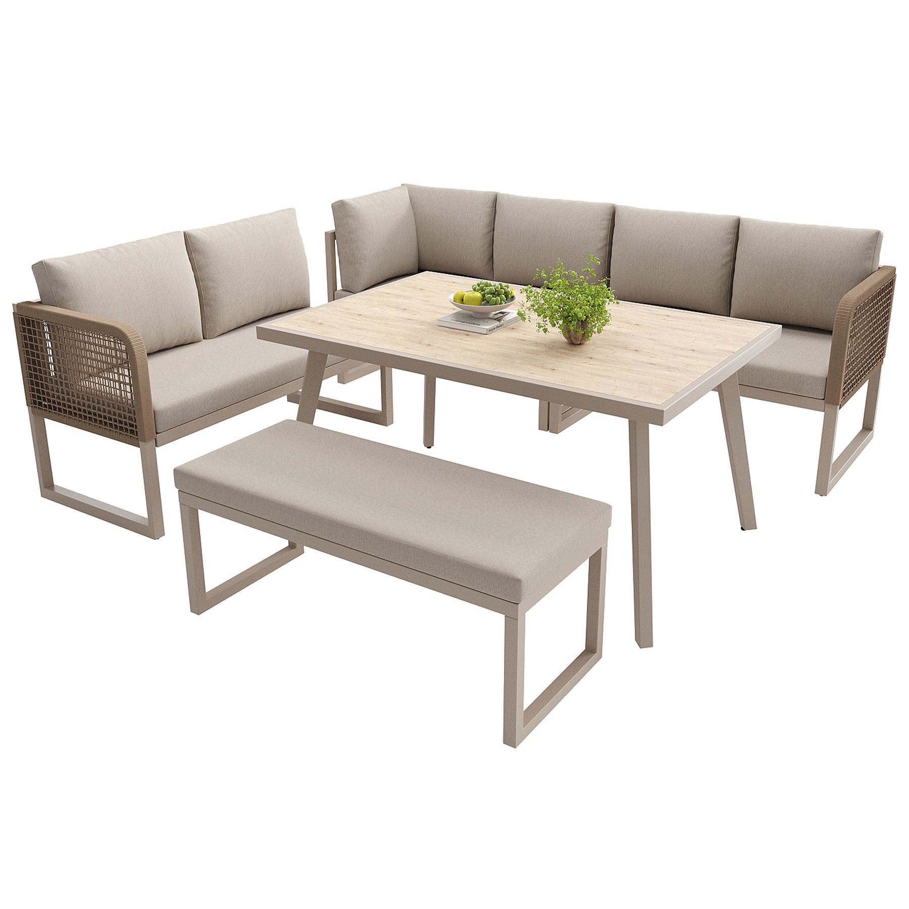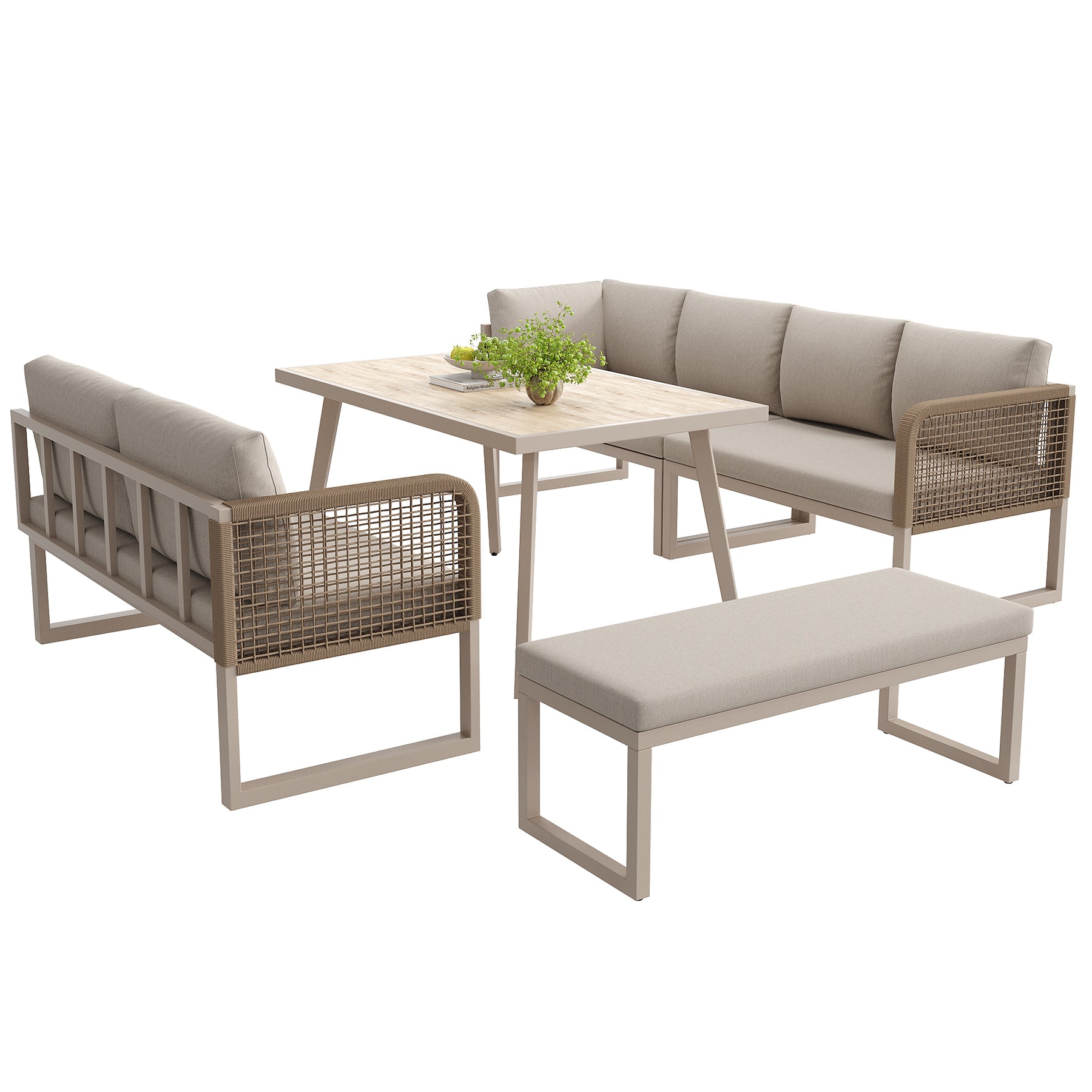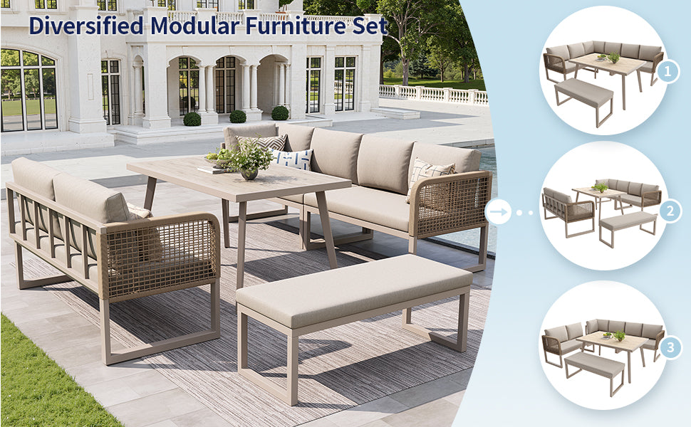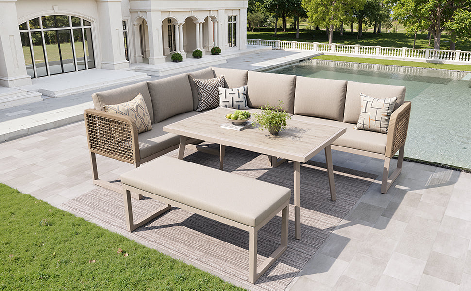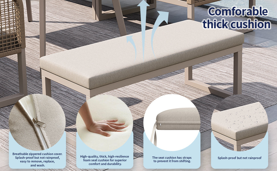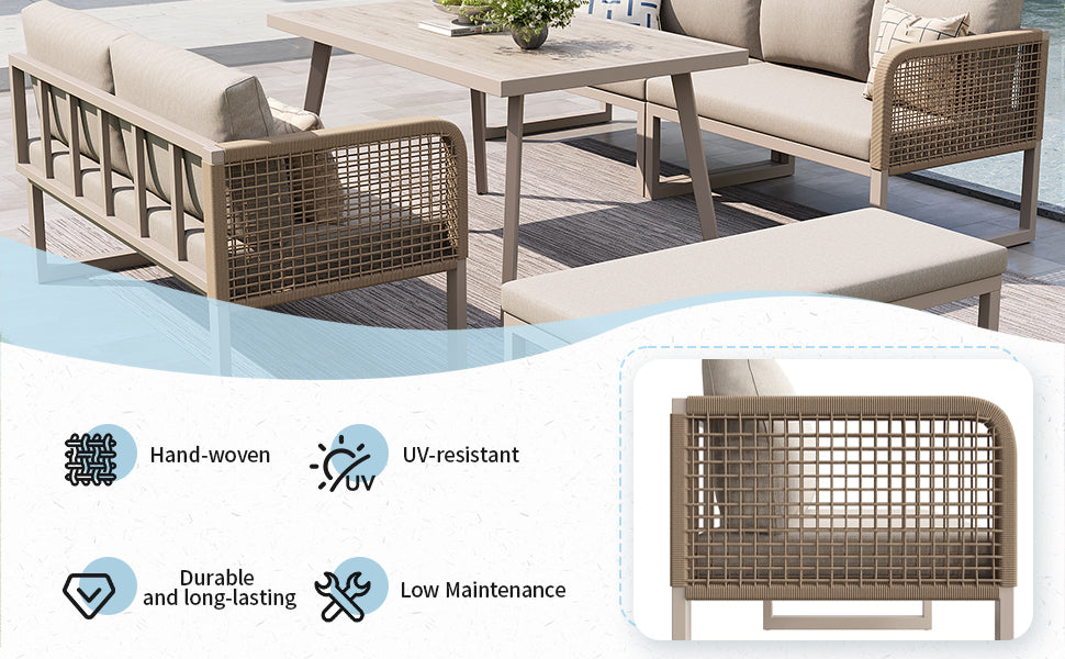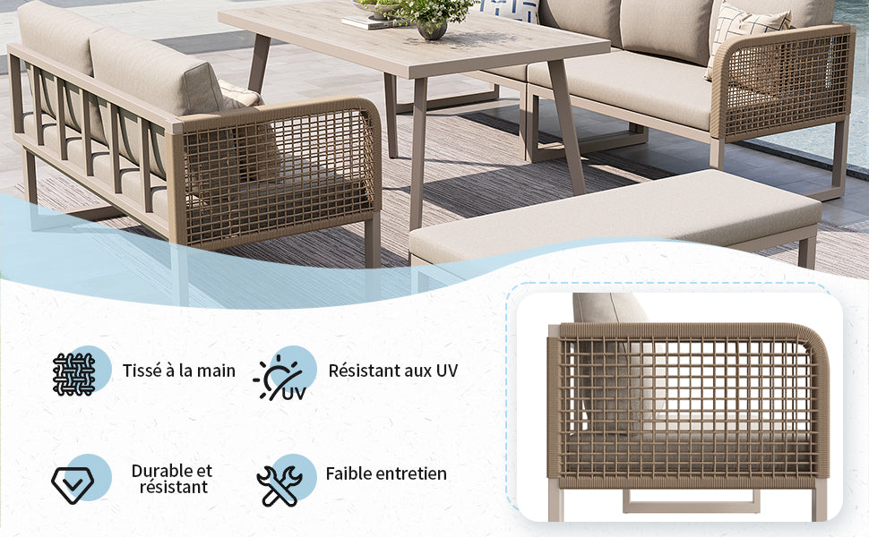 Salon de jardin 6-8 personnes en rotin PE beige avec table et banc intempéries, coussins épais ETHEREALESS