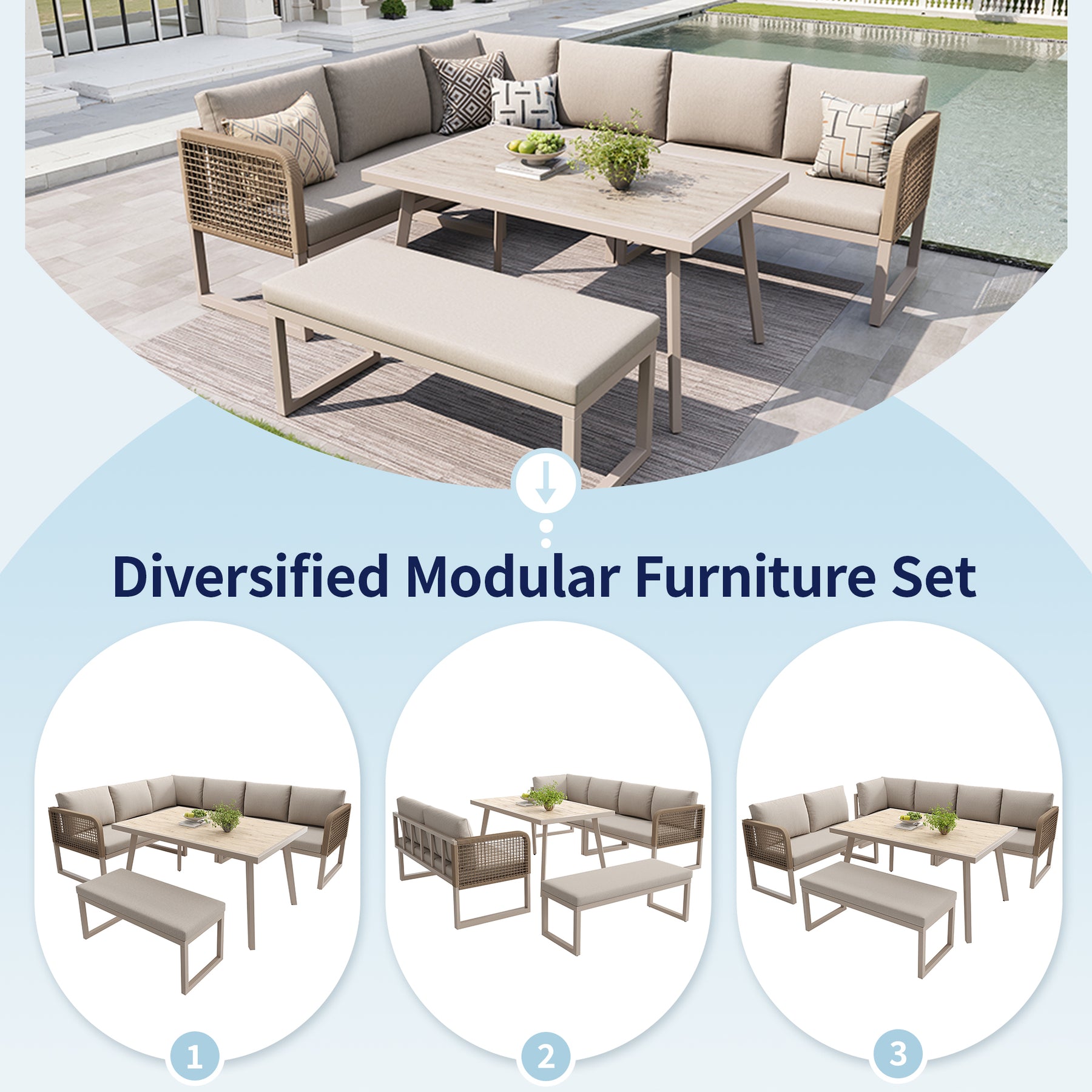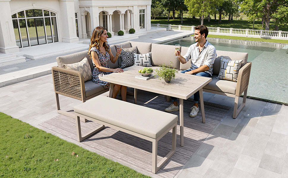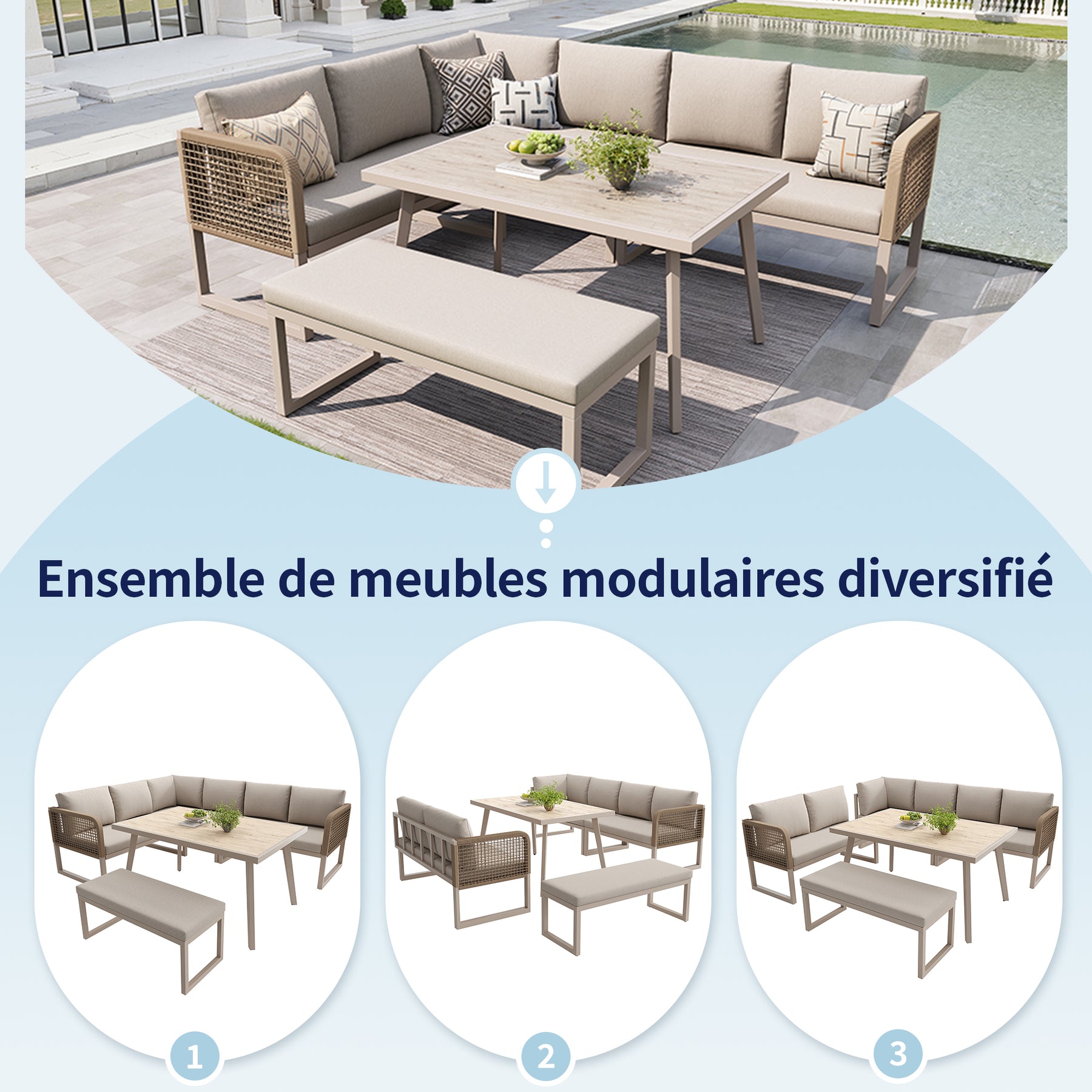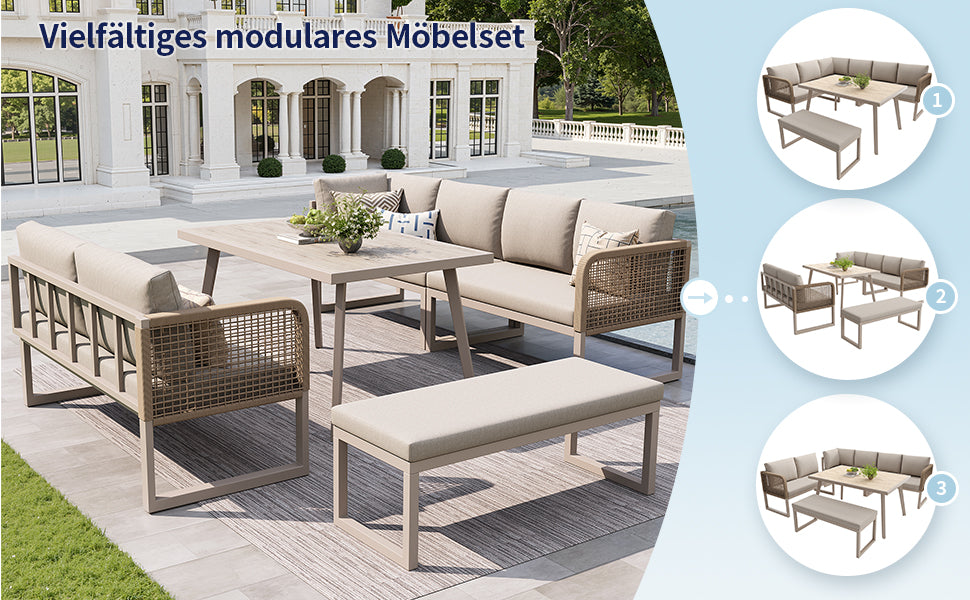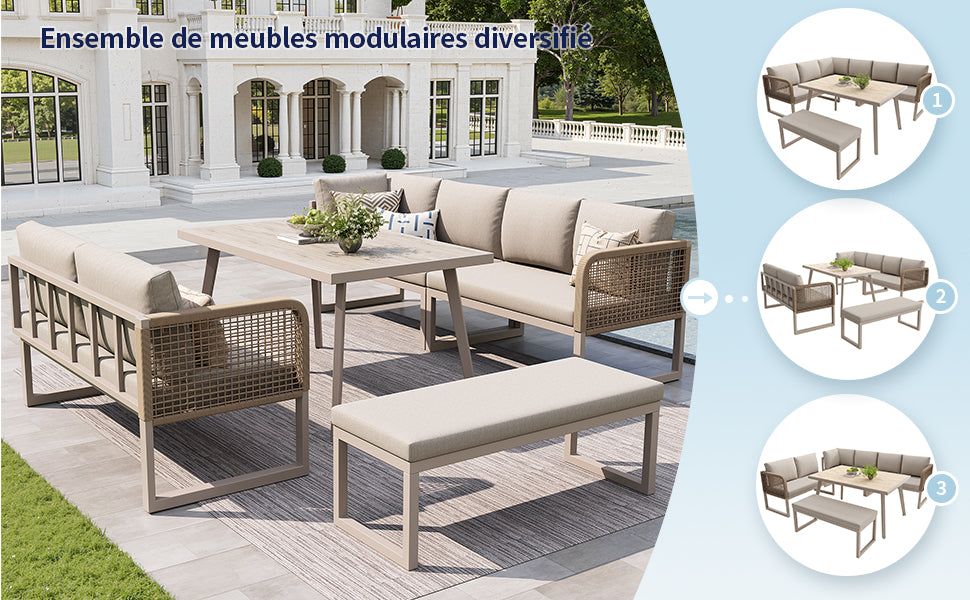 - Design modulaire et flexible : Composez votre espace selon vos besoins grâce aux éléments indépendants. Passez d’une configuration en L à une disposition linéaire en un clin d’œil, pour s’adapter à toutes les occasions et à tous les espaces extérieurs.