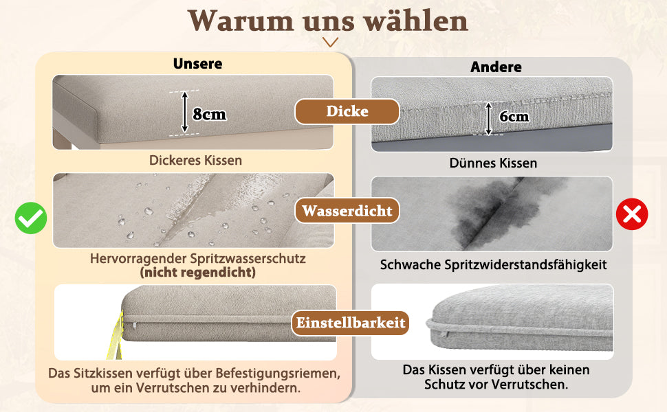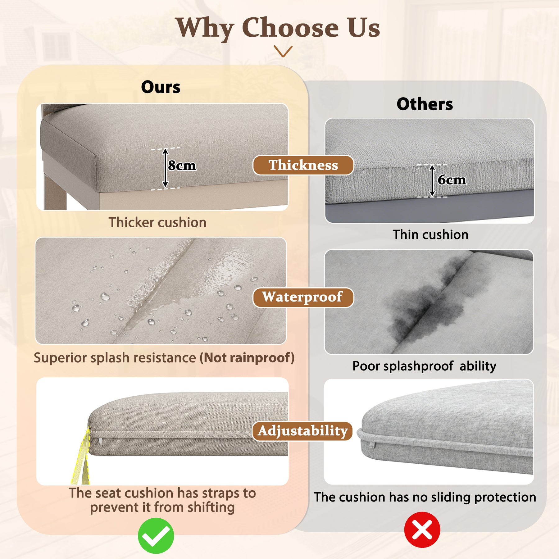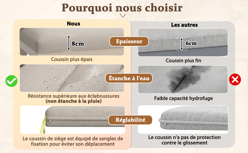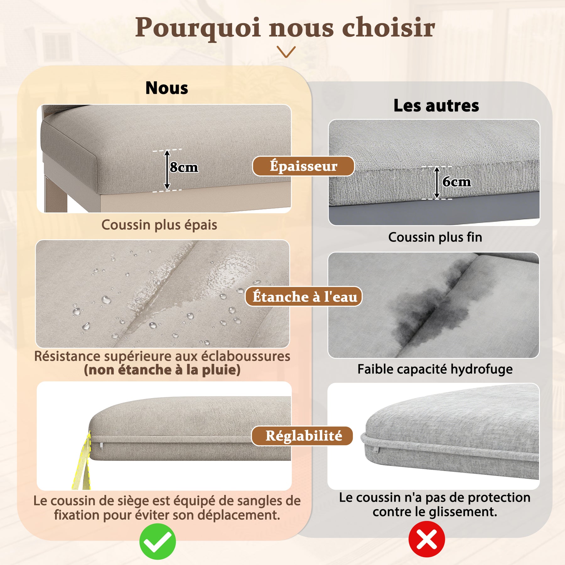 Confort et résistance à toute épreuve : Les coussins d’assise de 8 cm d’épaisseur, déhoussables et lavables en machine, offrent un confort exceptionnel tout en résistant à l’eau et aux éclaboussures. Fini le stress des averses imprévues ou des taches accidentelles !