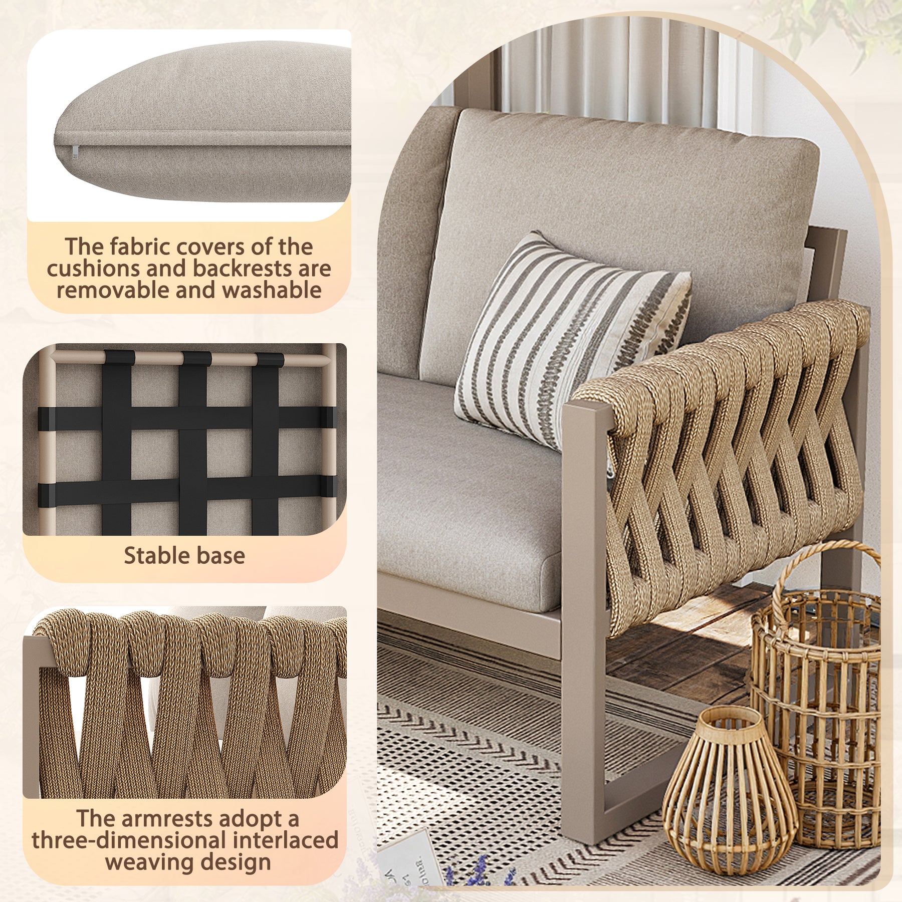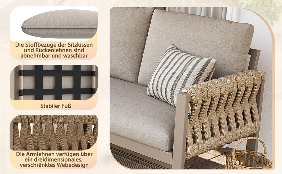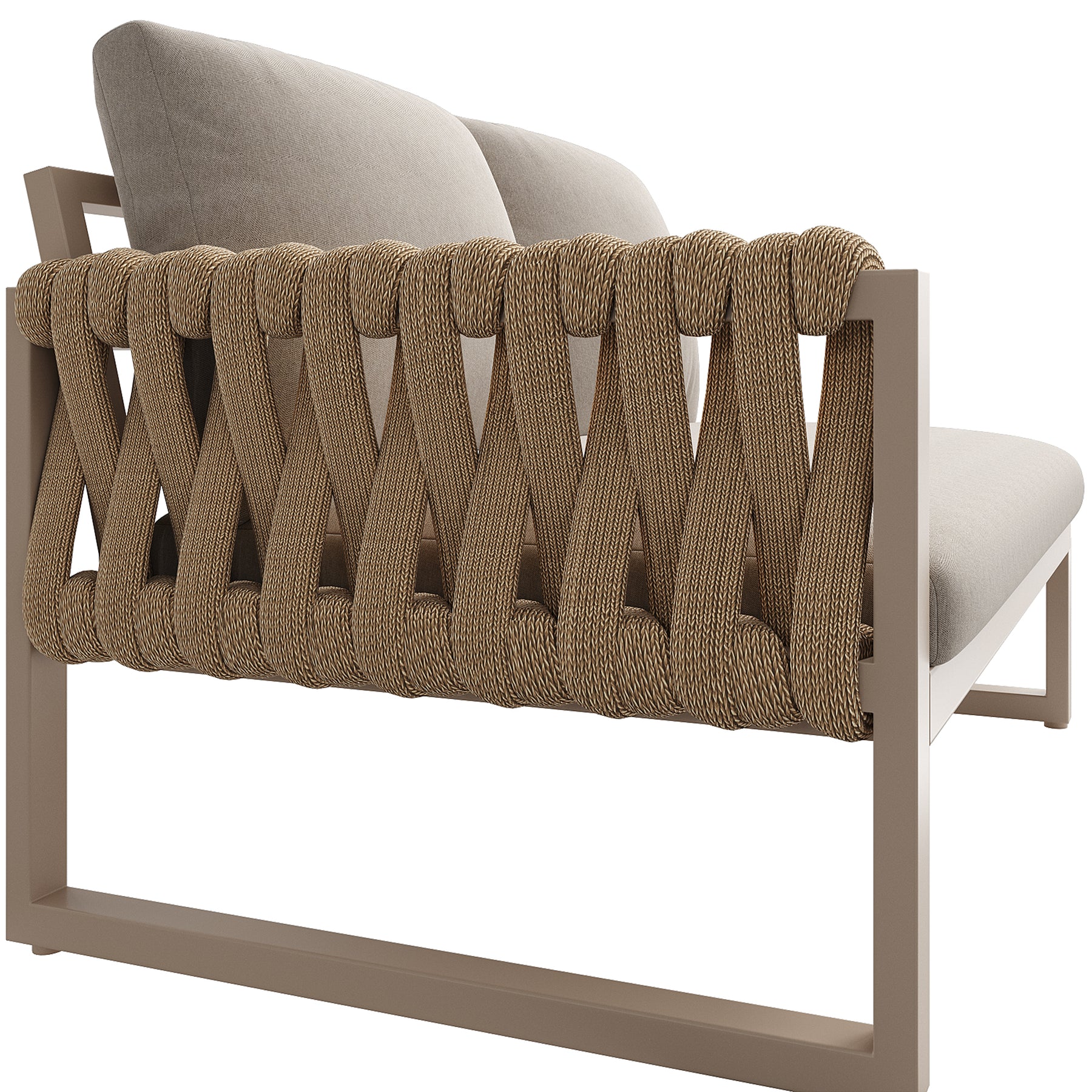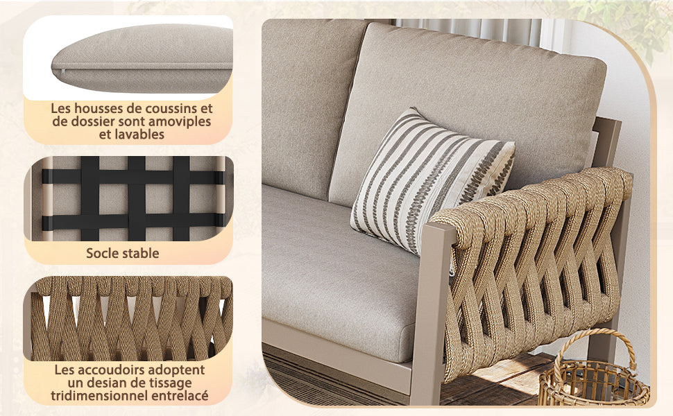 Matériaux haut de gamme : La structure en métal robuste et les accoudoirs tressés en 3D garantissent une durabilité exceptionnelle, même en usage intensif extérieur. L’oléfine utilisée pour les coussins assure douceur, résistance et longévité.