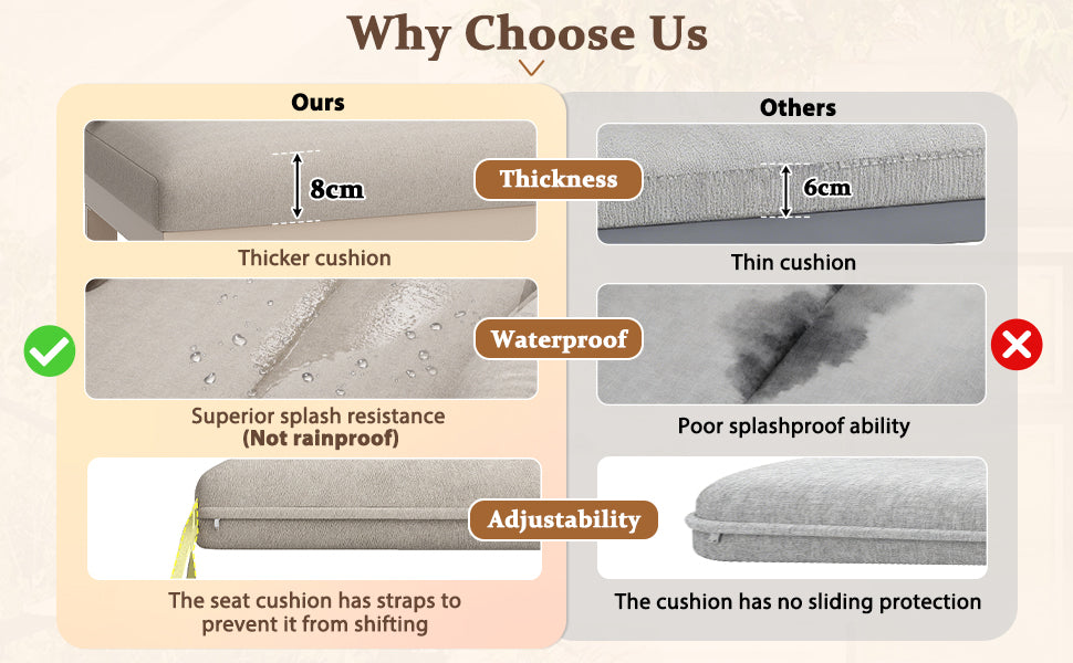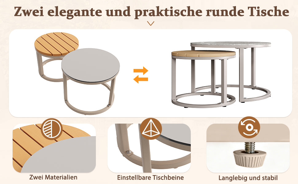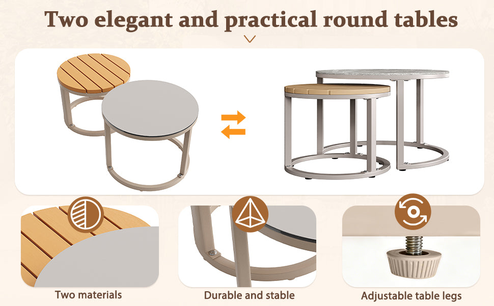Stabilité et sécurité : Les coussins sont équipés de bandes antidérapantes pour éviter tout glissement, et les deux tables d’appoint disposent de pieds réglables pour une stabilité parfaite, même sur un sol irrégulier.