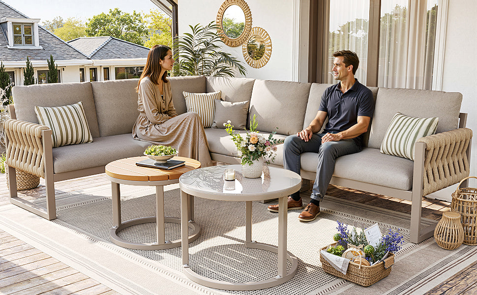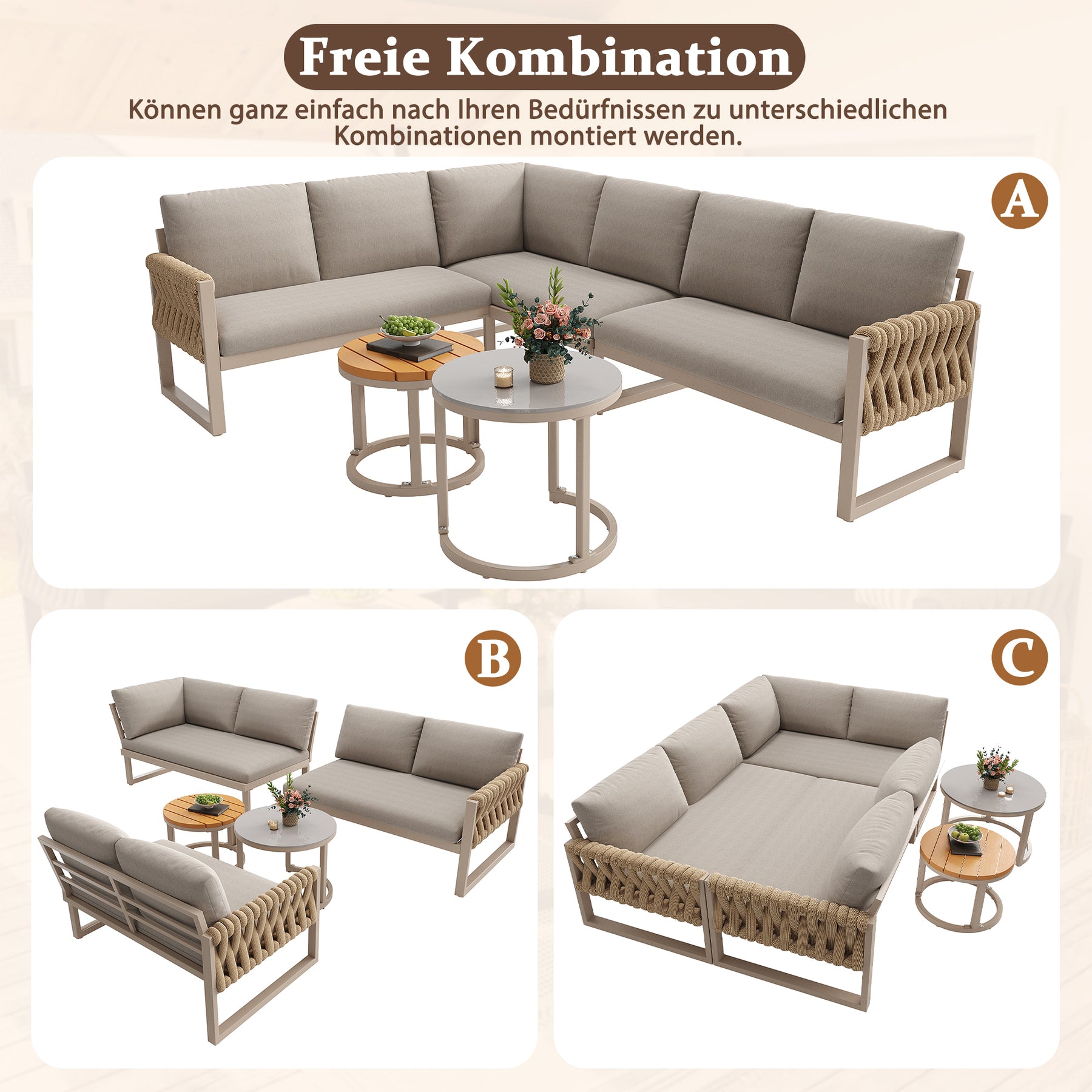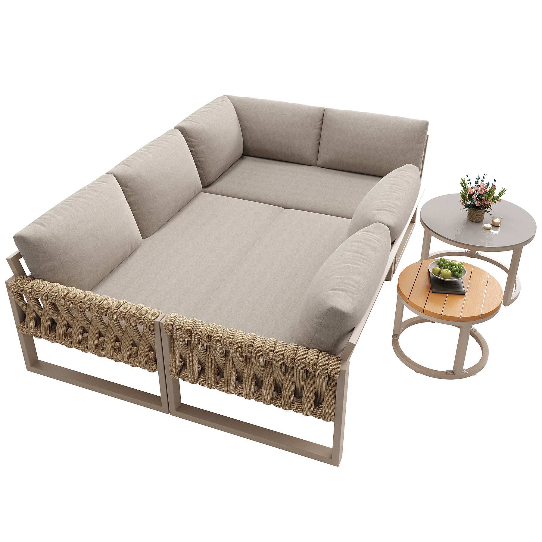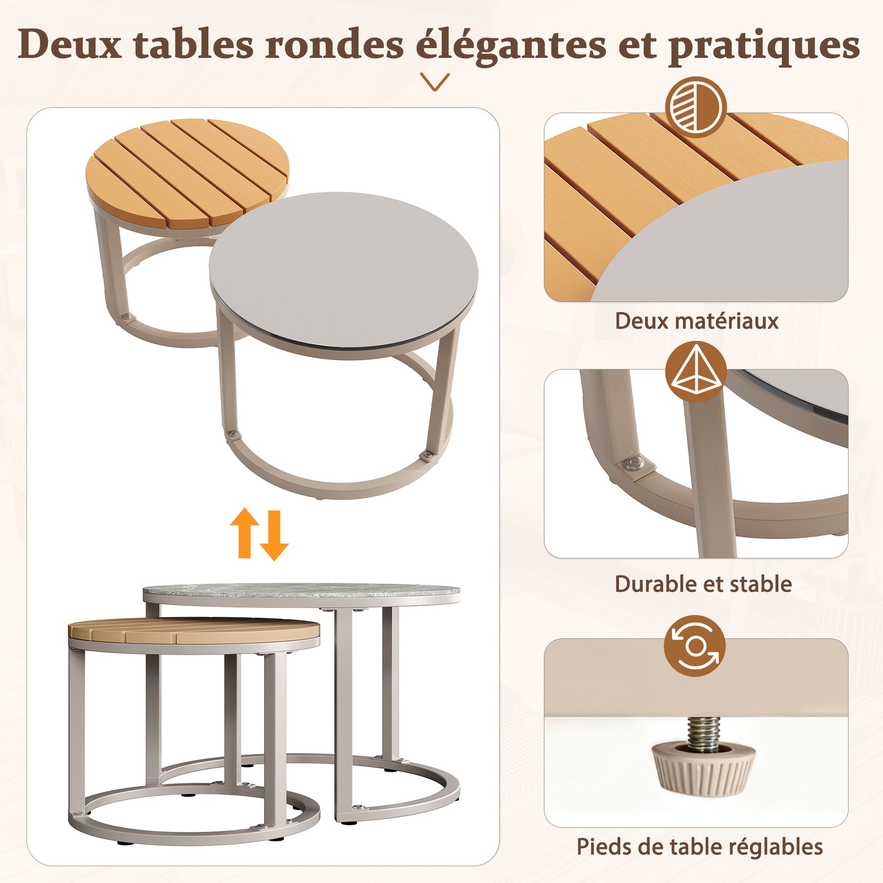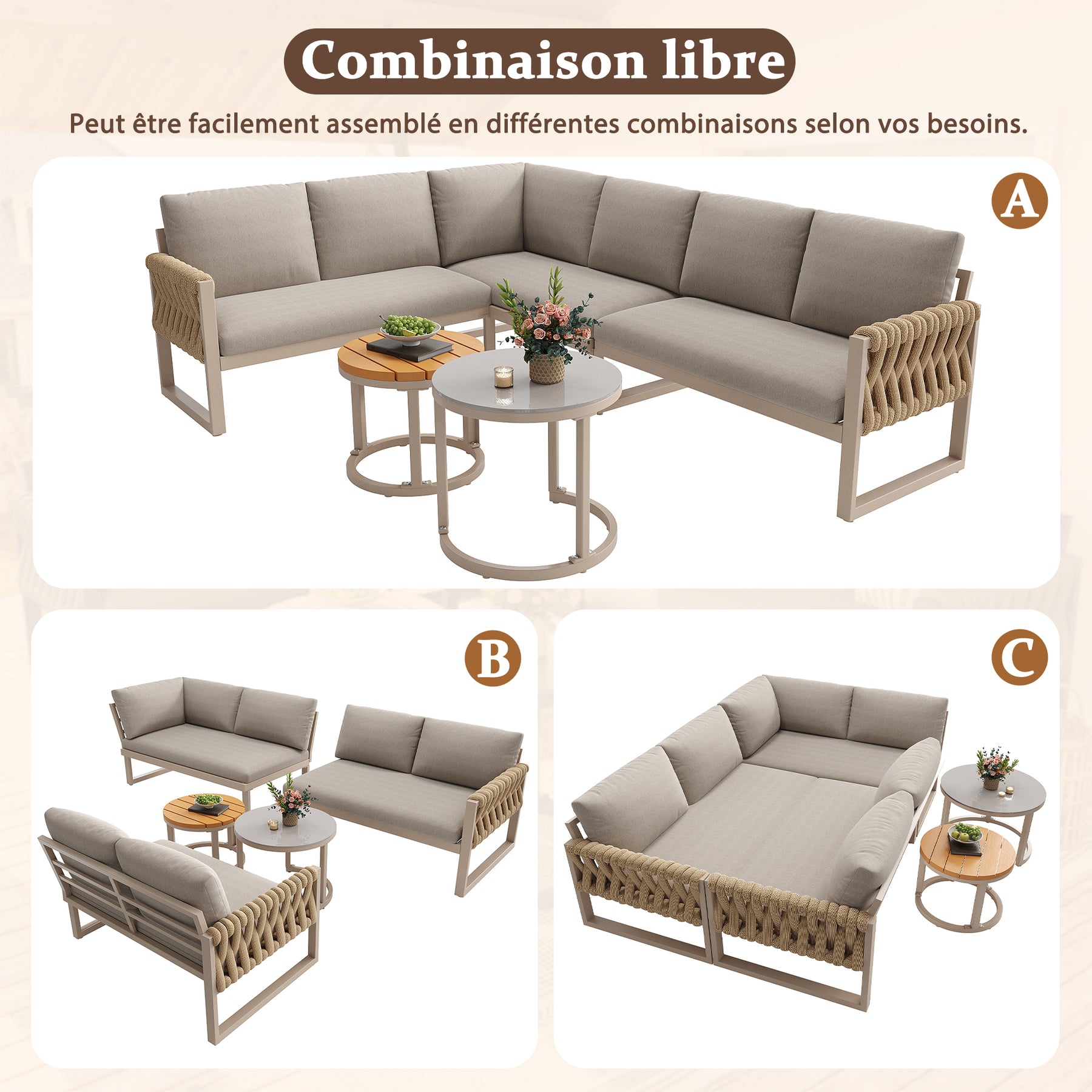 Salon de jardin beige modulable 5-6 personnes 2 tables basses gigognes, coussins déhoussables ARISELON
