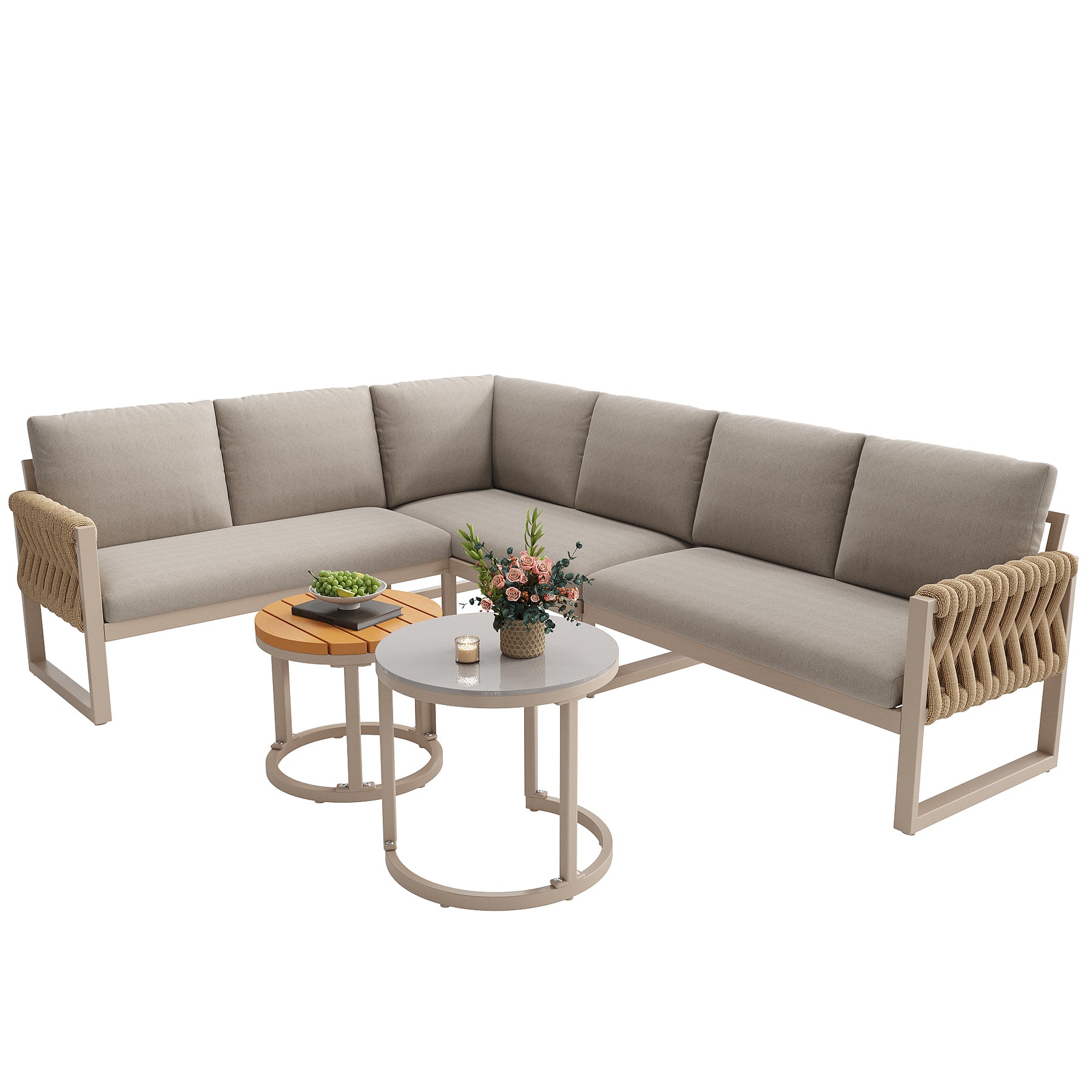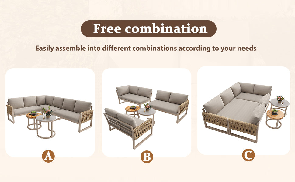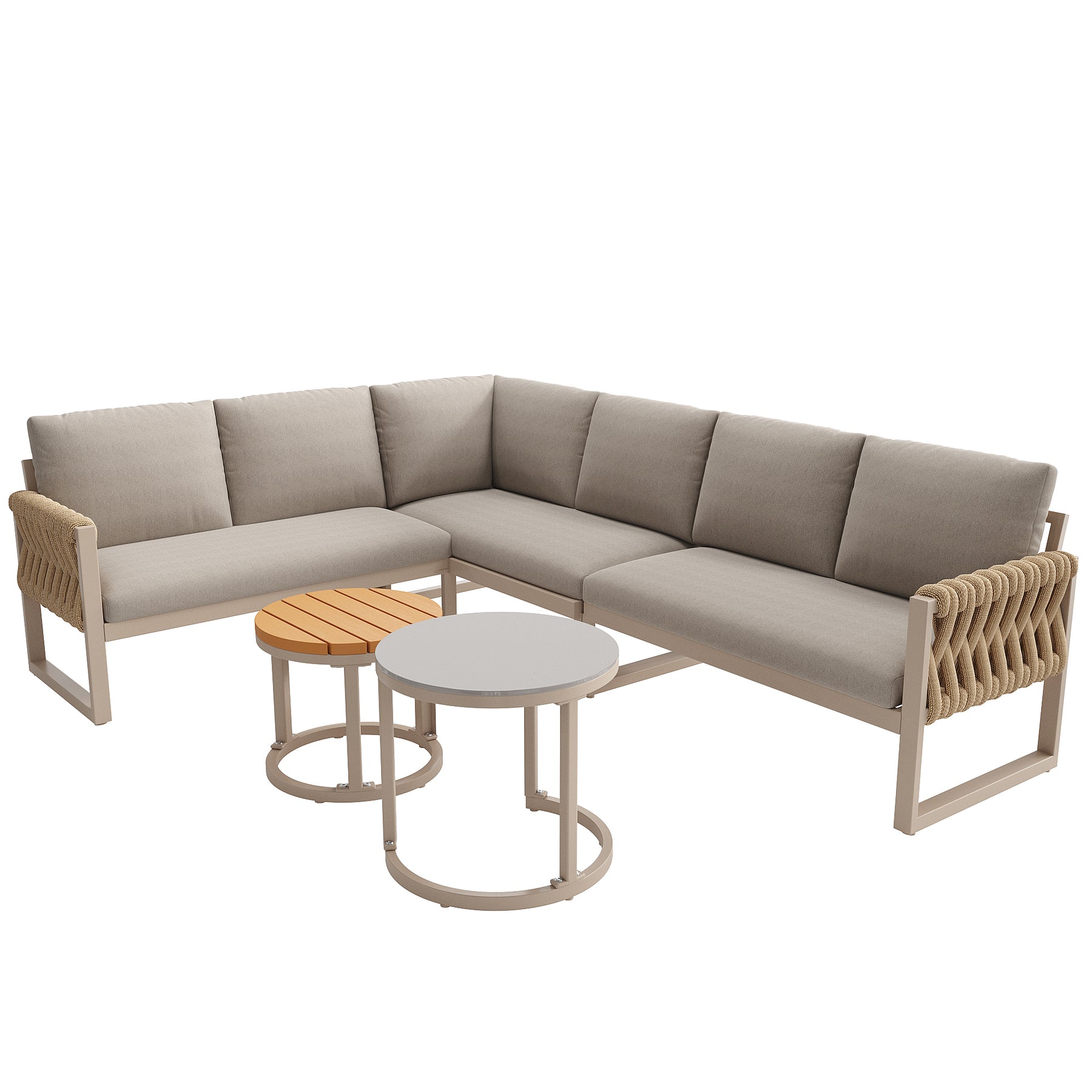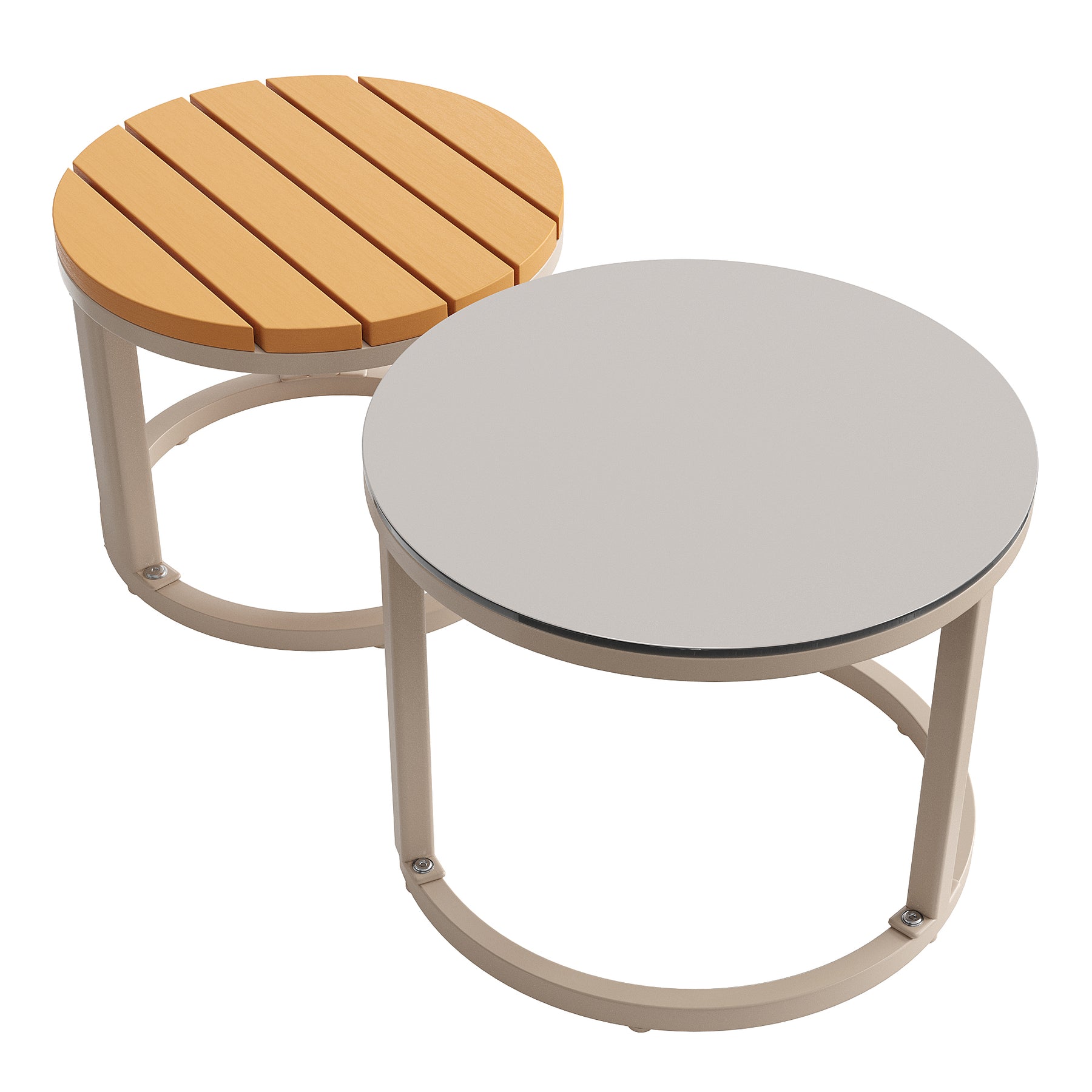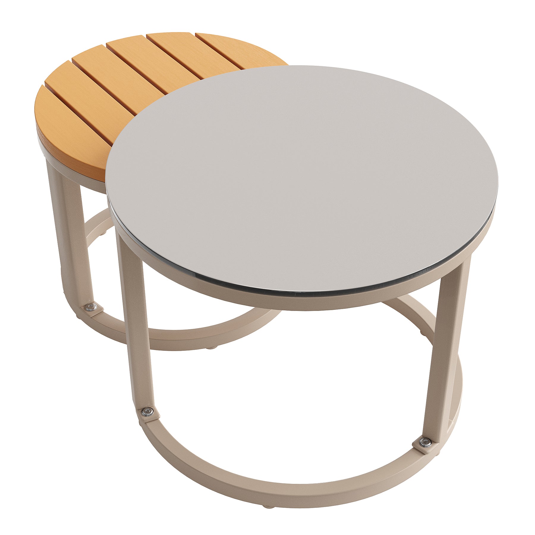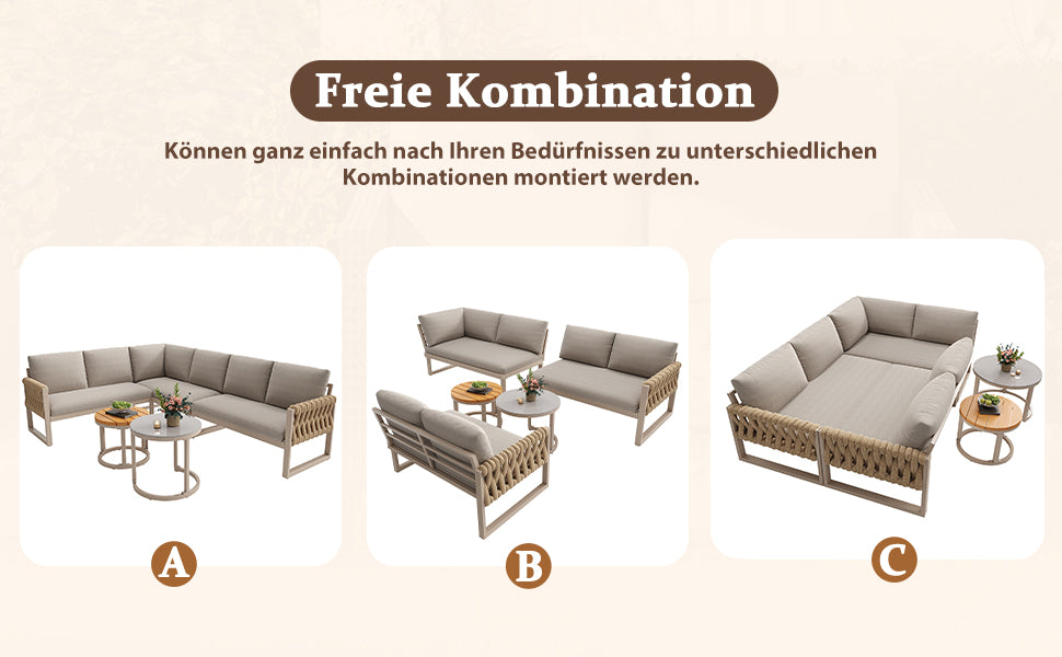 Salon de jardin beige modulable 5-6 personnes 2 tables basses gigognes, coussins déhoussables ARISELON