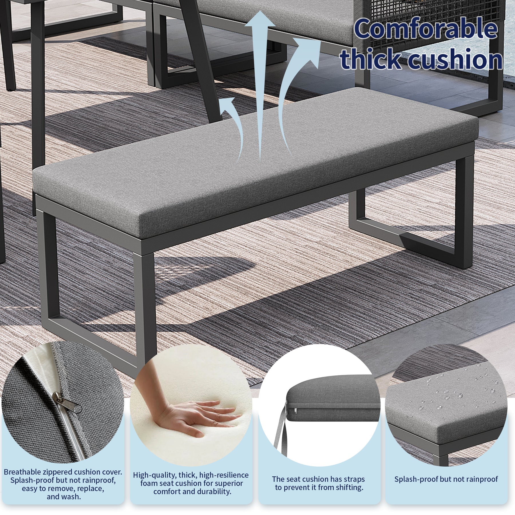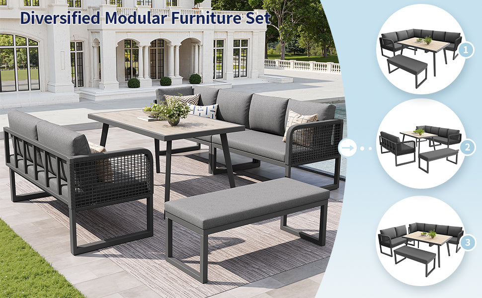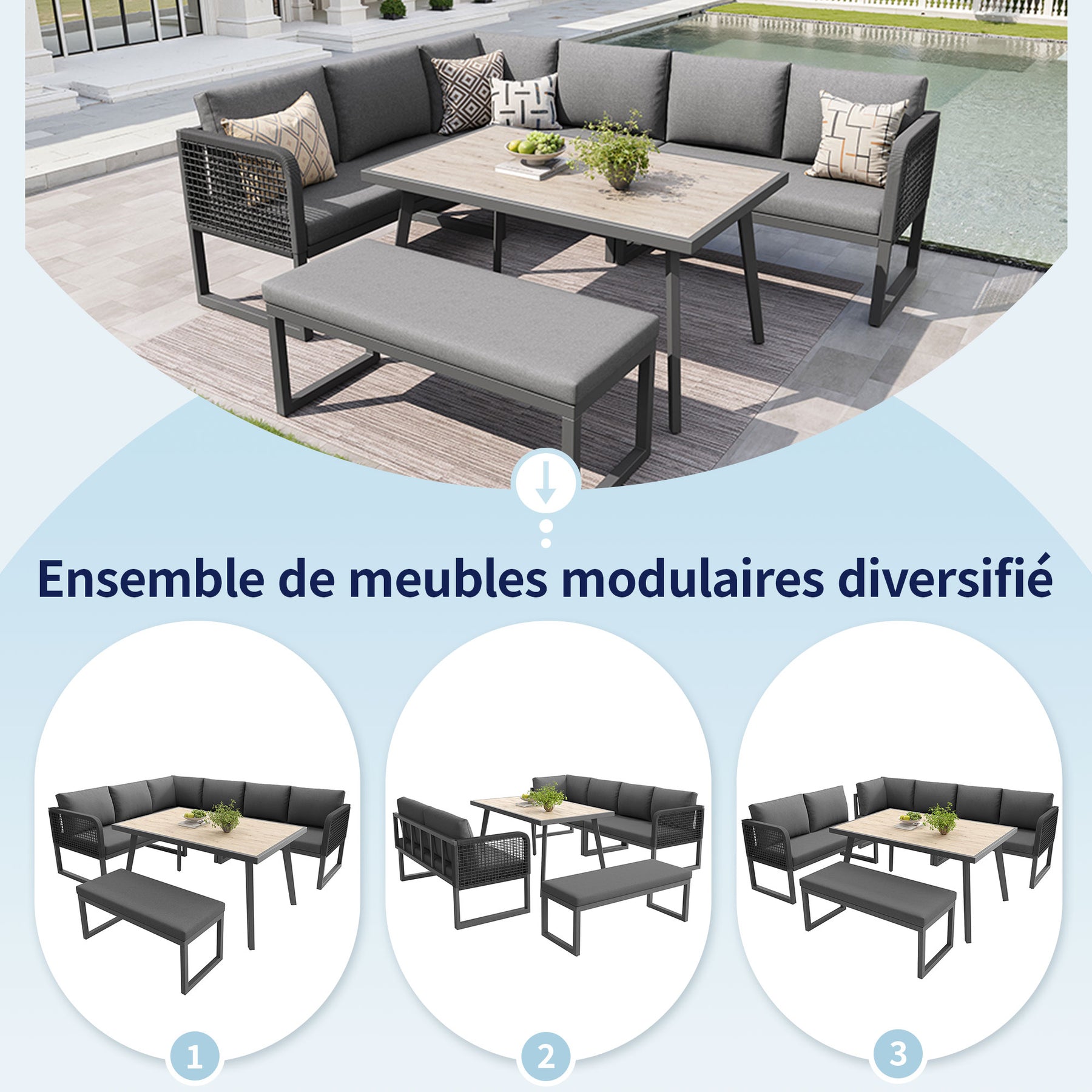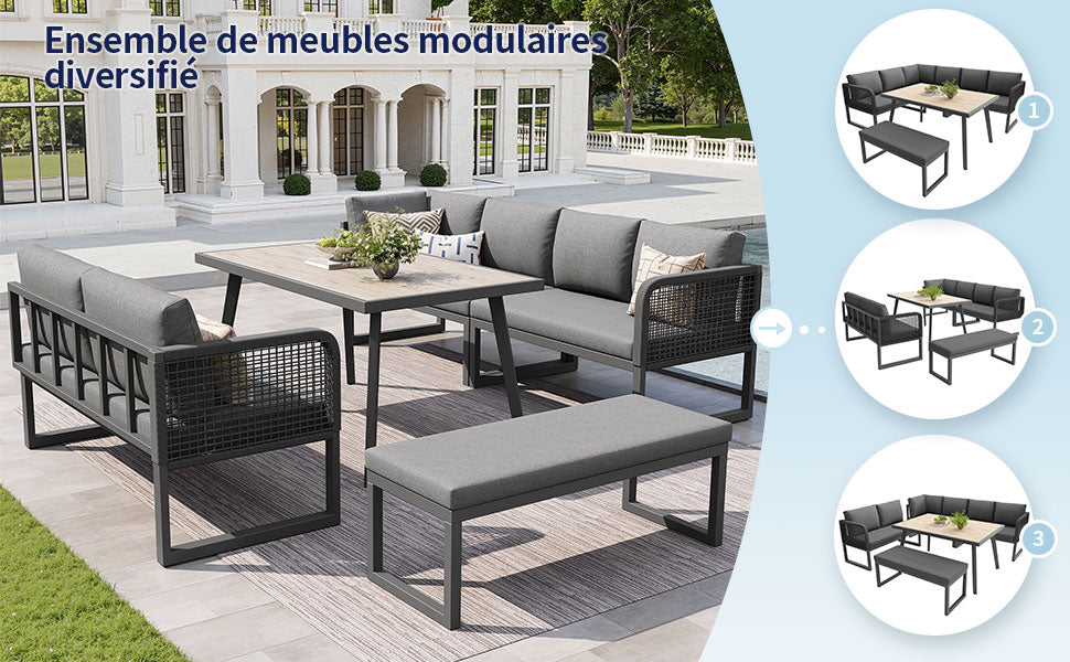 Salon de jardin modulable 6-8 personnes en rotin PE gris et table et banc, coussins épais VIVIDLUM