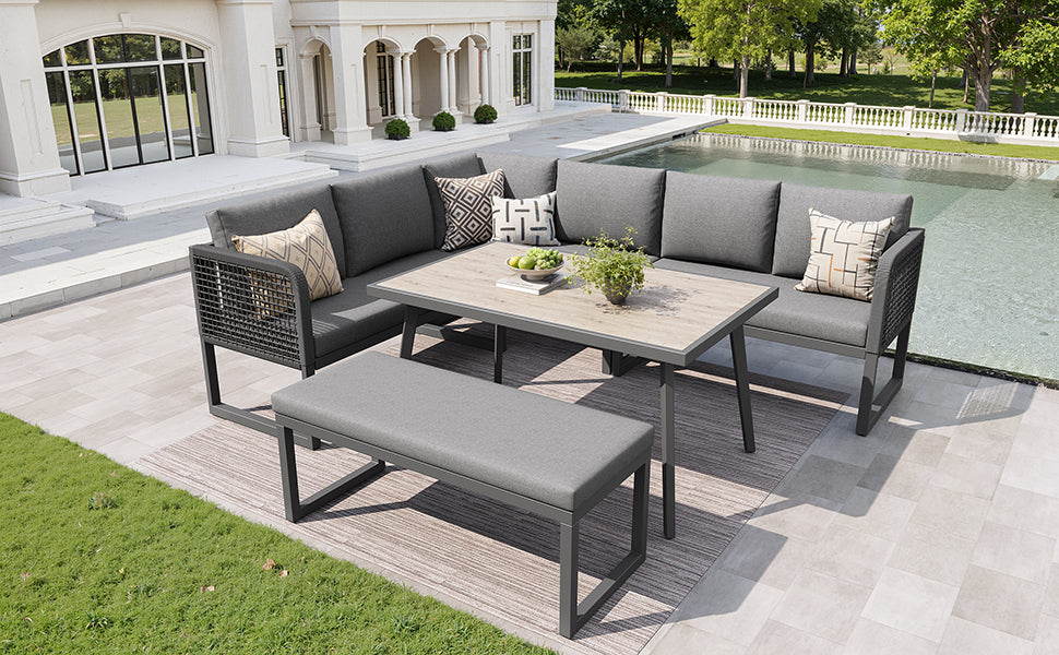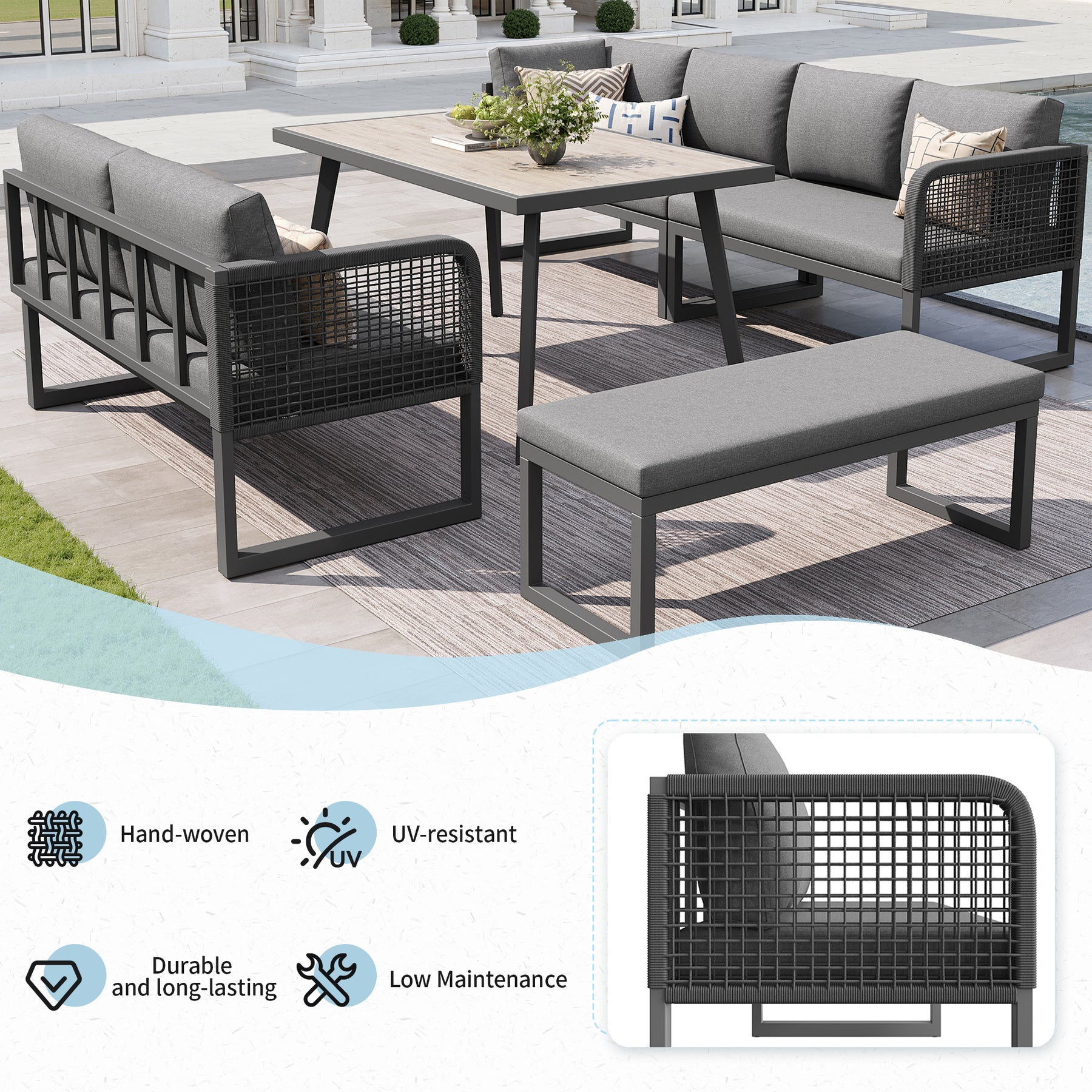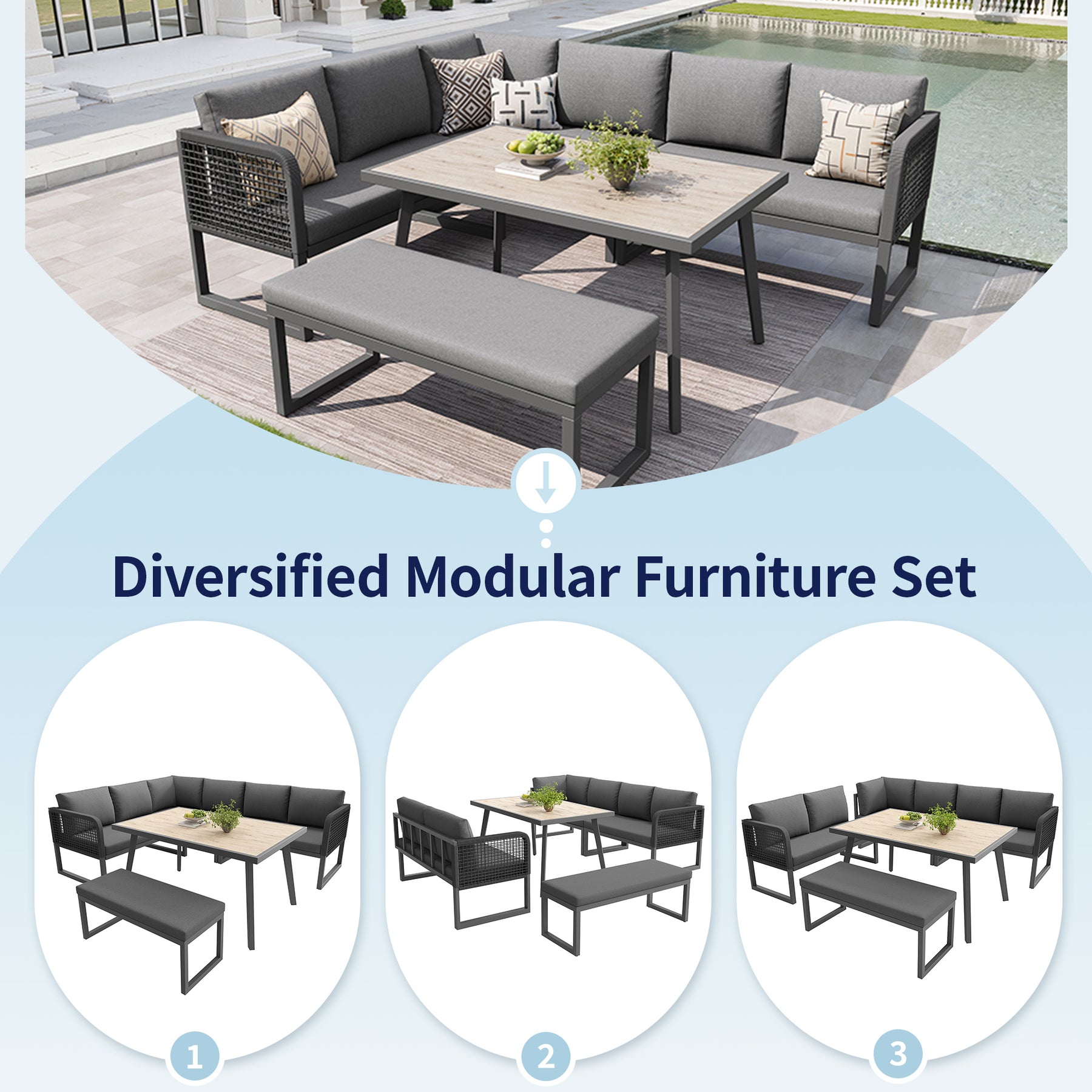 Salon de jardin modulable 6-8 personnes en rotin PE gris et table et banc, coussins épais VIVIDLUM