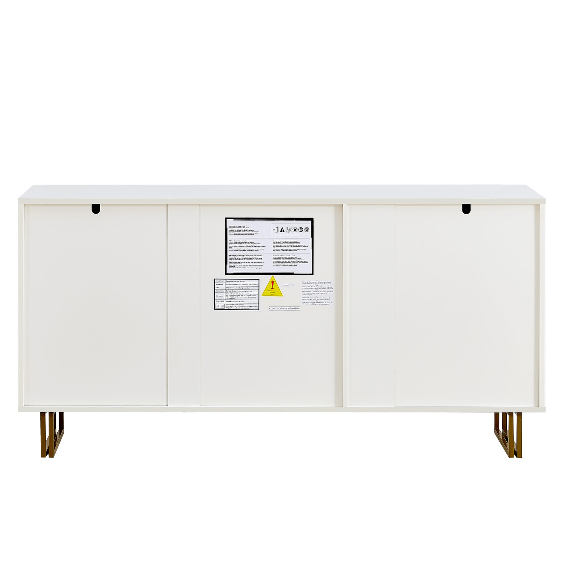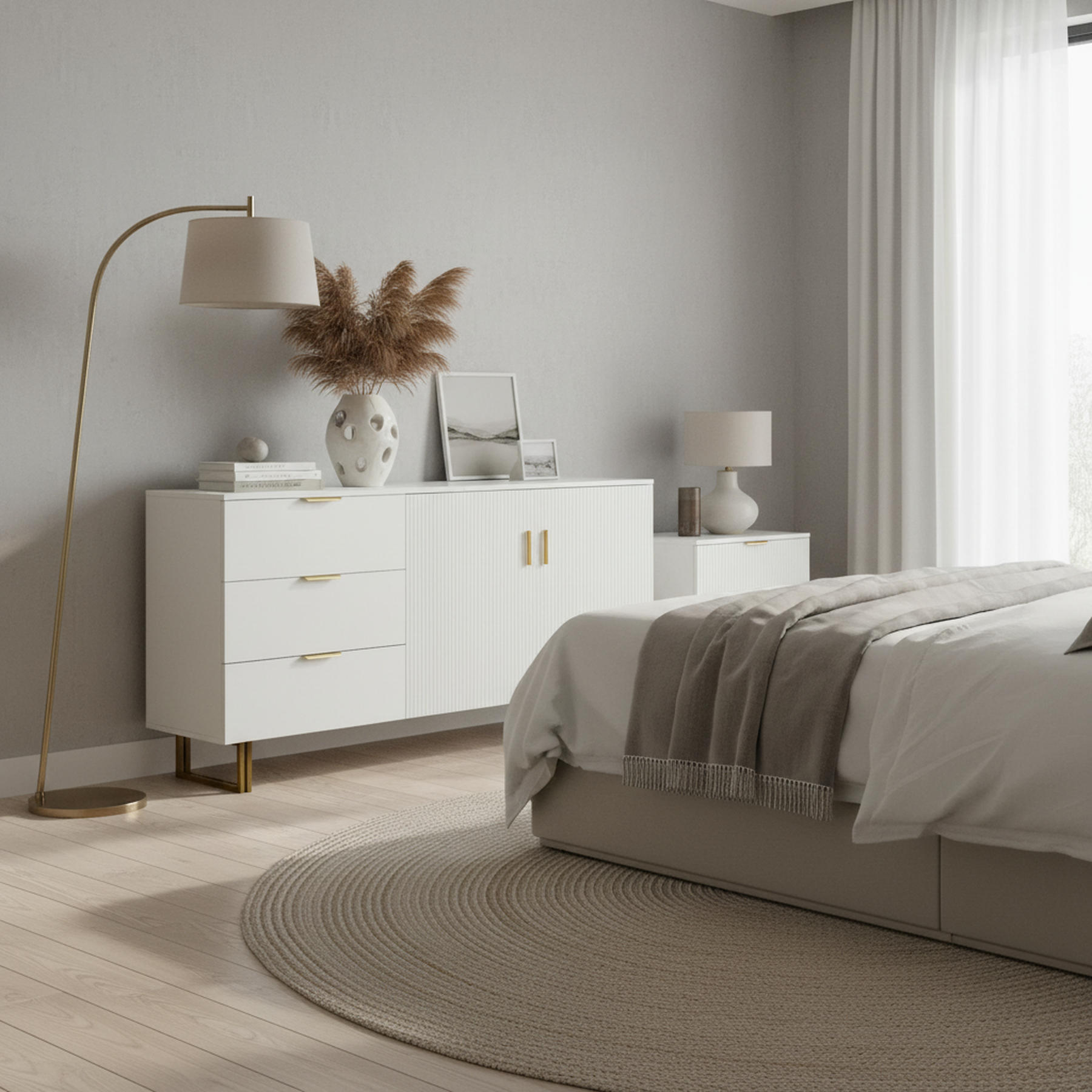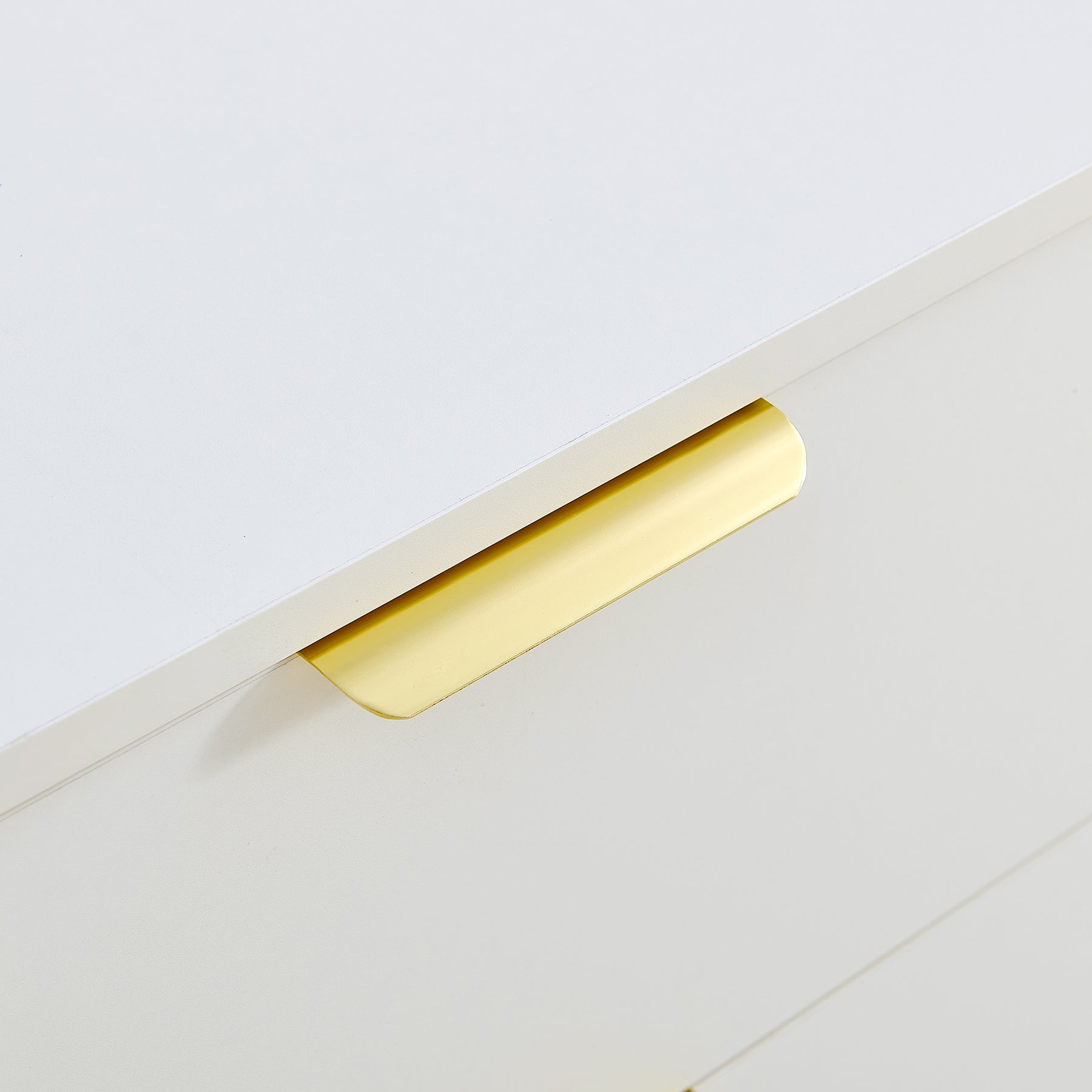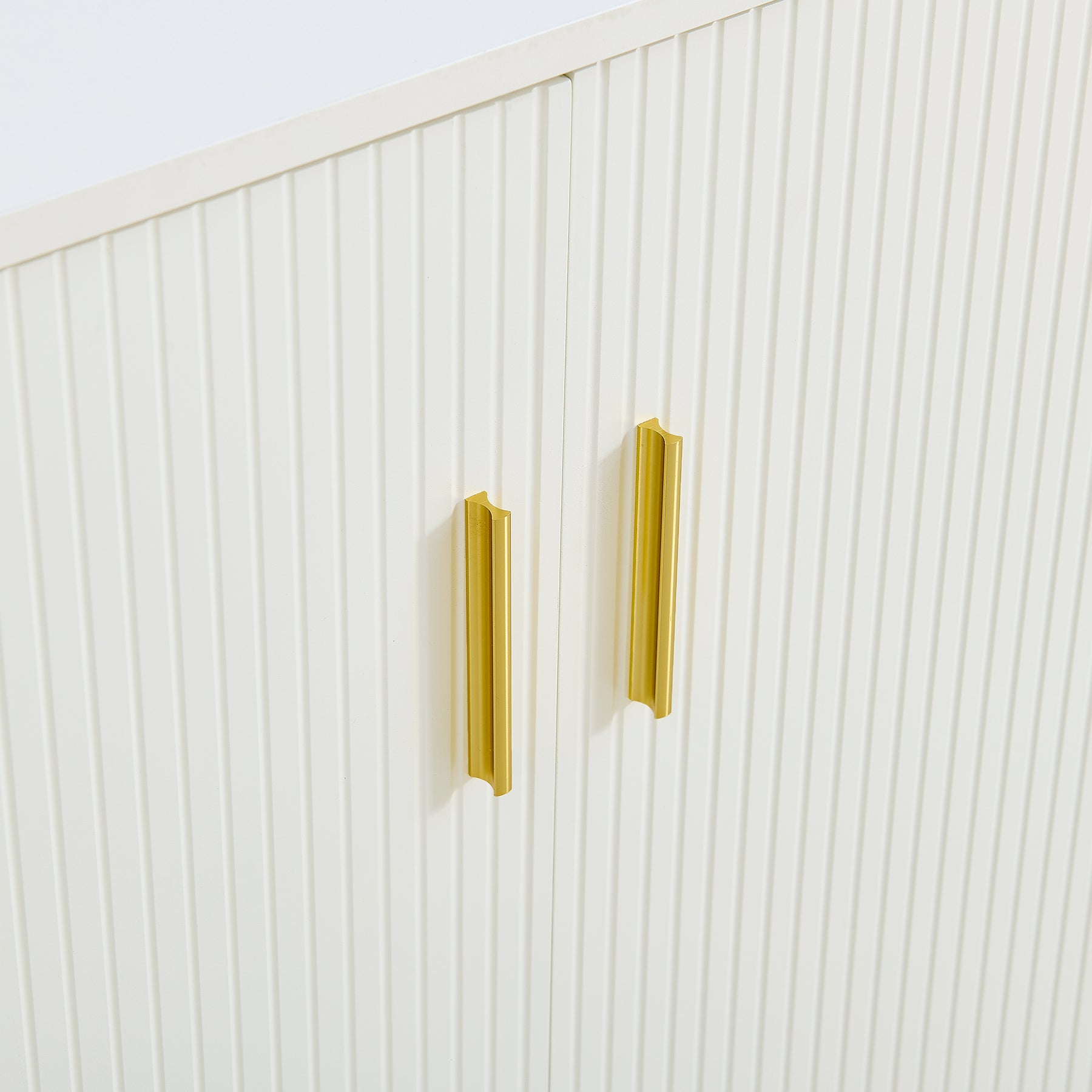 Buffet blanc laqué avec rainures verticales, tiroirs et accents dorés - design moderne FULLERENE