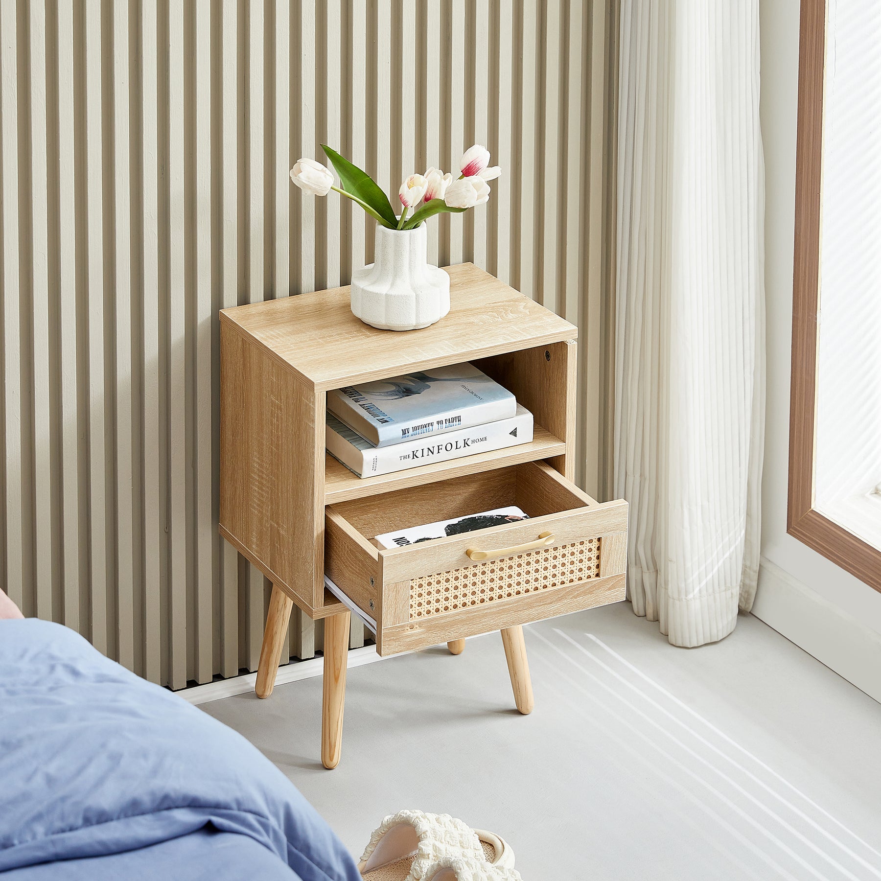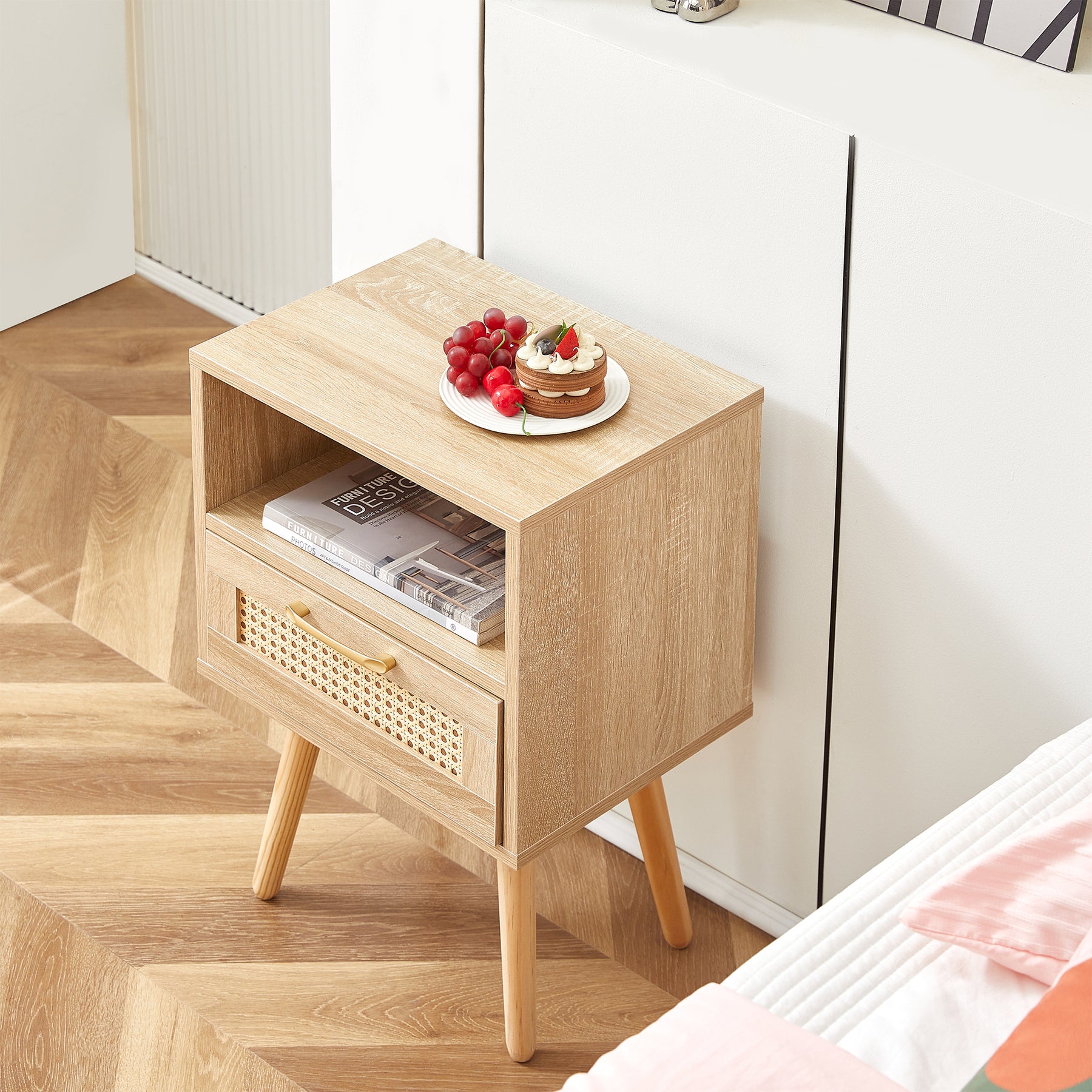 Table de chevet en rotin avec tiroir, pieds en bois massif 40x30x55cm TRAVERSEIA