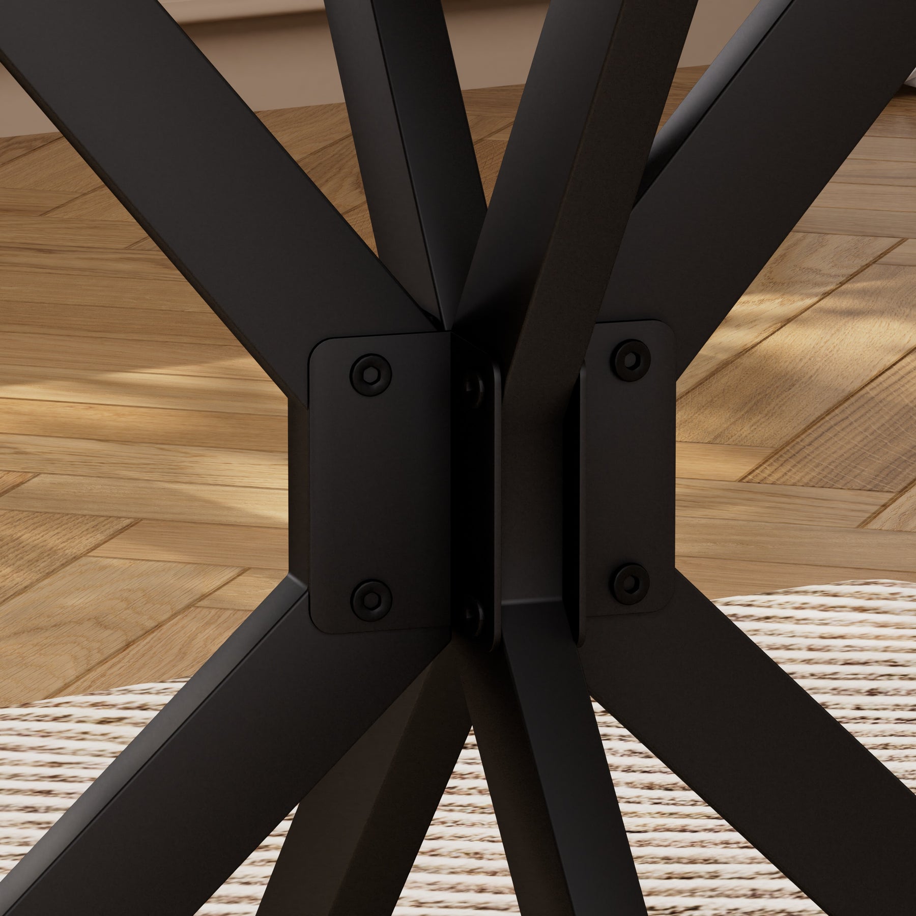 Cette table à manger ronde allie un style vintage chaleureux à une esthétique moderne et épurée. Le plateau de 90 cm au fini marron rustique offre une surface accueillante, idéale pour 2 à 4 personnes, et son design compact est parfait pour les petits espaces comme les cuisines ou les coins repas. La table est soutenue par une base robuste composée de pieds en métal noir entrecroisés (style étoile) qui garantissent une excellente stabilité et une longue durée de vie. les pieds sont munis de patins réglables pour protéger vos sols. Facile à assembler et à entretenir grâce à sa surface laminée résistante à l'eau et aux rayures, cette table est un choix polyvalent pour la maison ou le bureau.