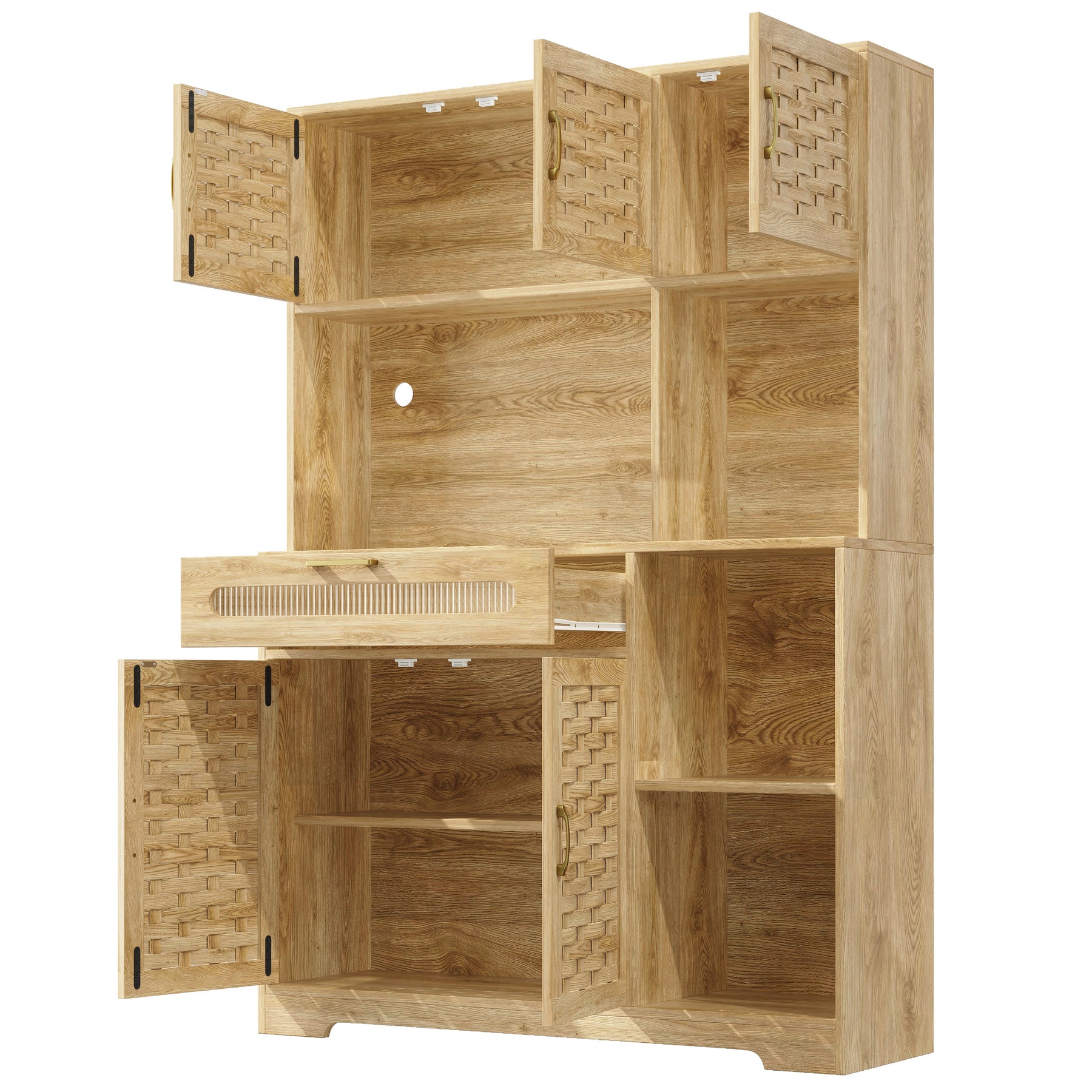 Ce buffet haut est un meuble de rangement chaleureux et fonctionnel, idéal pour votre cuisine, salle à manger ou salon. Sa principale caractéristique réside dans ses élégantes portes en MDF avec motif tressé qui rappellent le rotin, apportant une touche bohème-chic à votre intérieur. La section ouverte centrale est magnifiée par un éclairage led intelligent contrôlable par application, parfait pour mettre en valeur des objets de décoration. Fabriqué en MDF durable avec une finition grain de bois naturelle, il offre un grand espace de rangement organisé, sécurisé par un dispositif anti-basculement.