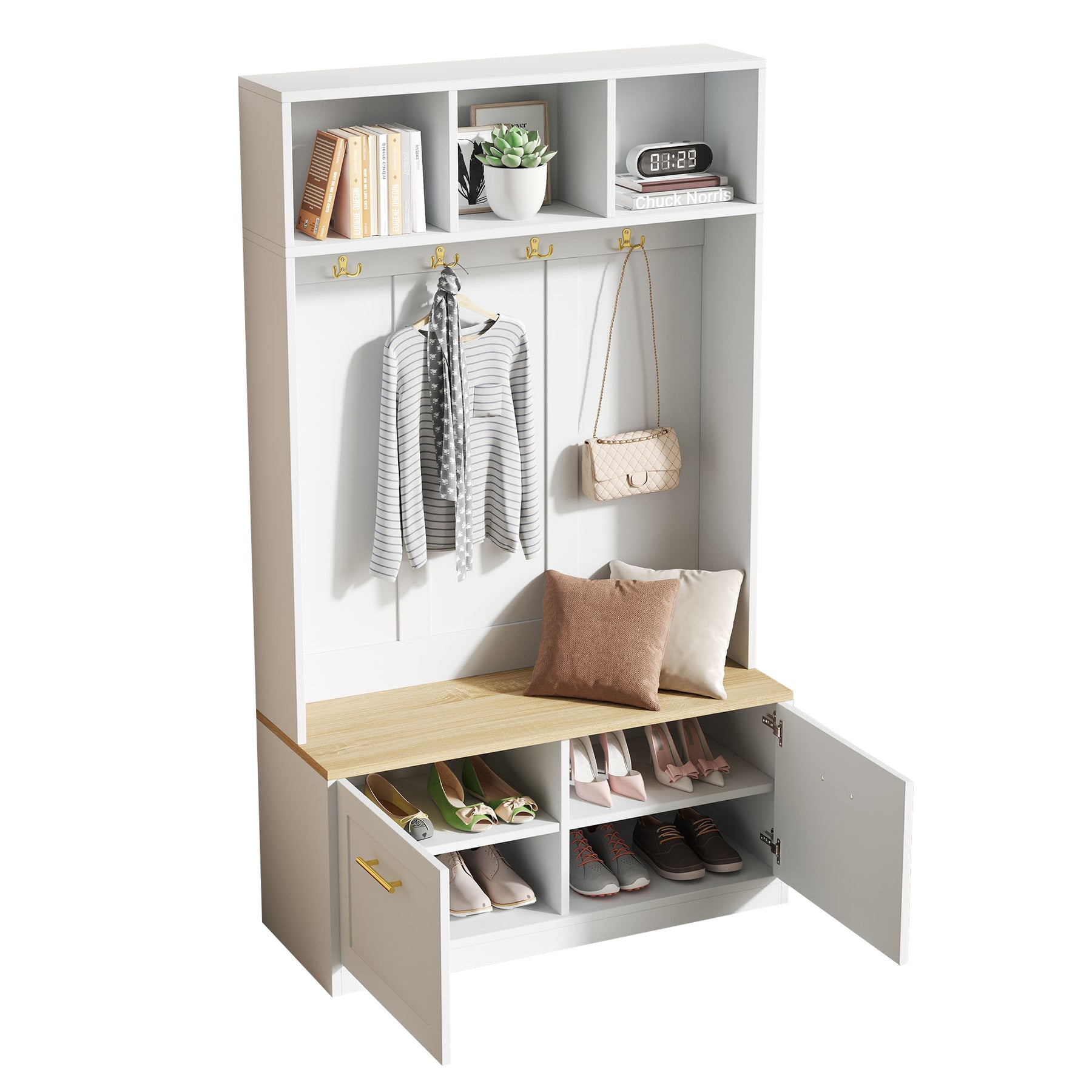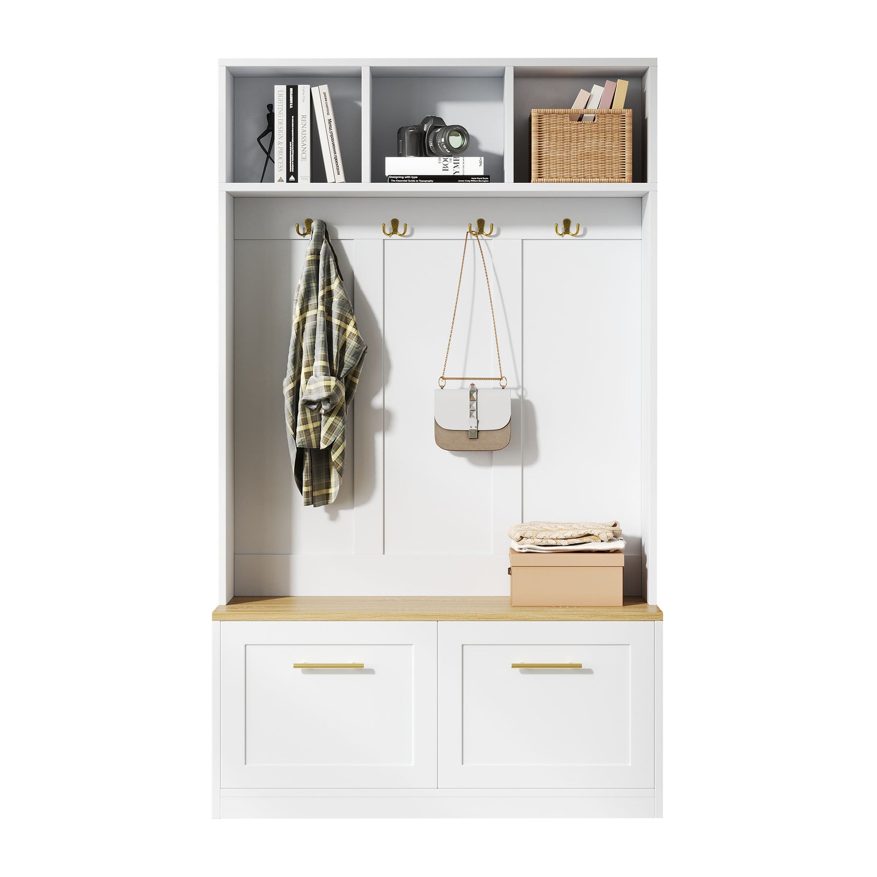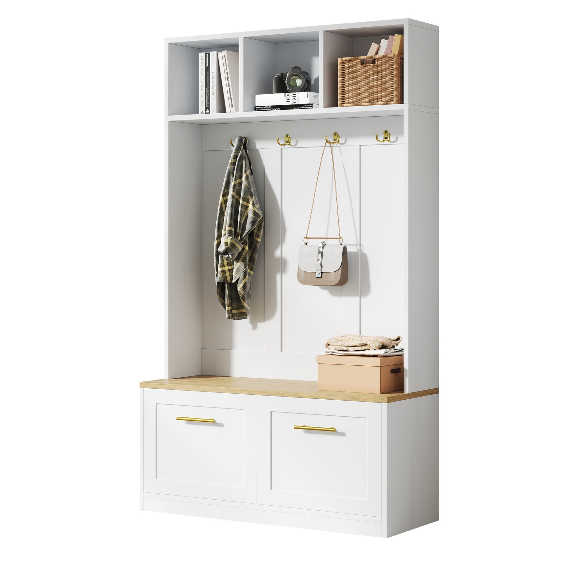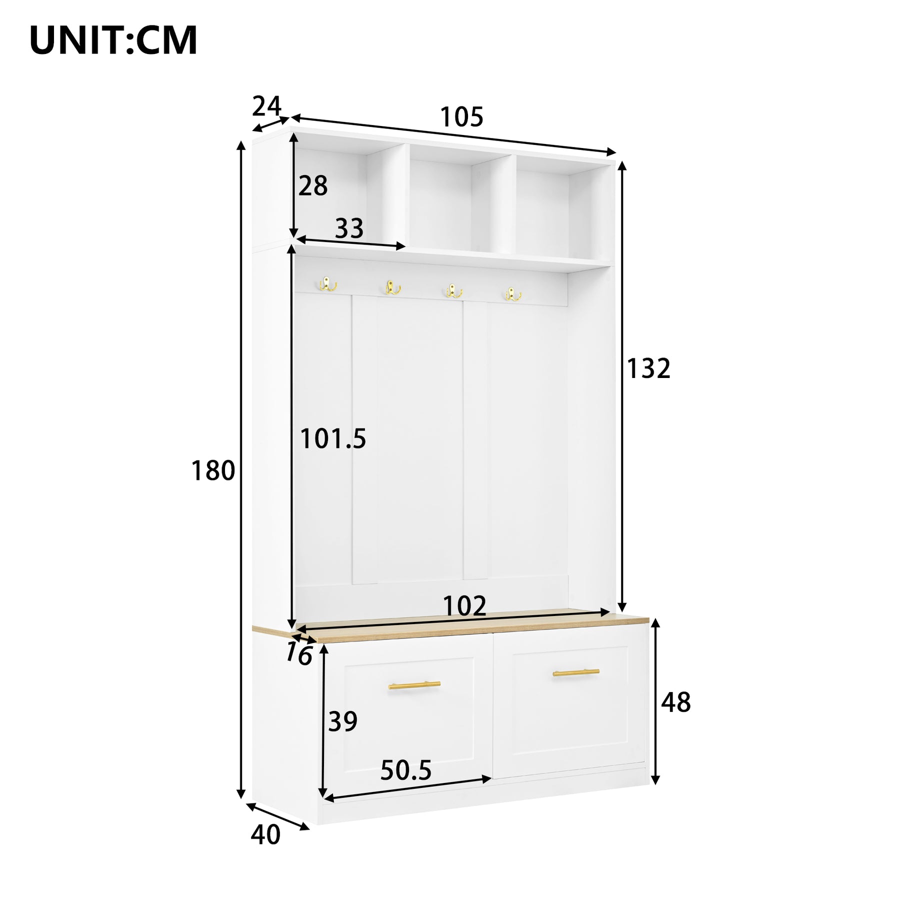 - Optimisation de l’espace : Avec ses dimensions de 105 × 40 × 180 cm, ce meuble tout-en-un offre une solution complète pour les petits espaces. Vestiaire, banc, étagères et crochets : tout est pensé pour maximiser le rangement sans encombrer votre entrée.