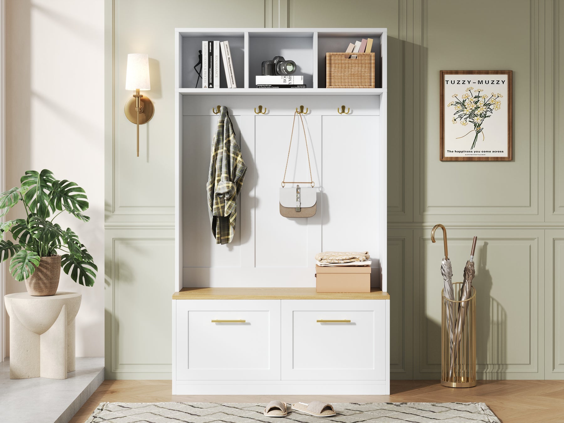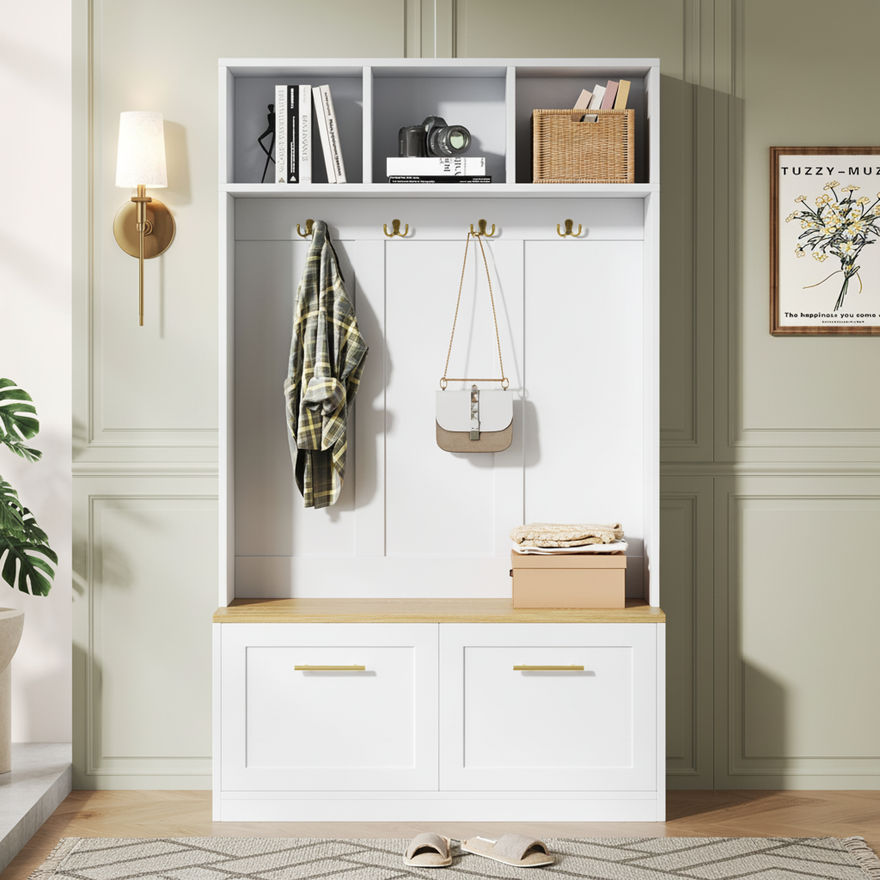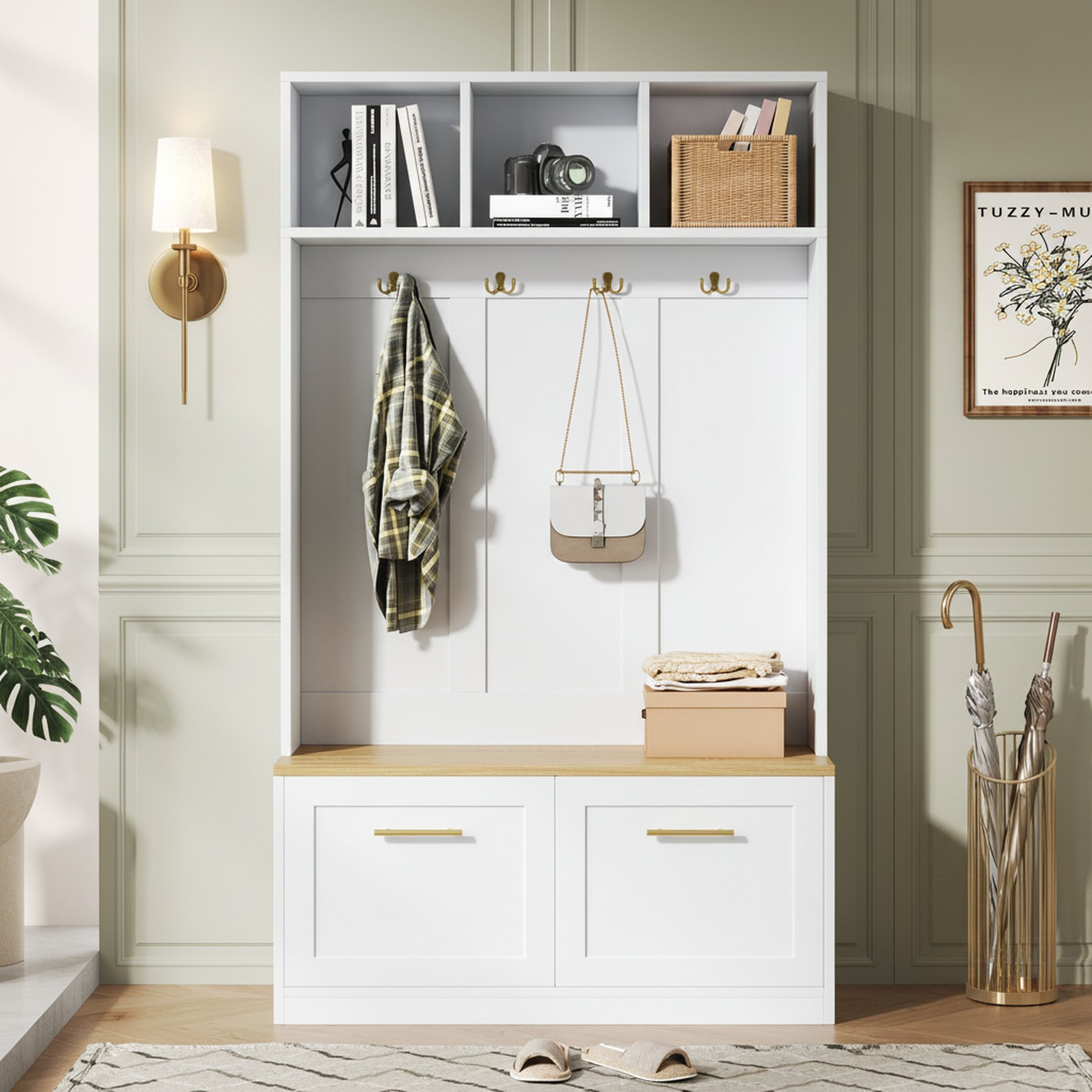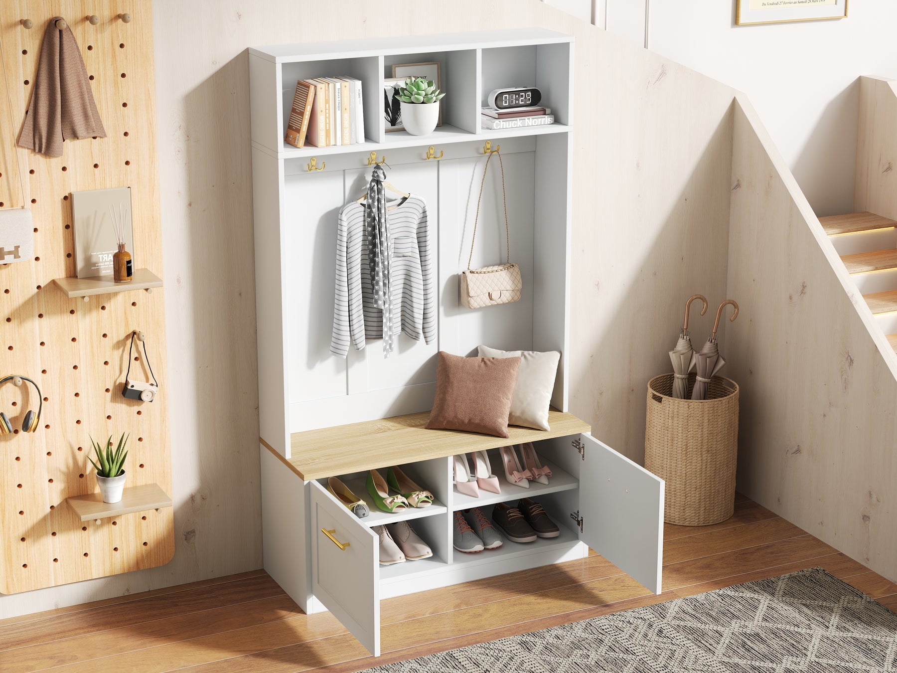 - Banc confortable intégré : Profitez d’un siège stable et pratique pour enfiler ou retirer vos chaussures en toute simplicité. Un détail qui facilite le quotidien et rend l’accueil de vos invités encore plus agréable.