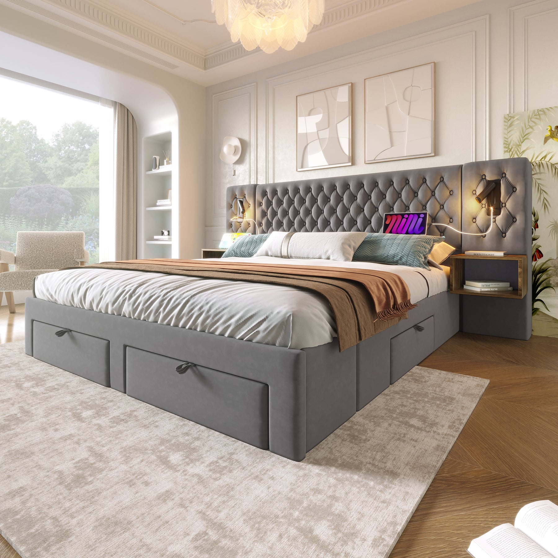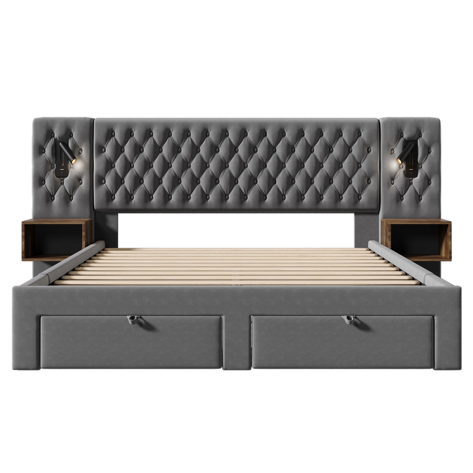 Ensemble de lit double velours gris king size 180x200cm avec 2 tables de chevet et lamps, 4 tiroirs et liseuses avec port de charge usb (matelas non inclus) HELIOSHEATH