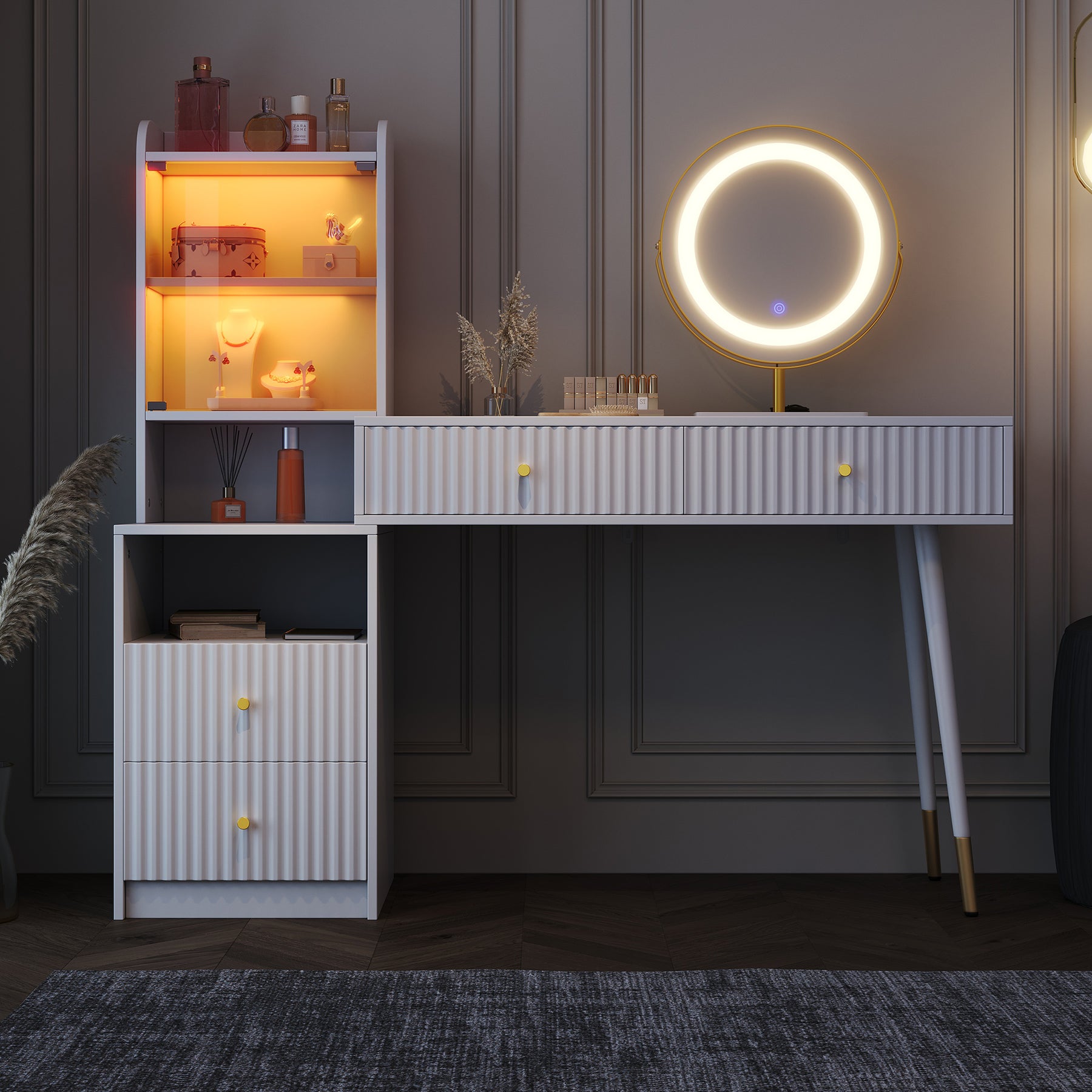 Cet ensemble de coiffeuse sophistiqué apporte une touche de luxe et de modernité à votre chambre ou dressing. Le design épuré en blanc est rehaussé par des façades de tiroirs à vagues élégantes et des poignées dorées subtiles, assurant une harmonie parfaite avec n'importe quel décor intérieur contemporain. Il est livré avec un miroir led pratique offrant trois options de lumière pour optimiser votre routine de maquillage. L'espace de rangement est généreux et bien organisé, incluant quatre tiroirs profonds et une vitrine unique avec éclairage personnalisable pour mettre en valeur vos articles préférés.