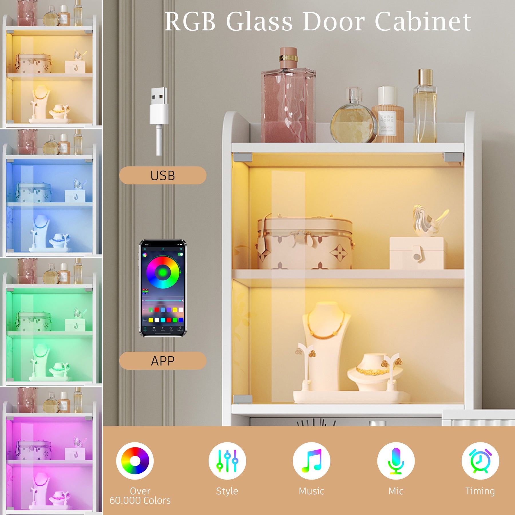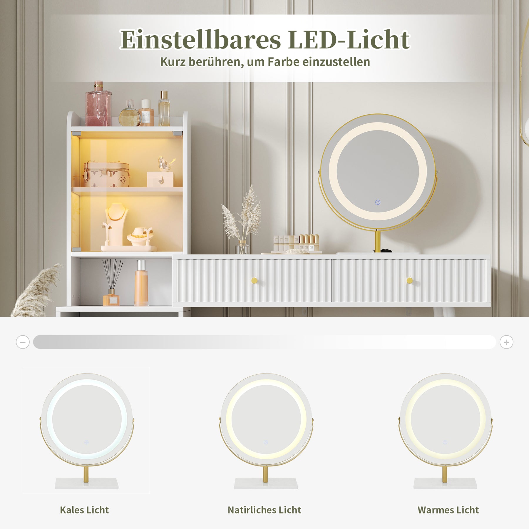 Coiffeuse blanc avec miroir éclairage LED, 4 tiroirs et vitrine personnalisable SIMULAT