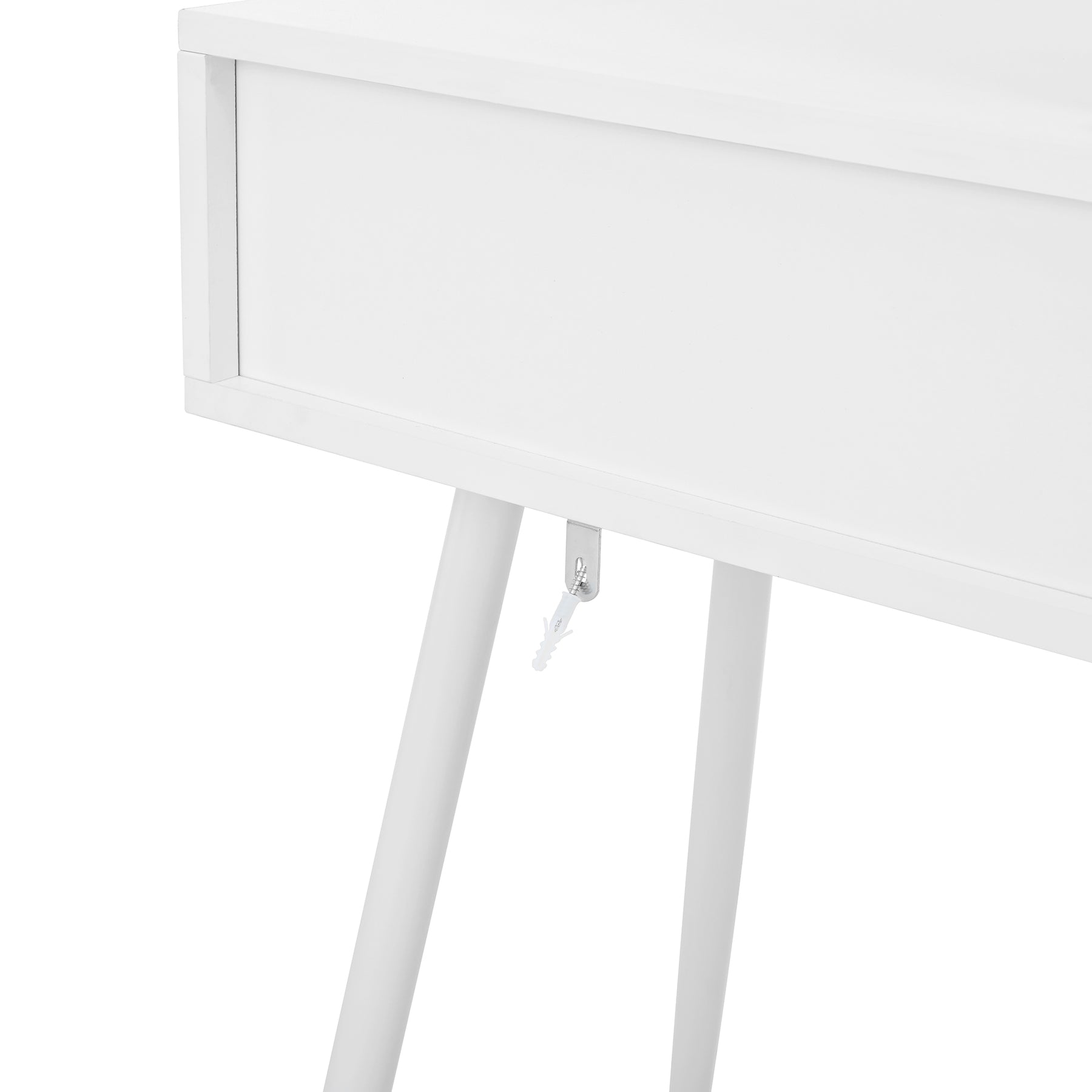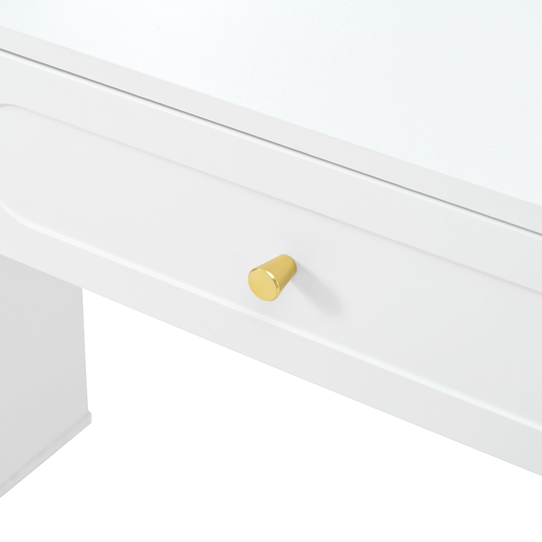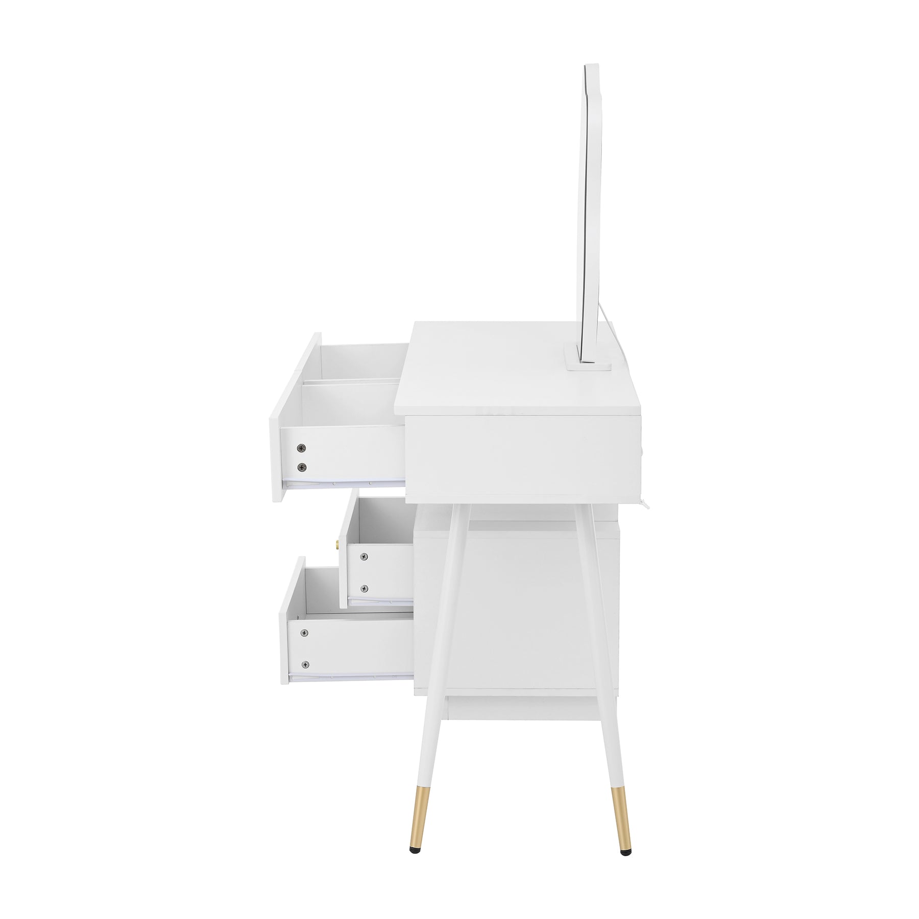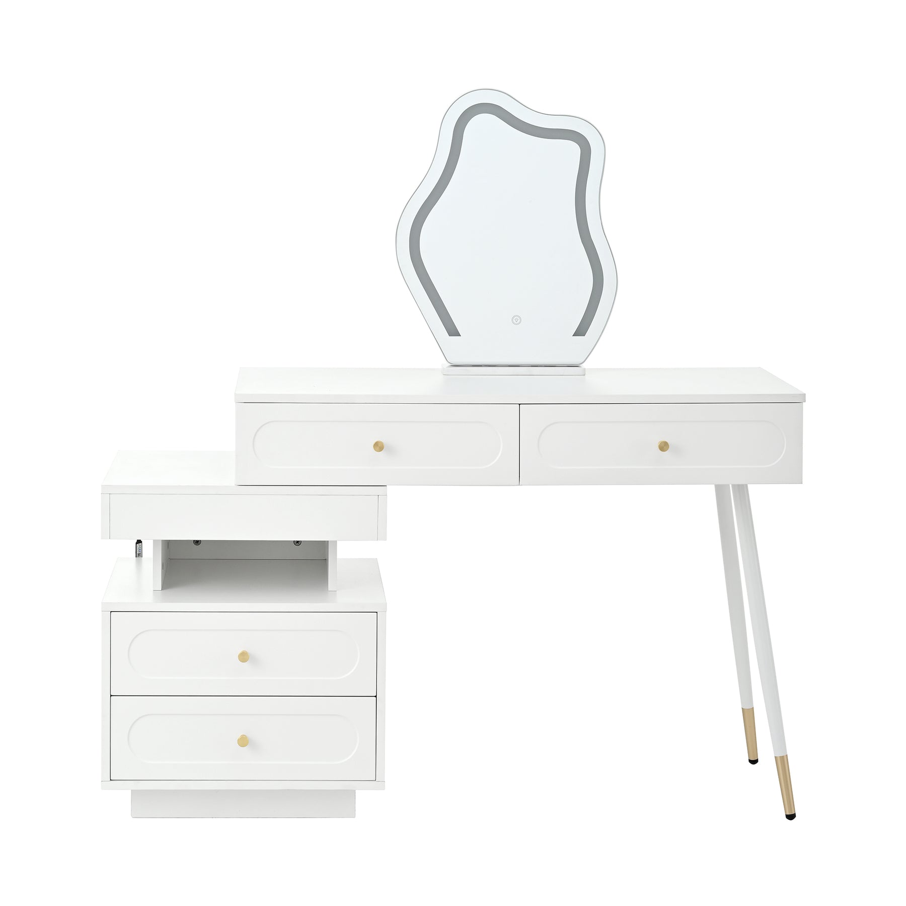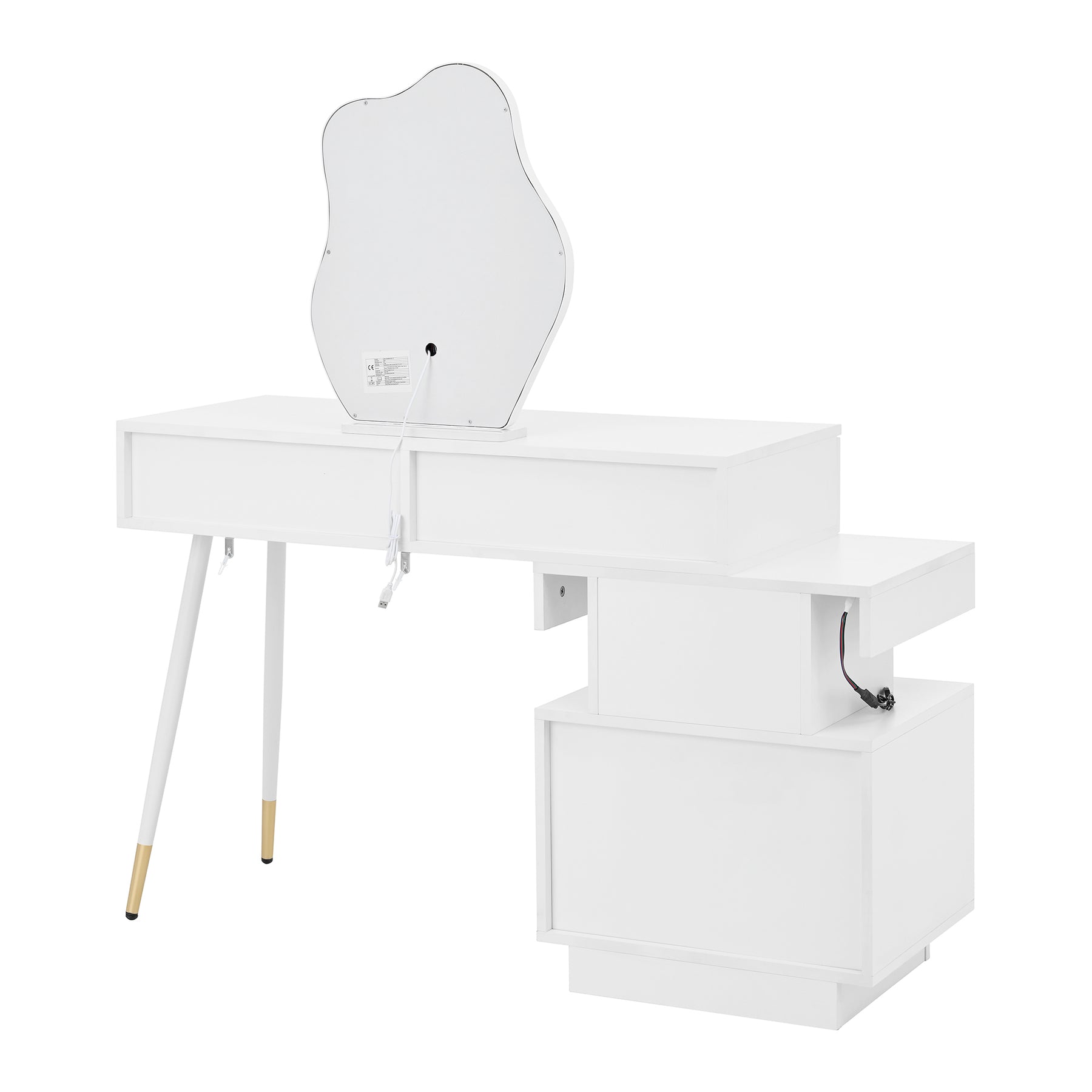 Cette coiffeuse incarne l'élégance et la modernité avec son design blanc épuré et ses accents dorés délicats. Elle est équipée d'un miroir LED au design unique avec 3 niveaux de luminosité réglables par simple toucher, créant l'atmosphère d'éclairage idéale pour le maquillage. Avec quatre tiroirs spacieux et une table de chevet latérale (qui semble avoir un compartiment lumineux), elle offre un espace de rangement substantiel et organisé. Fabriquée à partir de panneaux de particules écologiques et dotée de dispositifs de sécurité anti-basculement, cette coiffeuse offre à la fois stabilité, durabilité et flexibilité, car la position du meuble latéral peut être ajustée selon vos besoins.