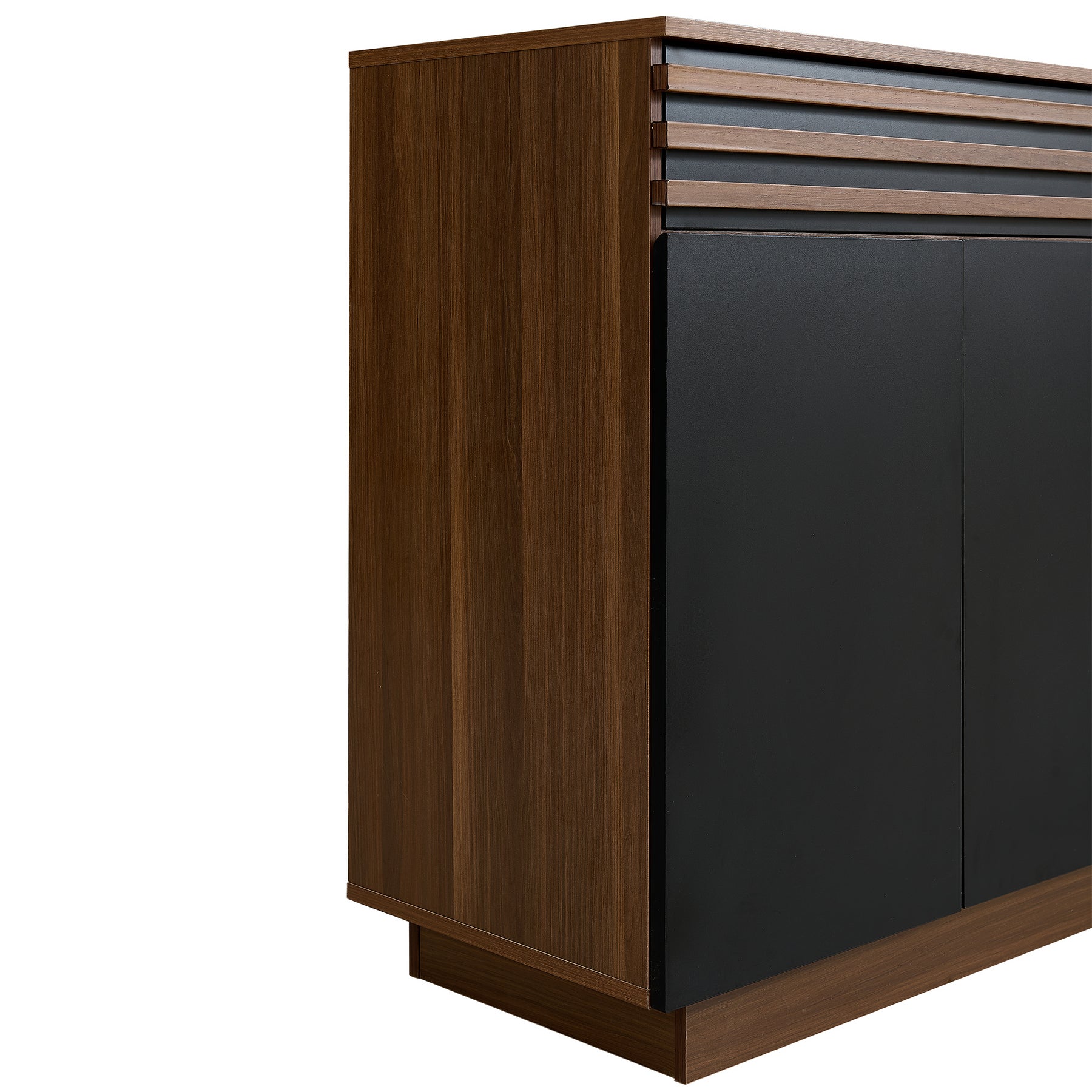 Optez pour un rangement sophistiqué et fonctionnel avec ce buffet au design moderne et audacieux. Le contraste frappant entre la finition bois noyer chaleureuse et les façades noires élégantes confère à ce meuble une présence contemporaine et haut de gamme. Sa conception astucieuse intègre quatre portes d'armoire offrant un vaste espace de rangement dissimulé, ainsi que deux tiroirs logés discrètement sous un panneau à lattes décoratives qui ajoute une texture distinctive. Que ce soit dans votre salle à manger pour la vaisselle ou dans votre salon pour les accessoires, ce buffet est une solution polyvalente qui allie style, robustesse et grande capacité.