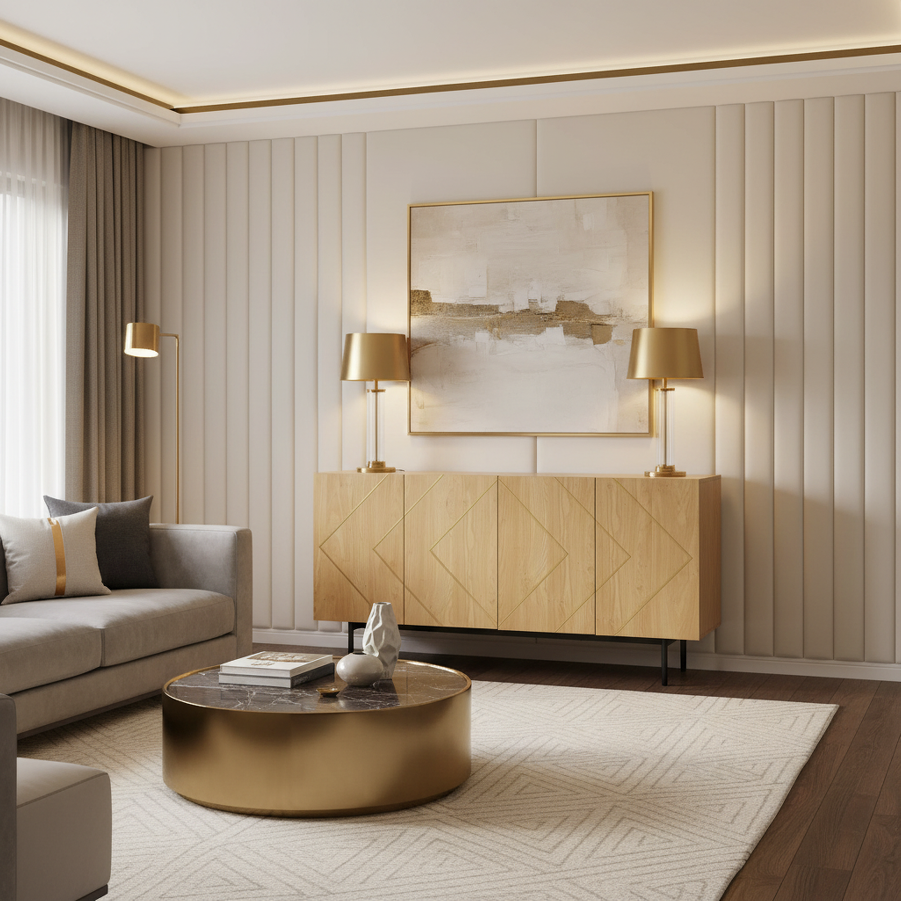 Faites entrer le luxe et l'élégance du style Art Déco dans votre salon ou salle à manger avec ce buffet audacieux. Le revêtement aspect bois est magnifiquement rehaussé par des motifs géométriques dorés incrustés sur les quatre façades, donnant au meuble une note de designer unique. Son design sans poignée met l'accent sur la pureté des lignes, tandis que les quatre portes s'ouvrent sur un espace de rangement généreux doté d'étagères ajustables pour une organisation flexible. Monté sur des pieds surélevés de , il apporte une légèreté visuelle, protège de l'humidité et facilite grandement le passage de votre robot aspirateur.