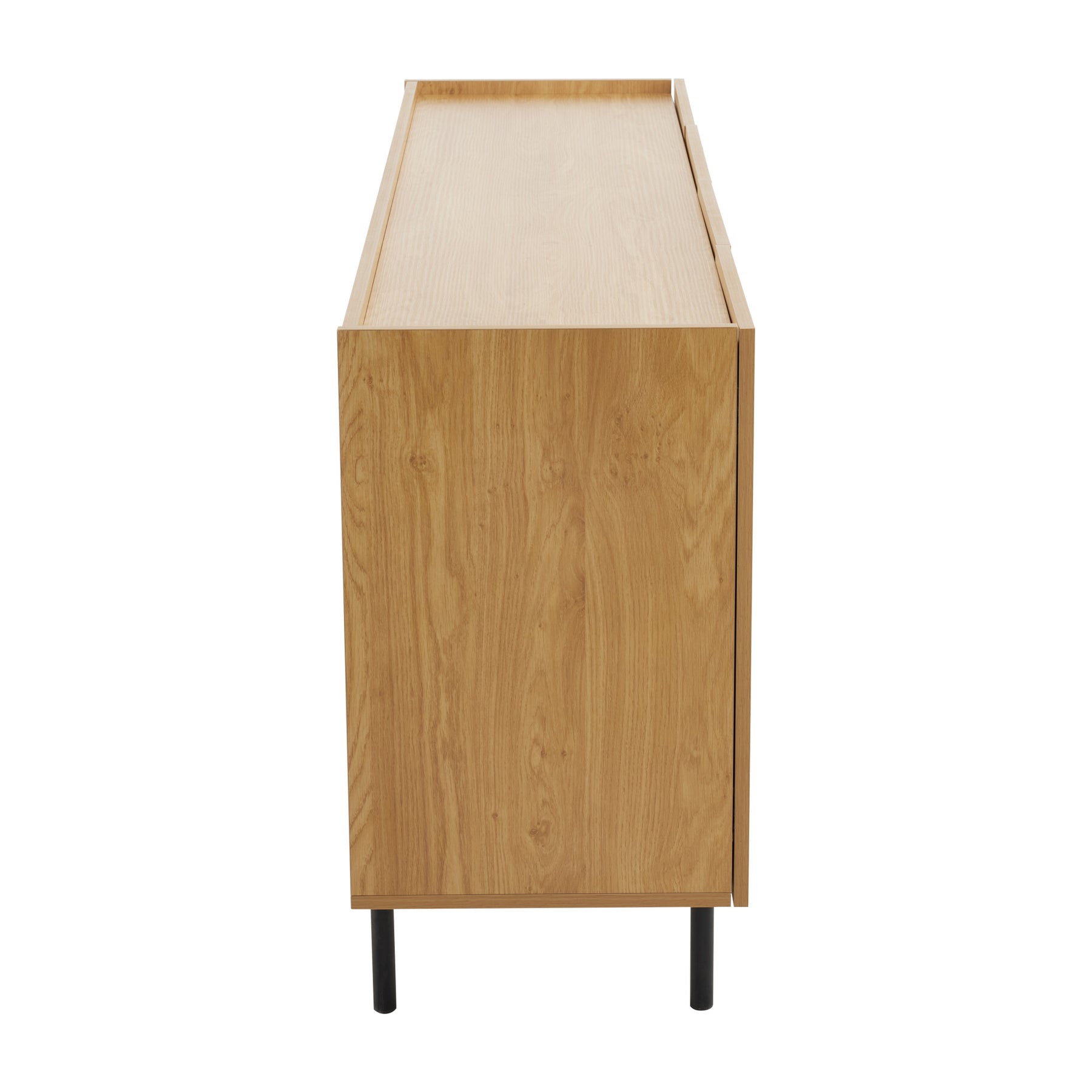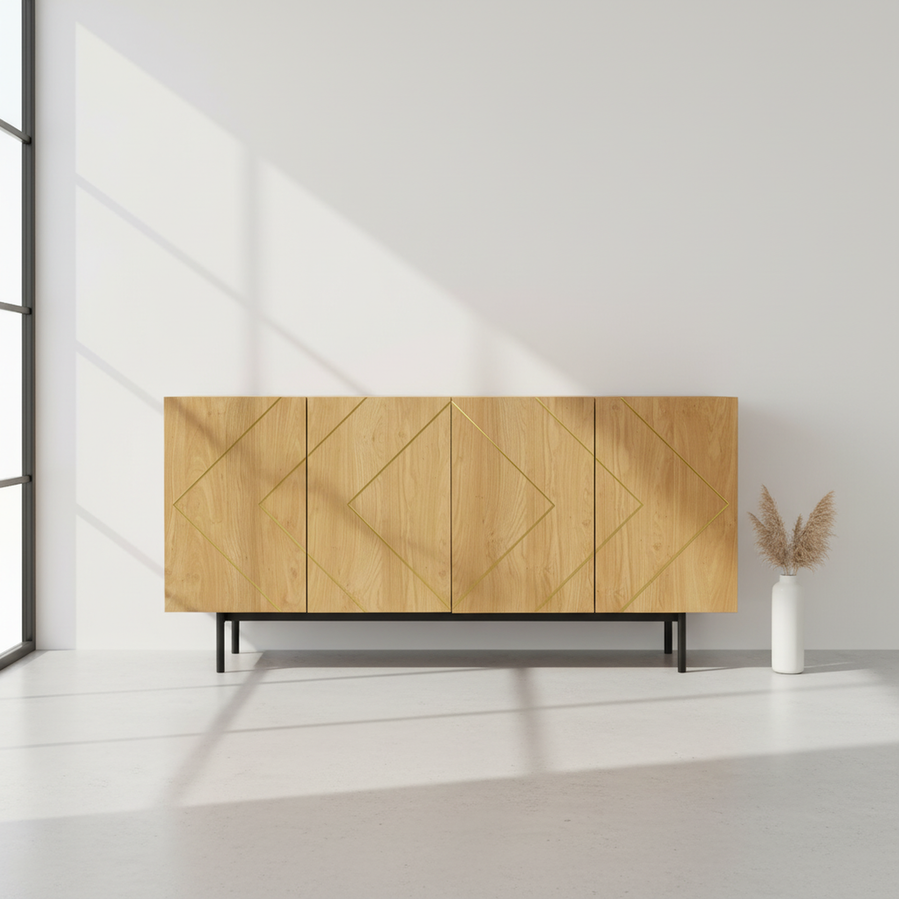 Buffet effet bois motif géométrique linges dorés 4 portes pieds noirs surélevés COLS