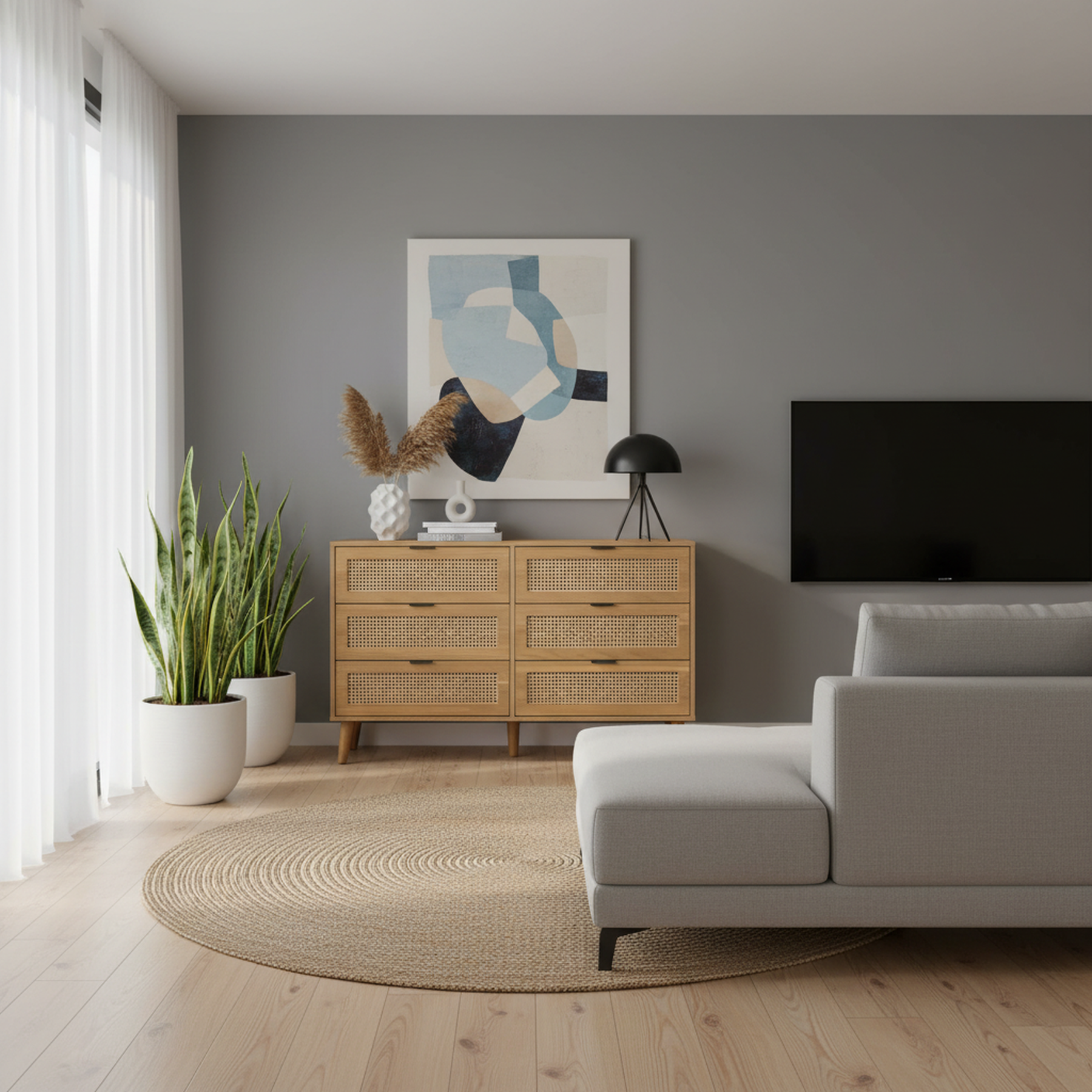 Laissez-vous charmer par l'élégance intemporelle de cette commode au design rétro scandinave. Le mariage harmonieux de la finition aspect bois foncé et des six façades de tiroirs en rotin tressé confère à ce meuble une allure chic et chaleureuse. Au-delà de son esthétique raffinée, elle excelle par sa fonctionnalité : ses six tiroirs spacieux vous offrent un vaste espace pour organiser méticuleusement vos vêtements, accessoires ou linge de maison. Reposant sur des pieds en bois massif surélevés, elle est conçue pour simplifier le nettoyage quotidien tout en ajoutant une touche décorative exquise à votre chambre, salon ou entrée.