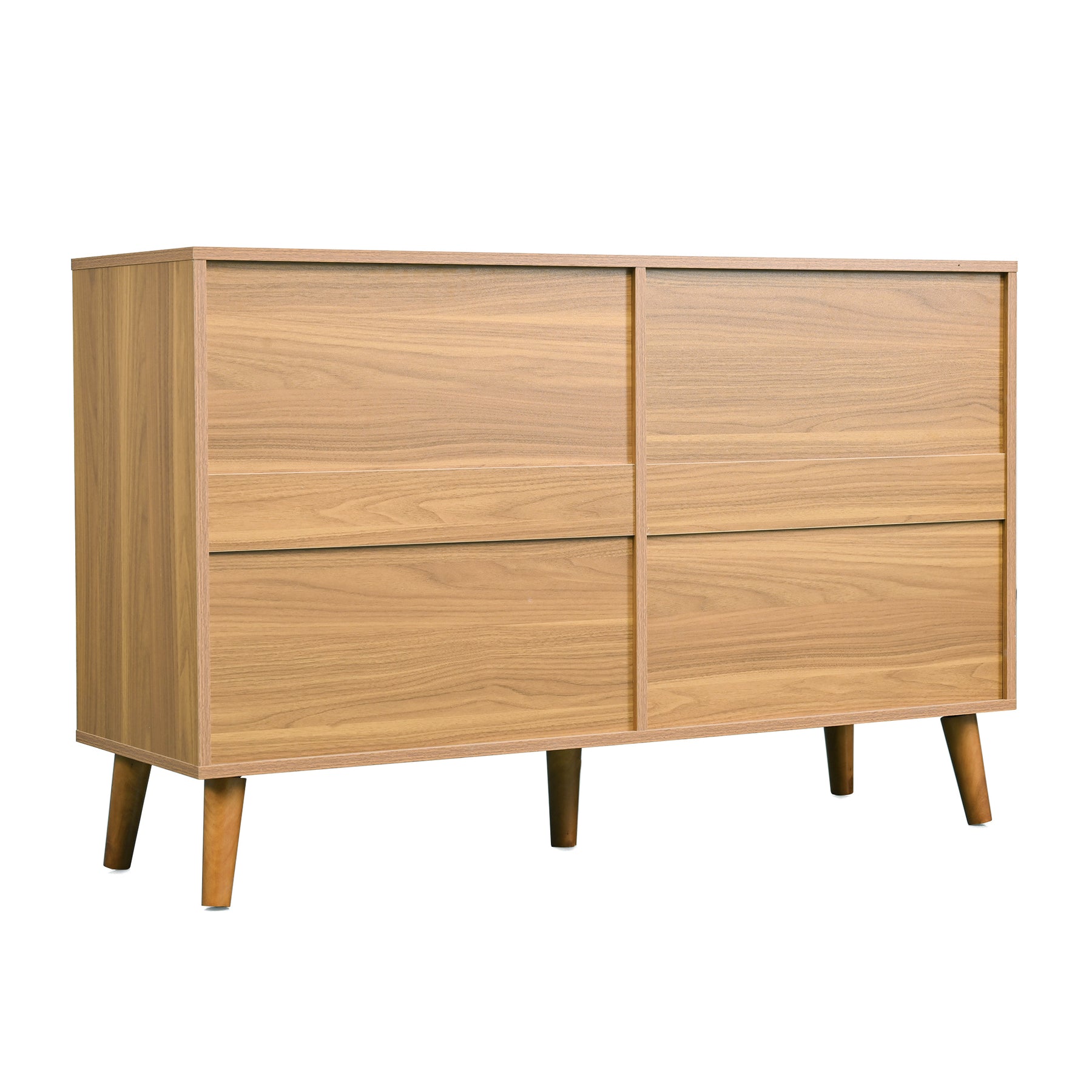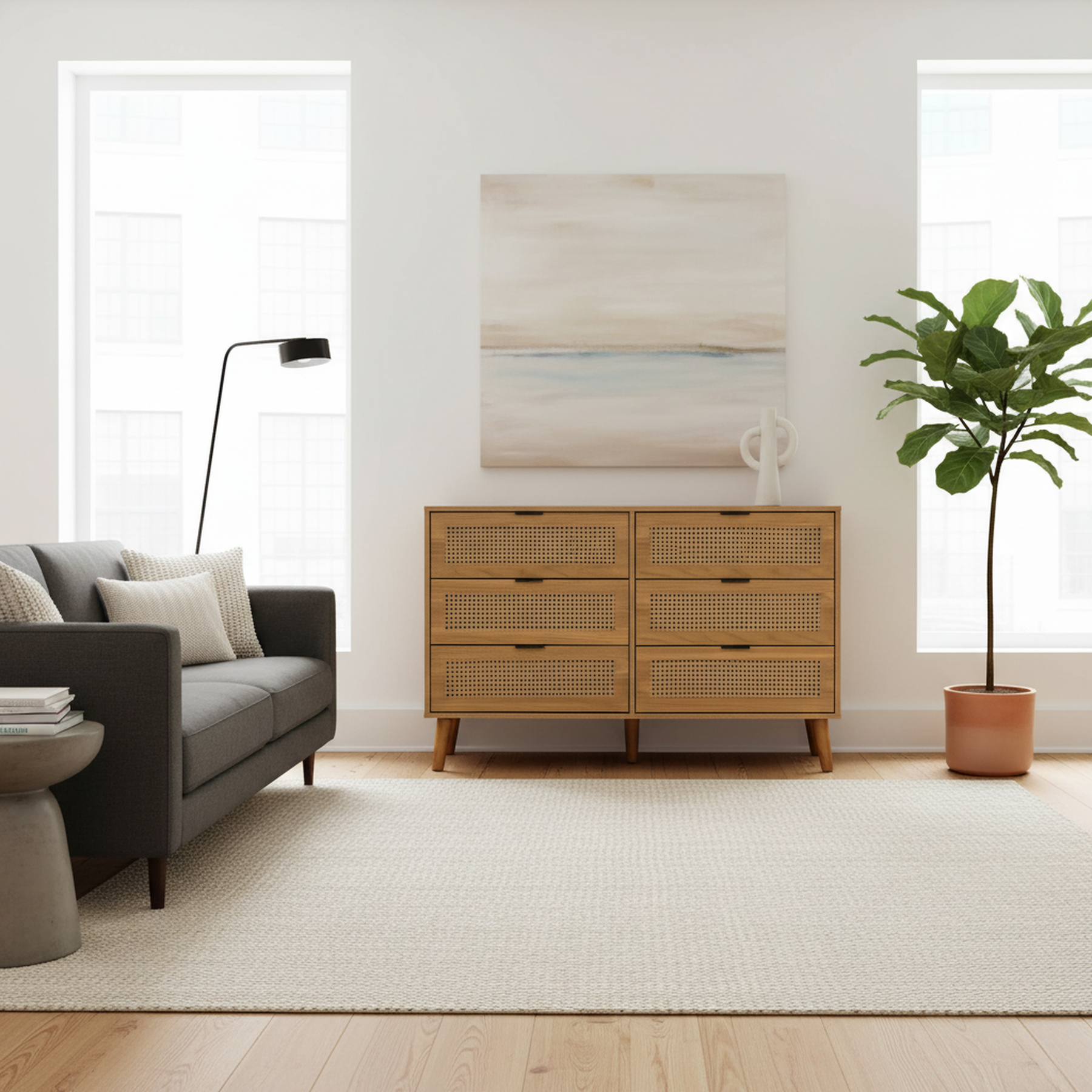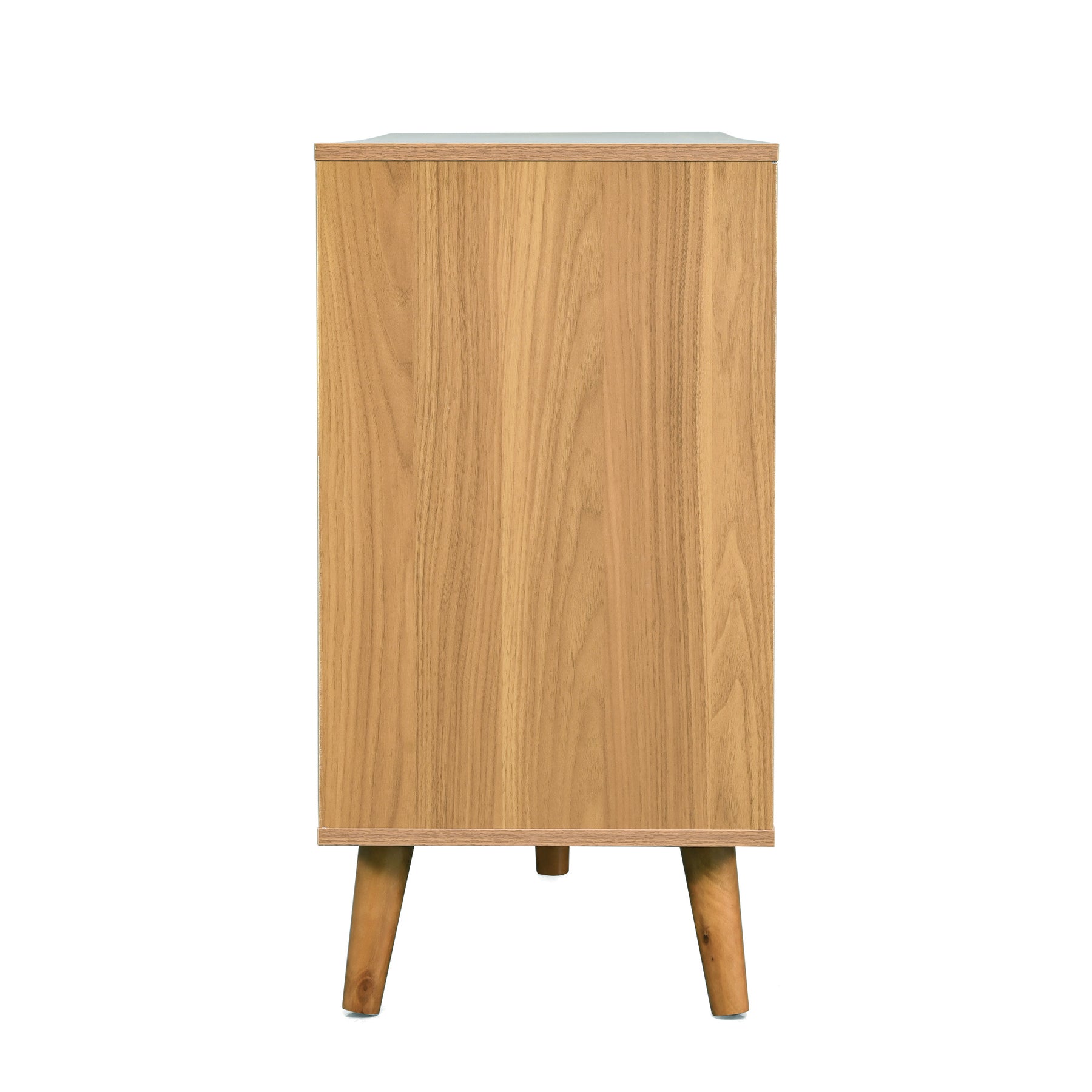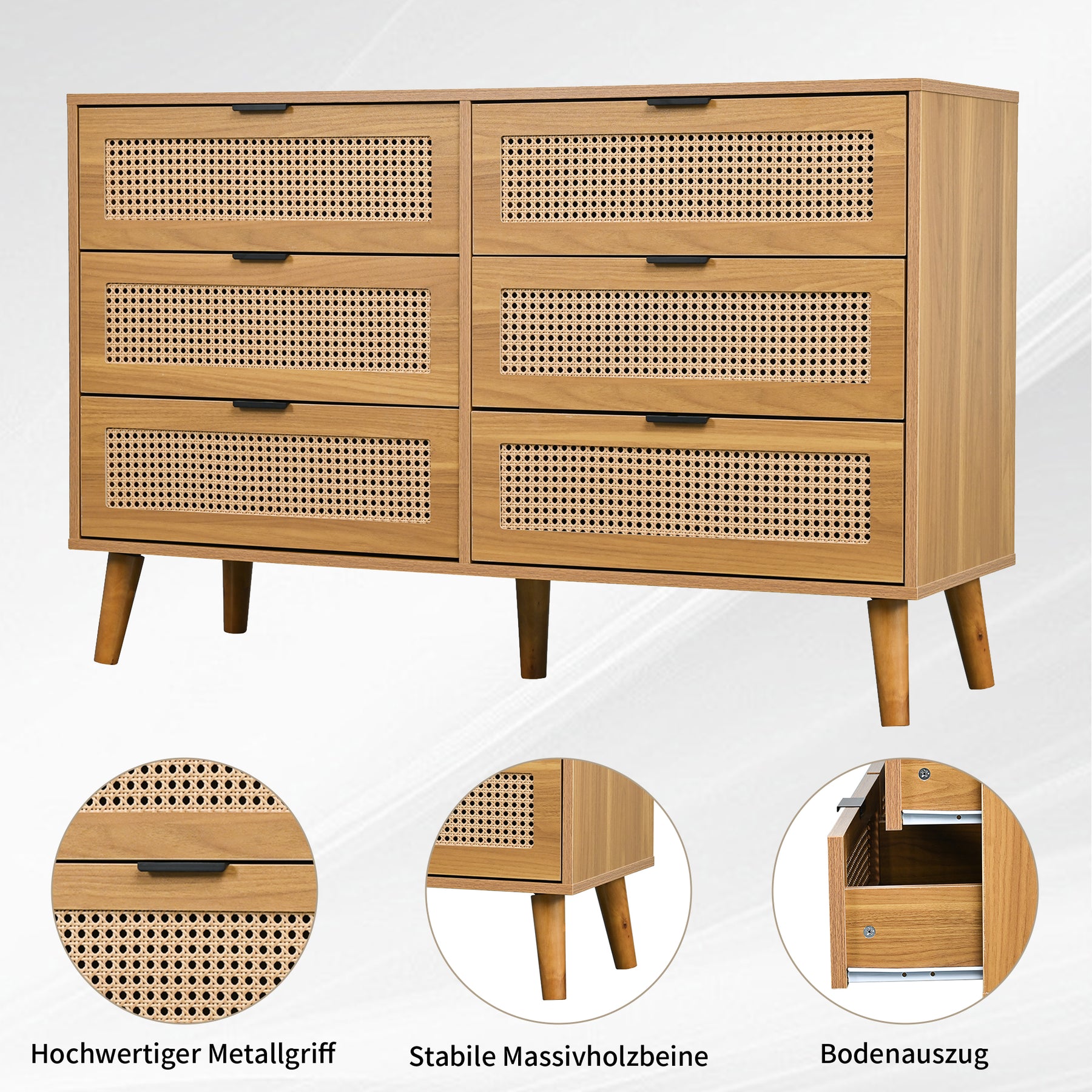 Buffet rétro façade en rotin tressé 6 tiroirs pieds obliques CANDELIL