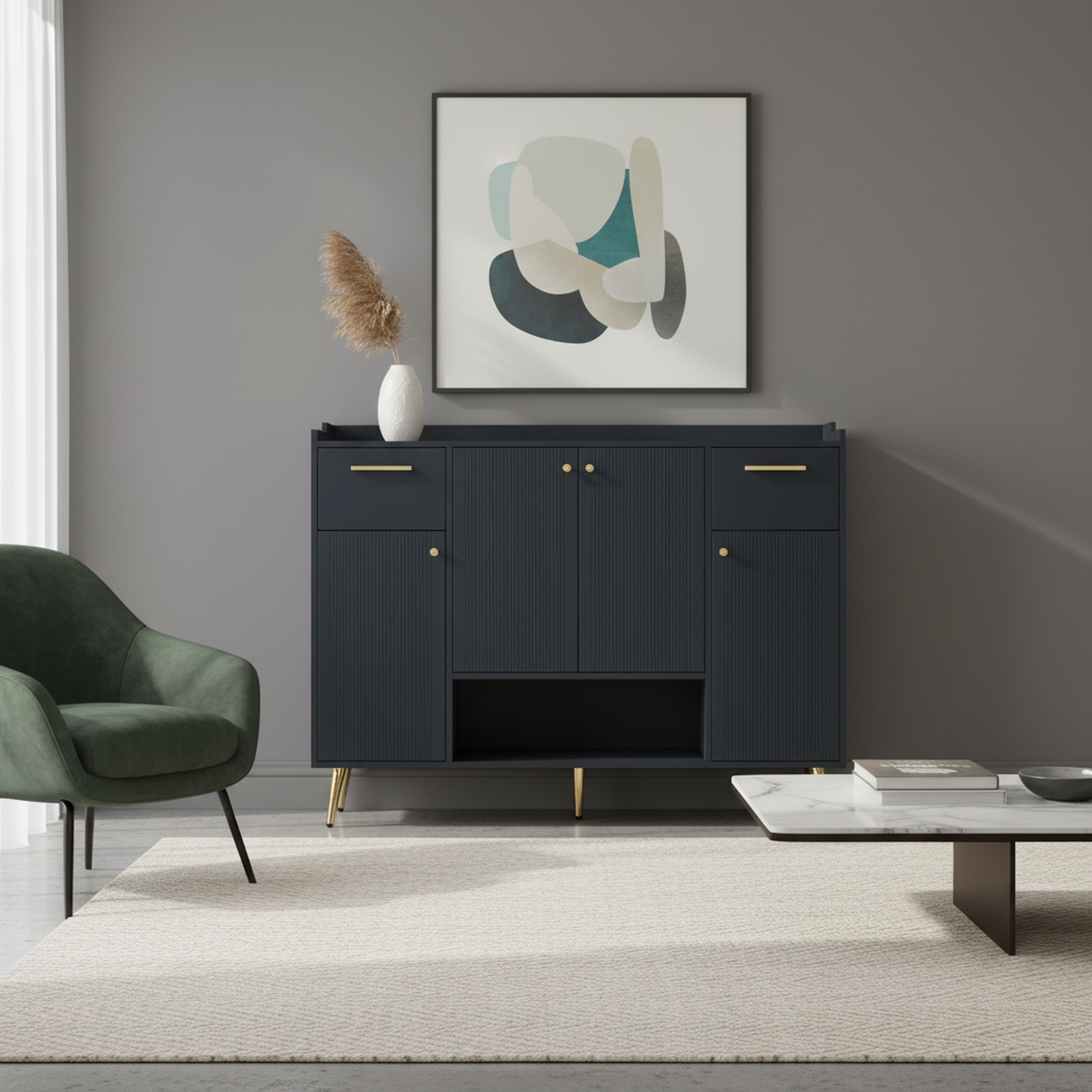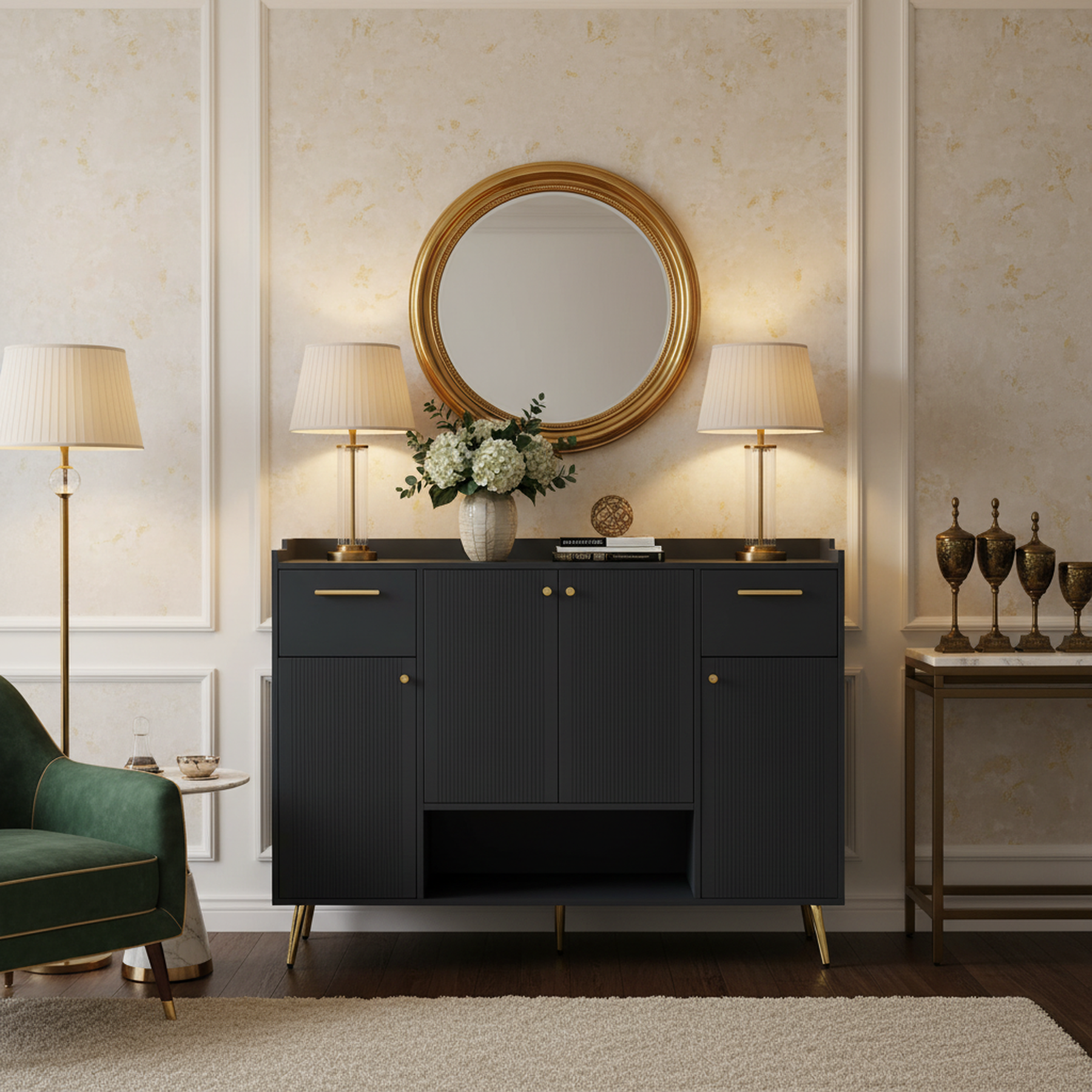 Rangement maximisé et polyvalent : Comprend deux tiroirs spacieux, quatre portes pour une grande capacité de stockage de chaussures, et un compartiment ouvert pour les accessoires ou la décoration.